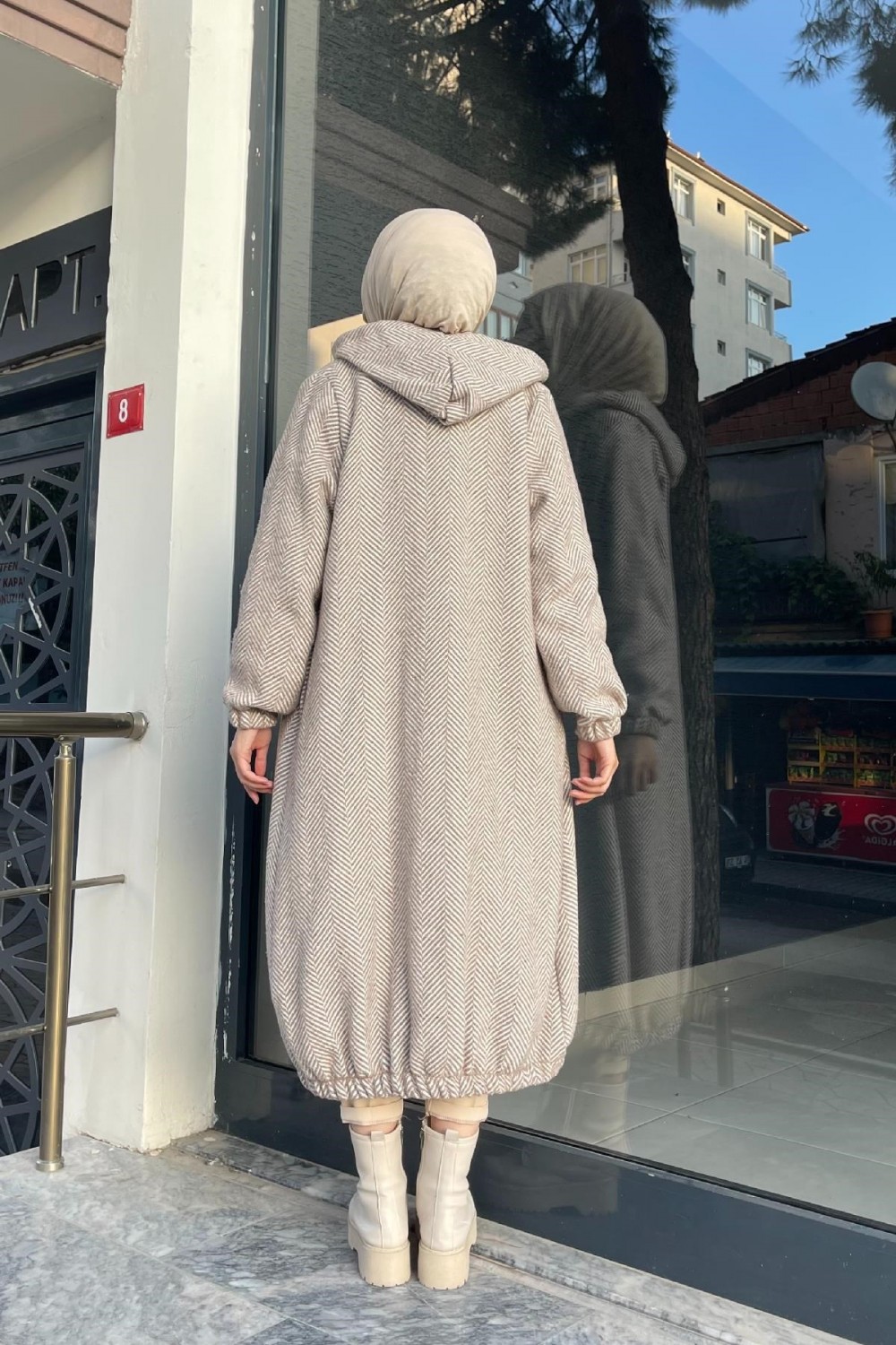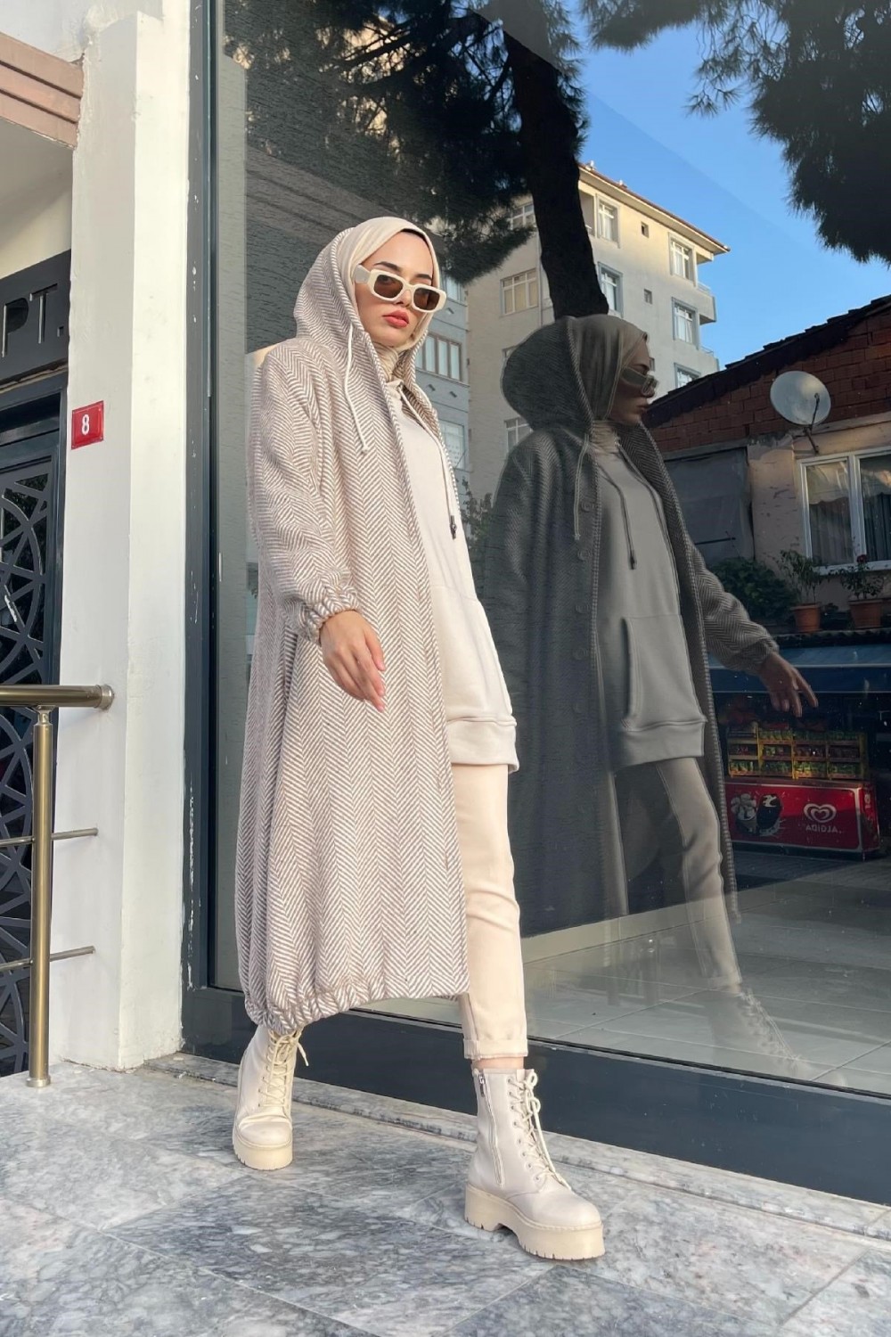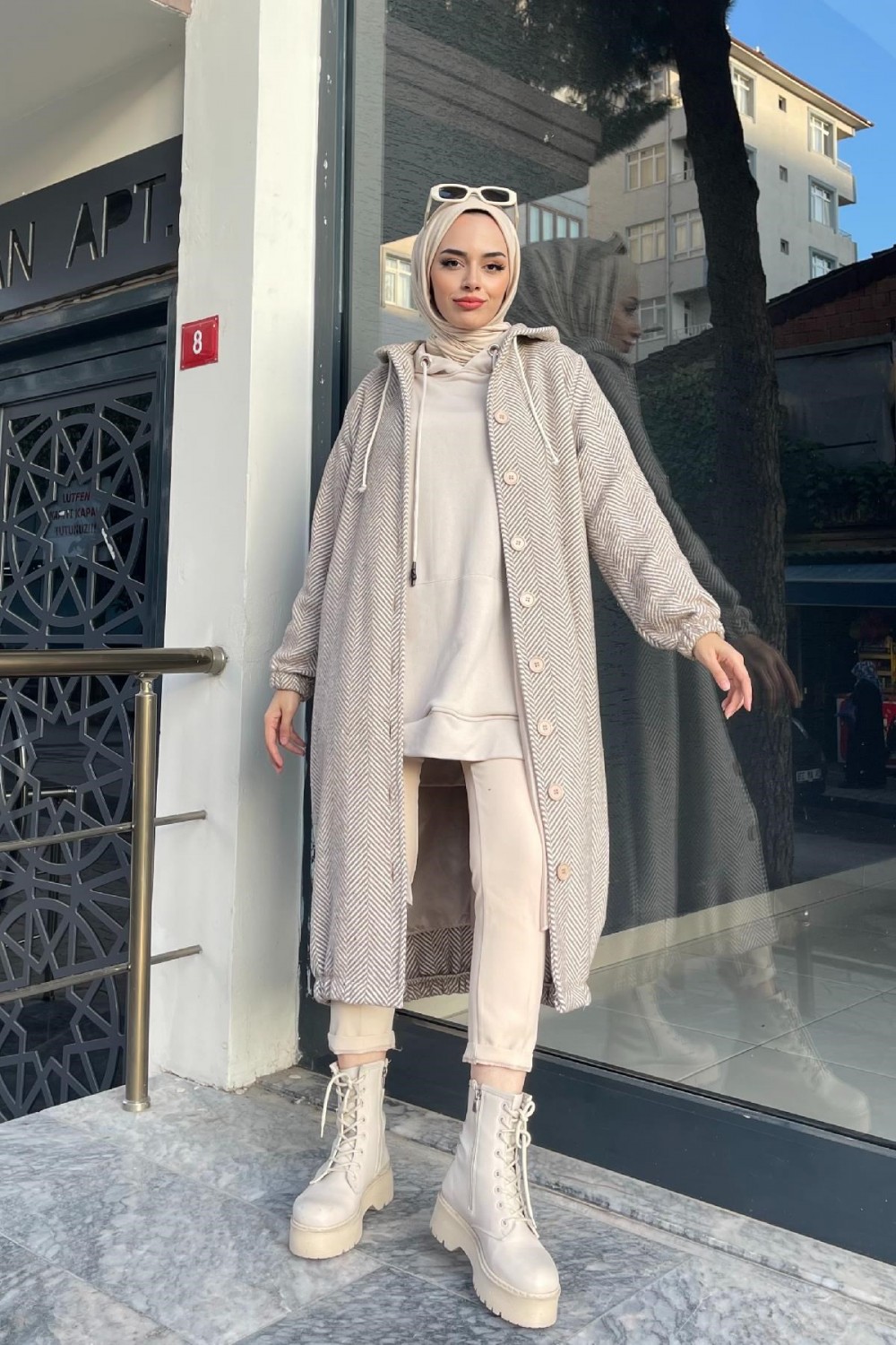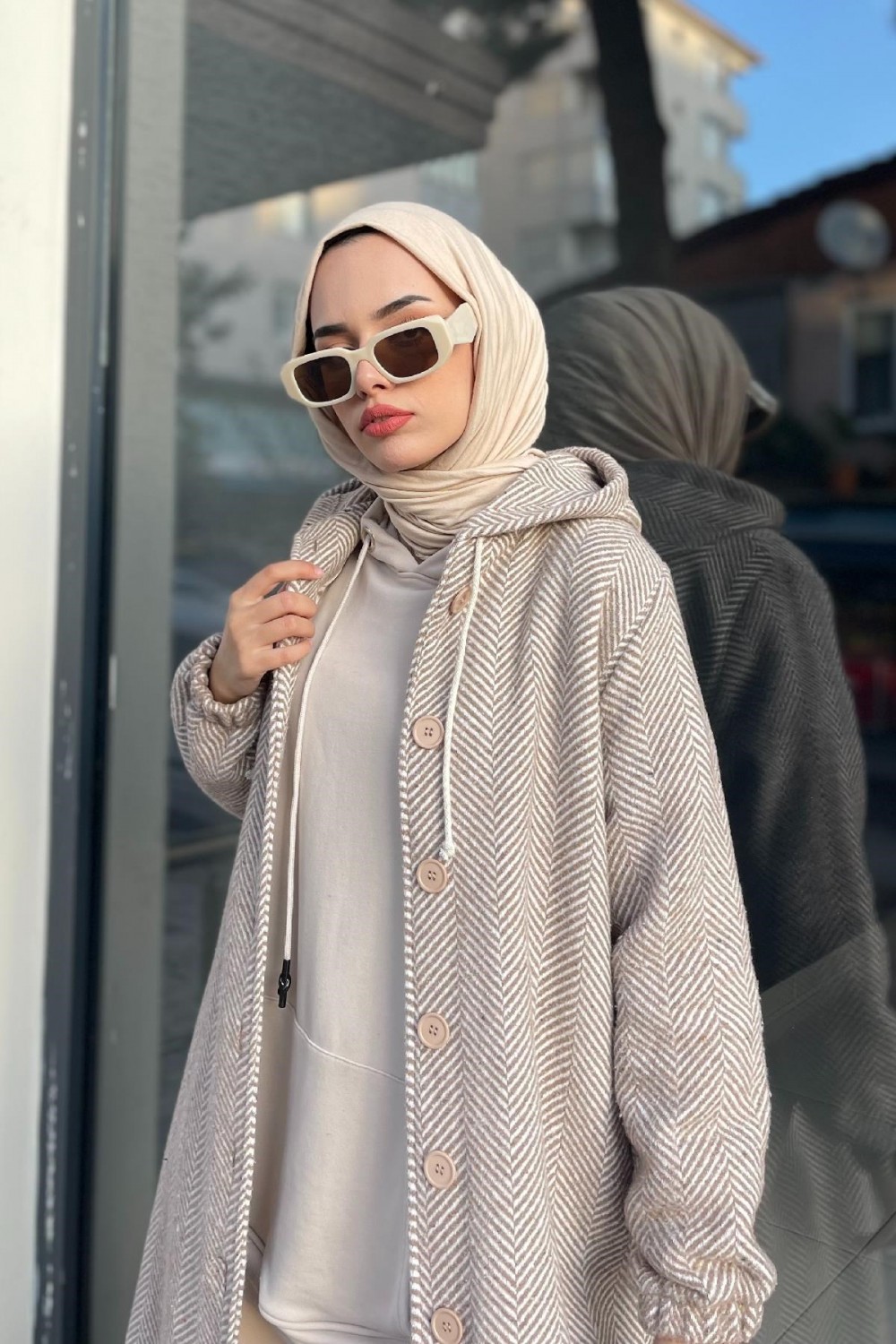Düğmeli Kapşonlu Kap Bej