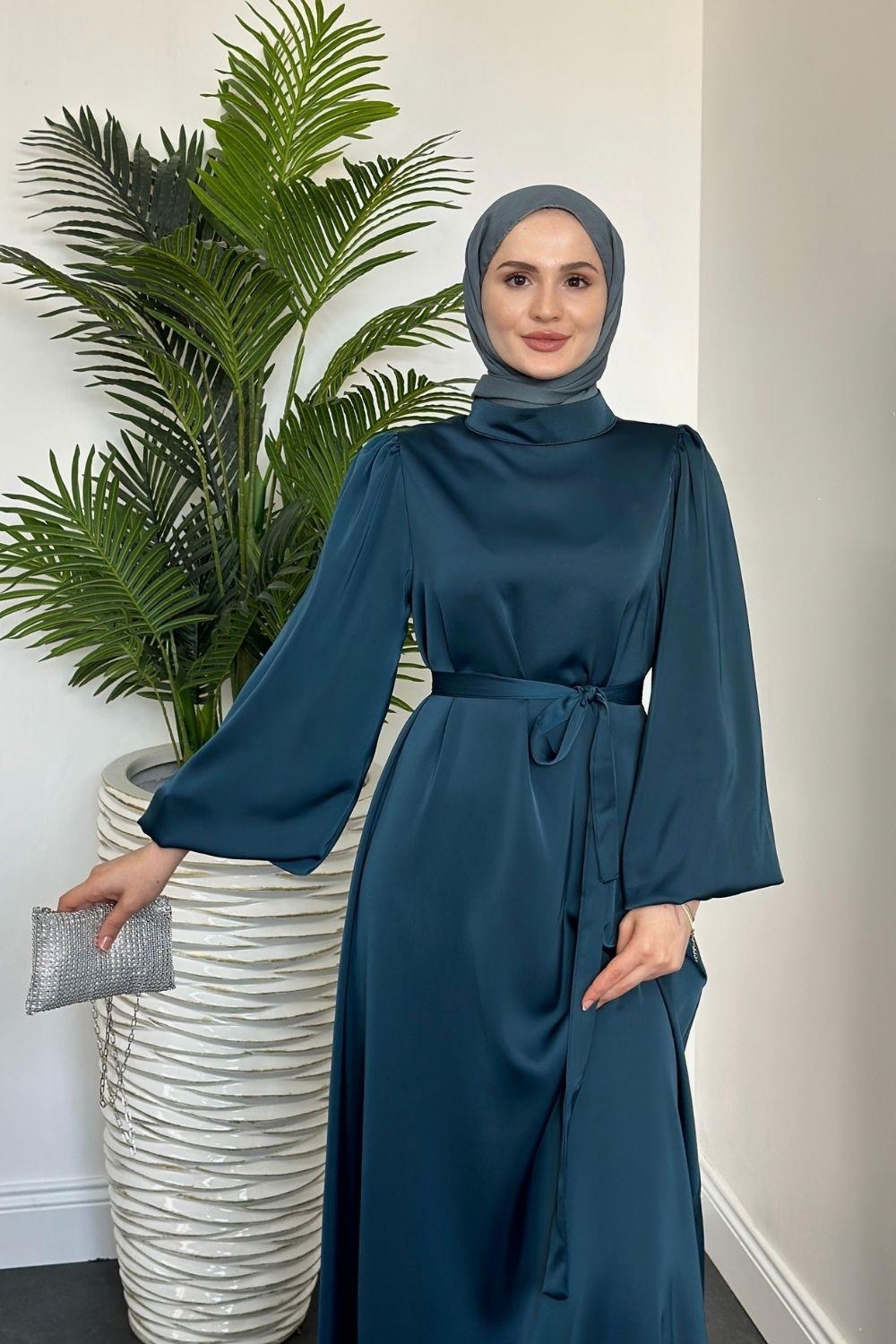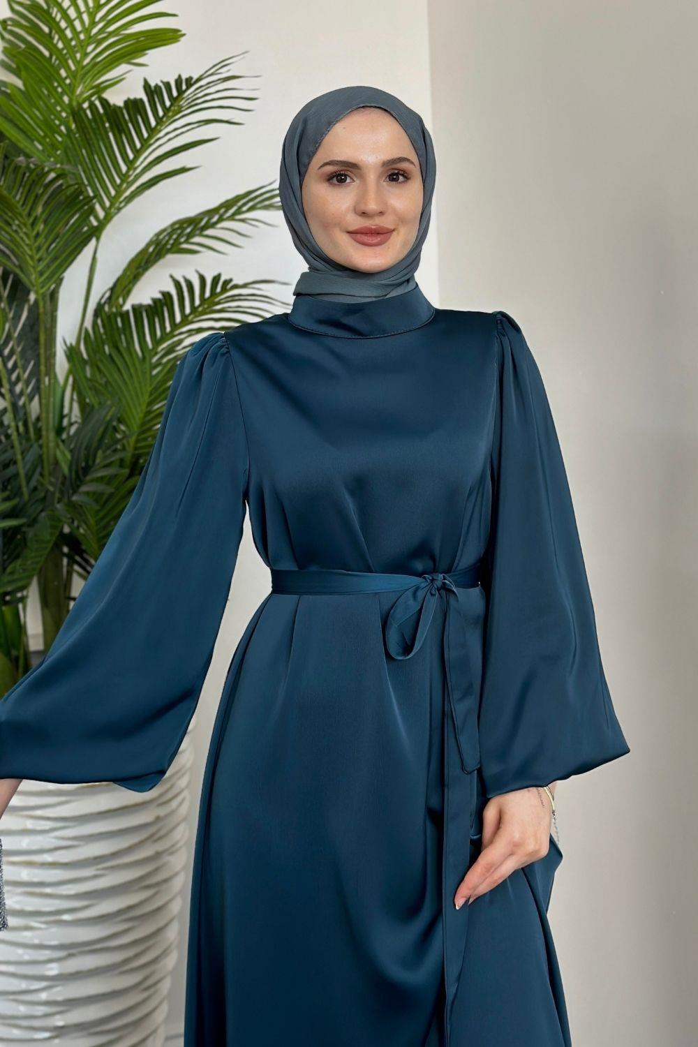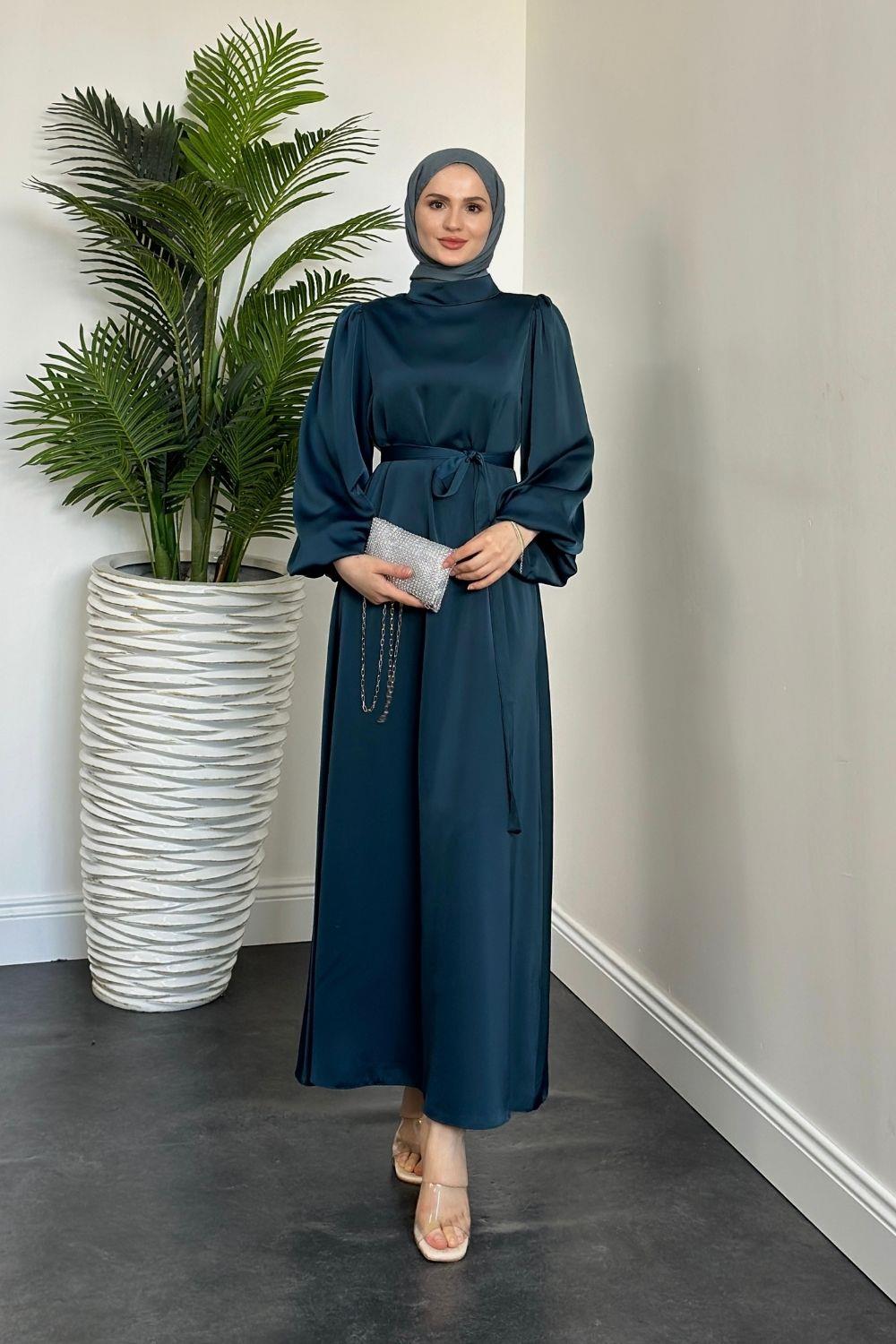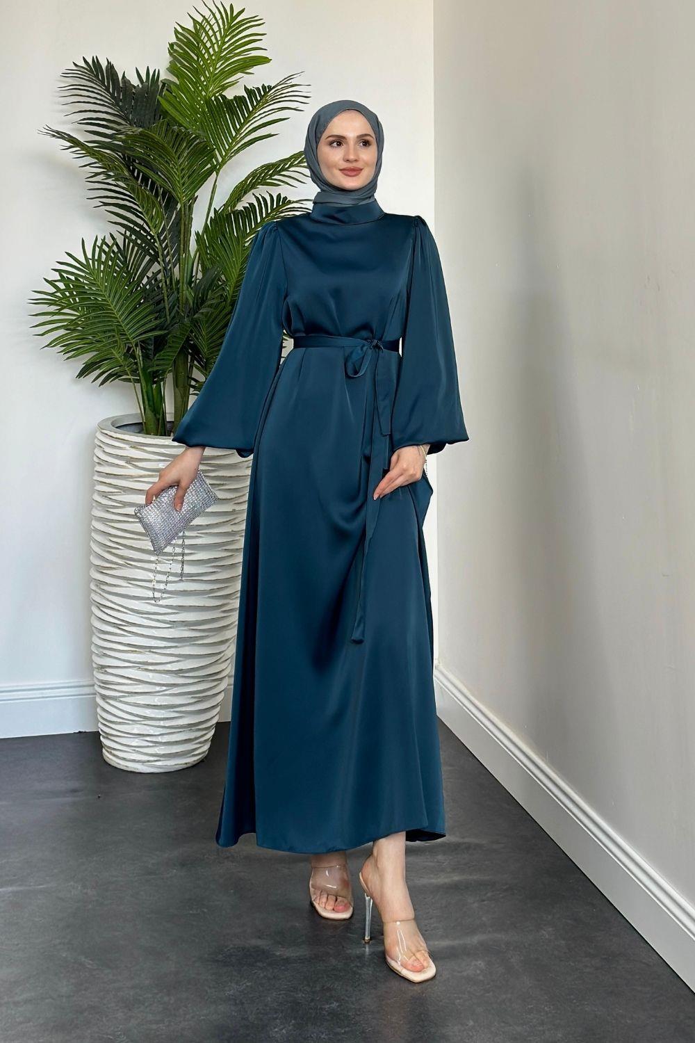 Dimitra Balon Kol Saten Elbise Petrol Yeşili
