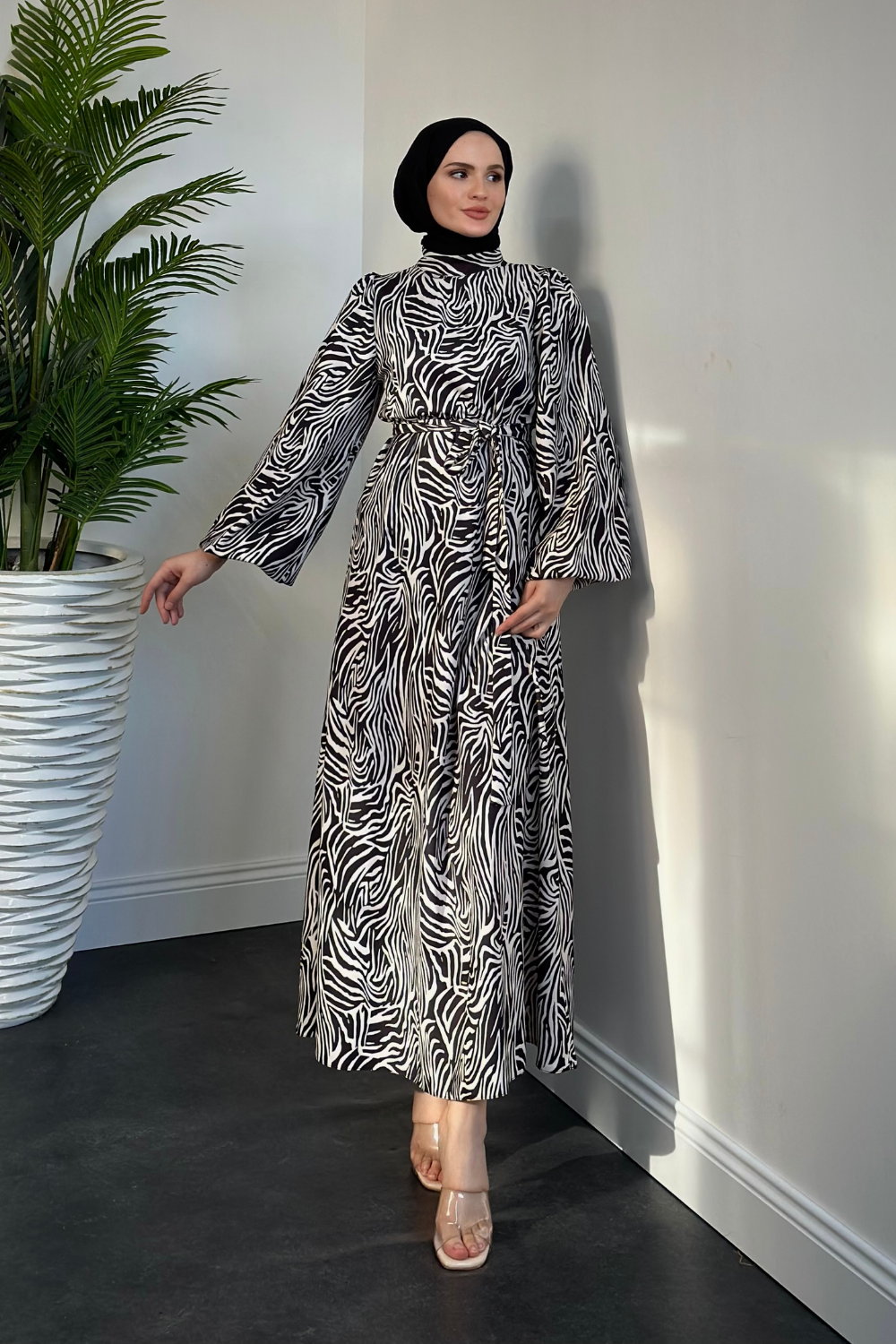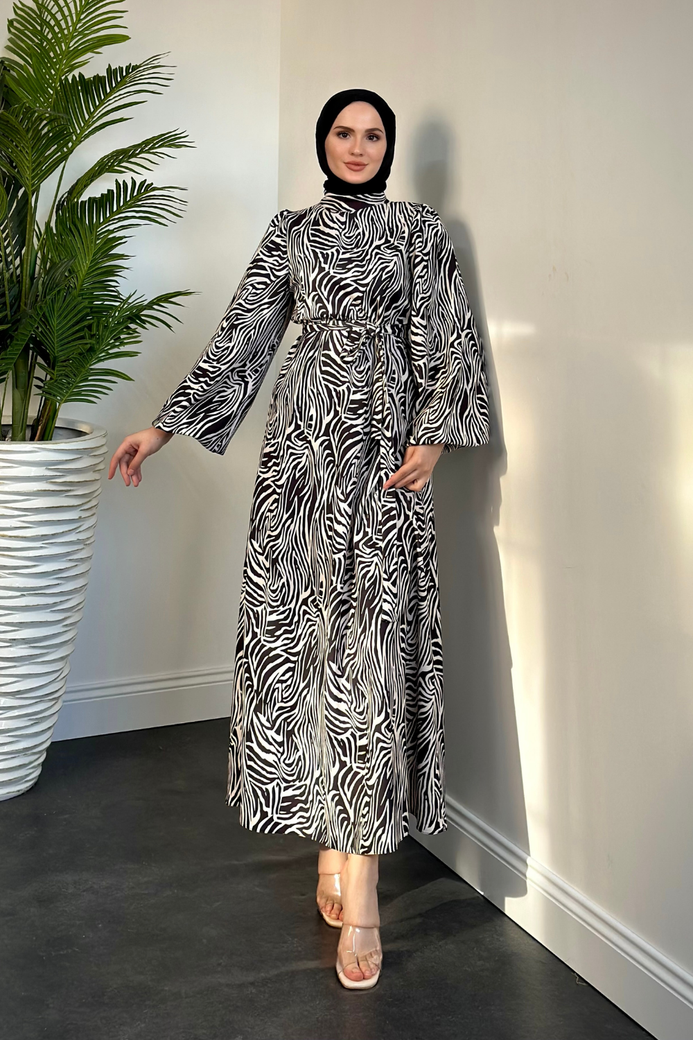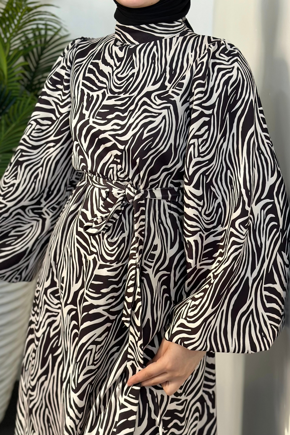 Billy Zebra Desen Balon Kol Elbise Siyah