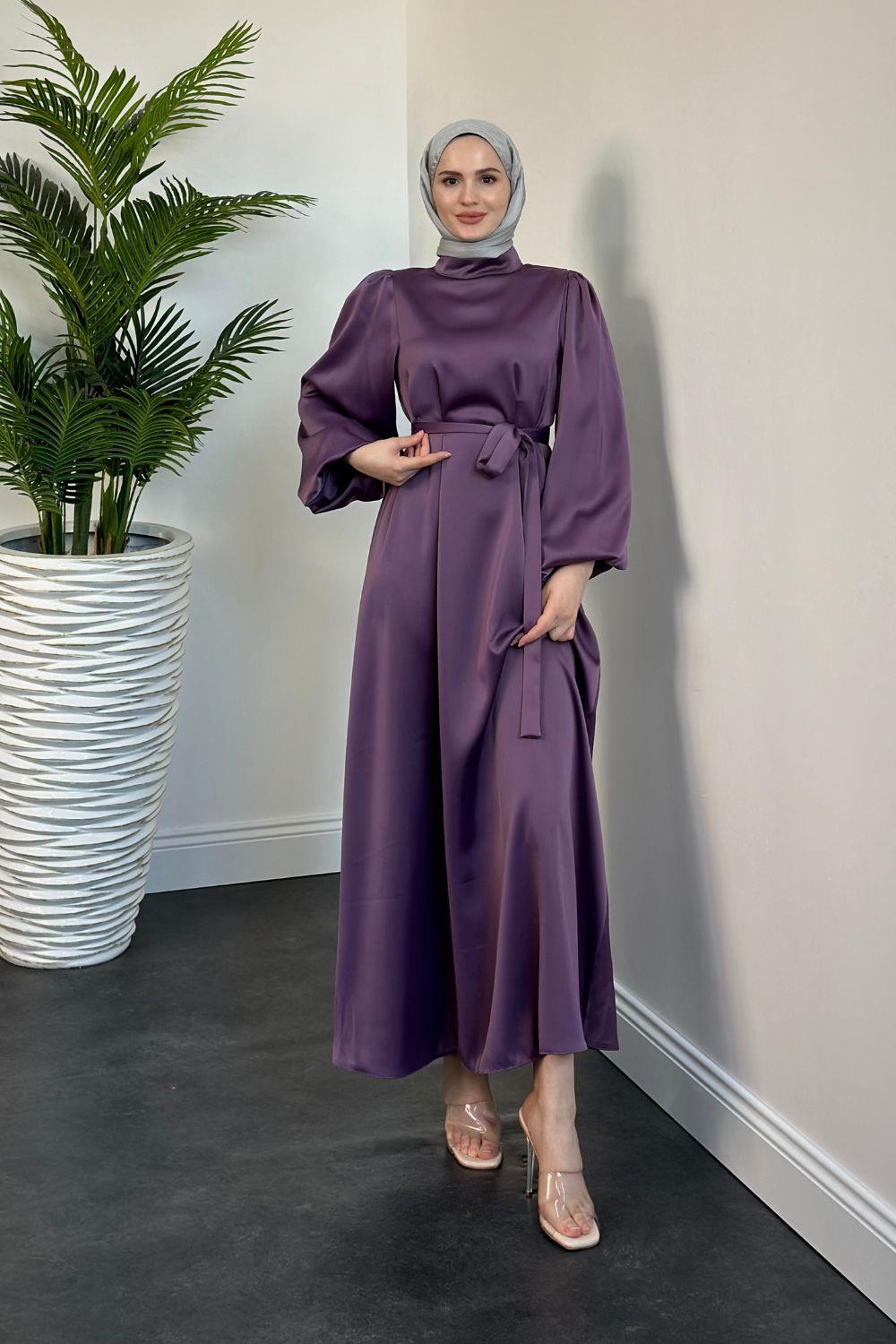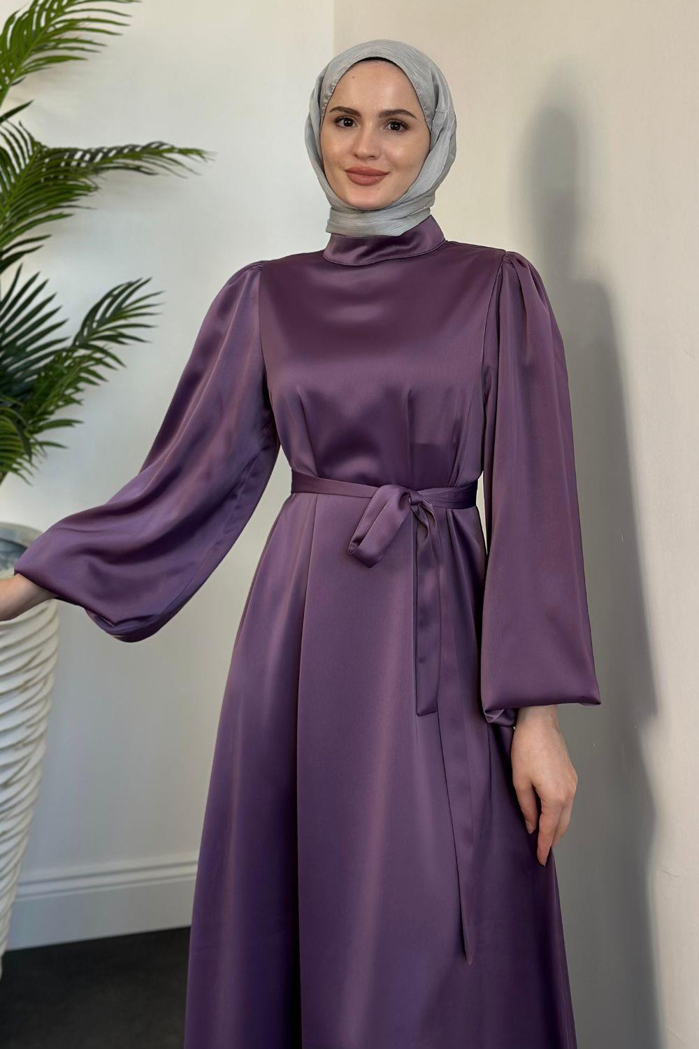 Dimitra Balon Kol Saten Elbise Mor