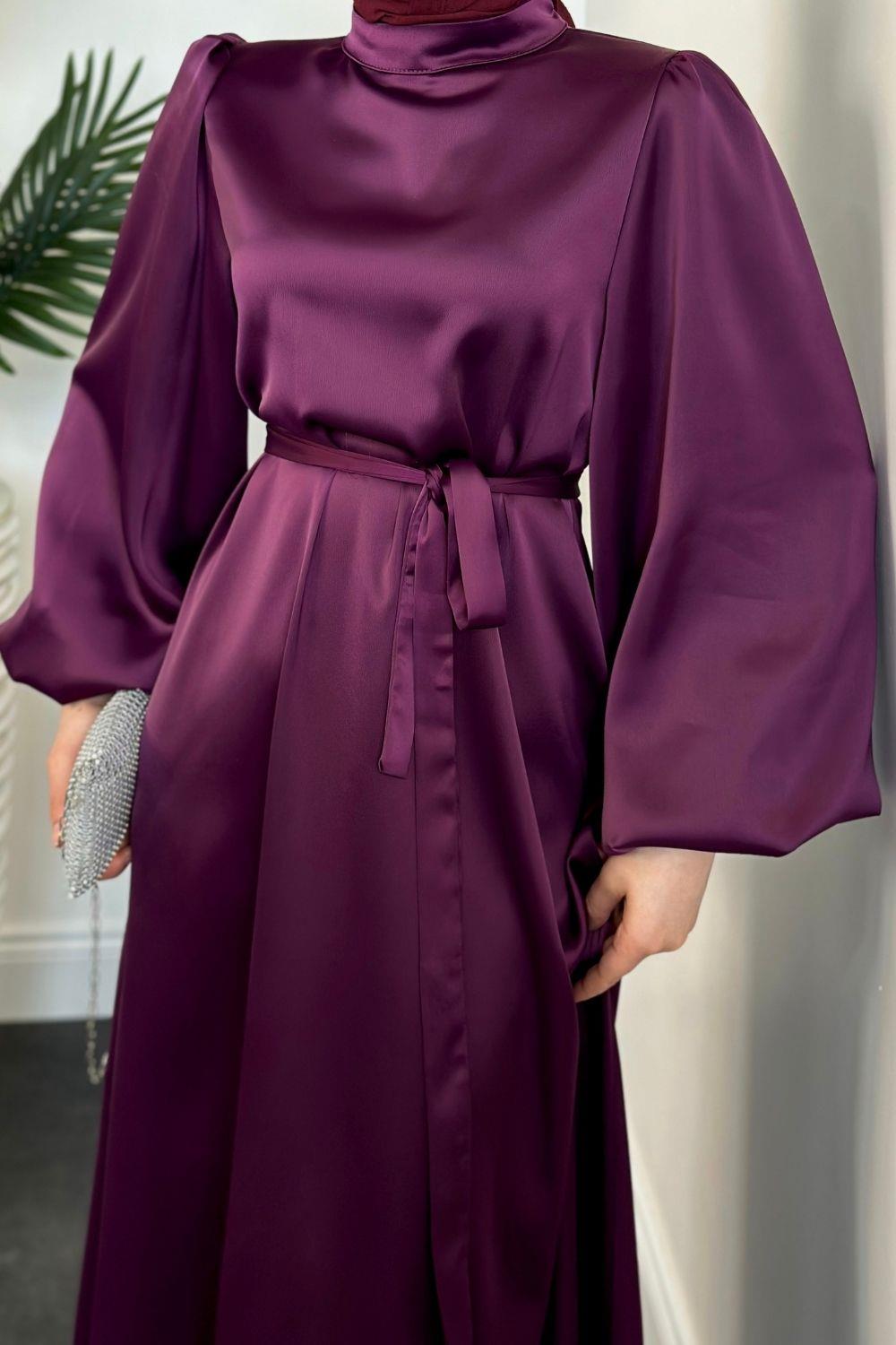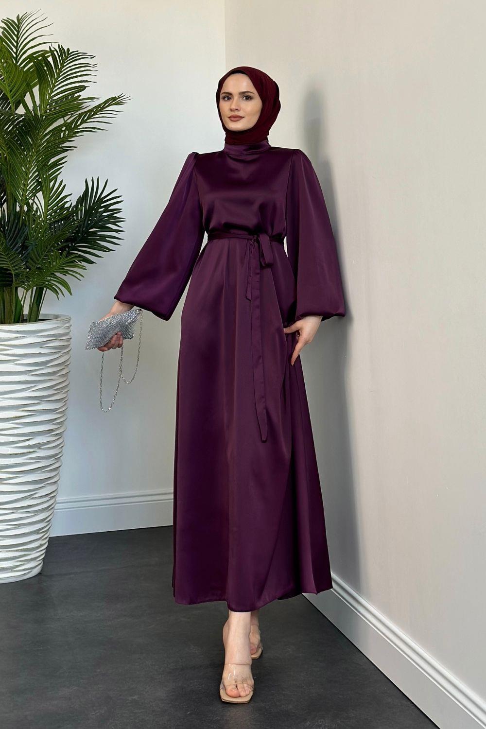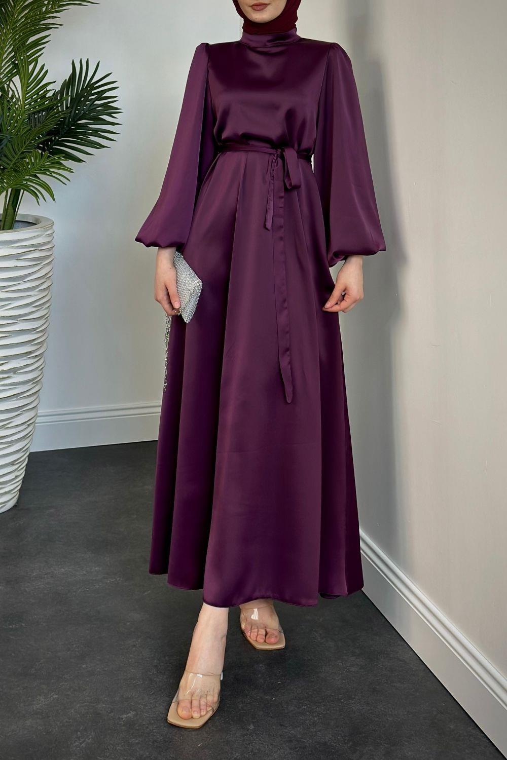 Dimitra Balon Kol Saten Elbise Mürdüm