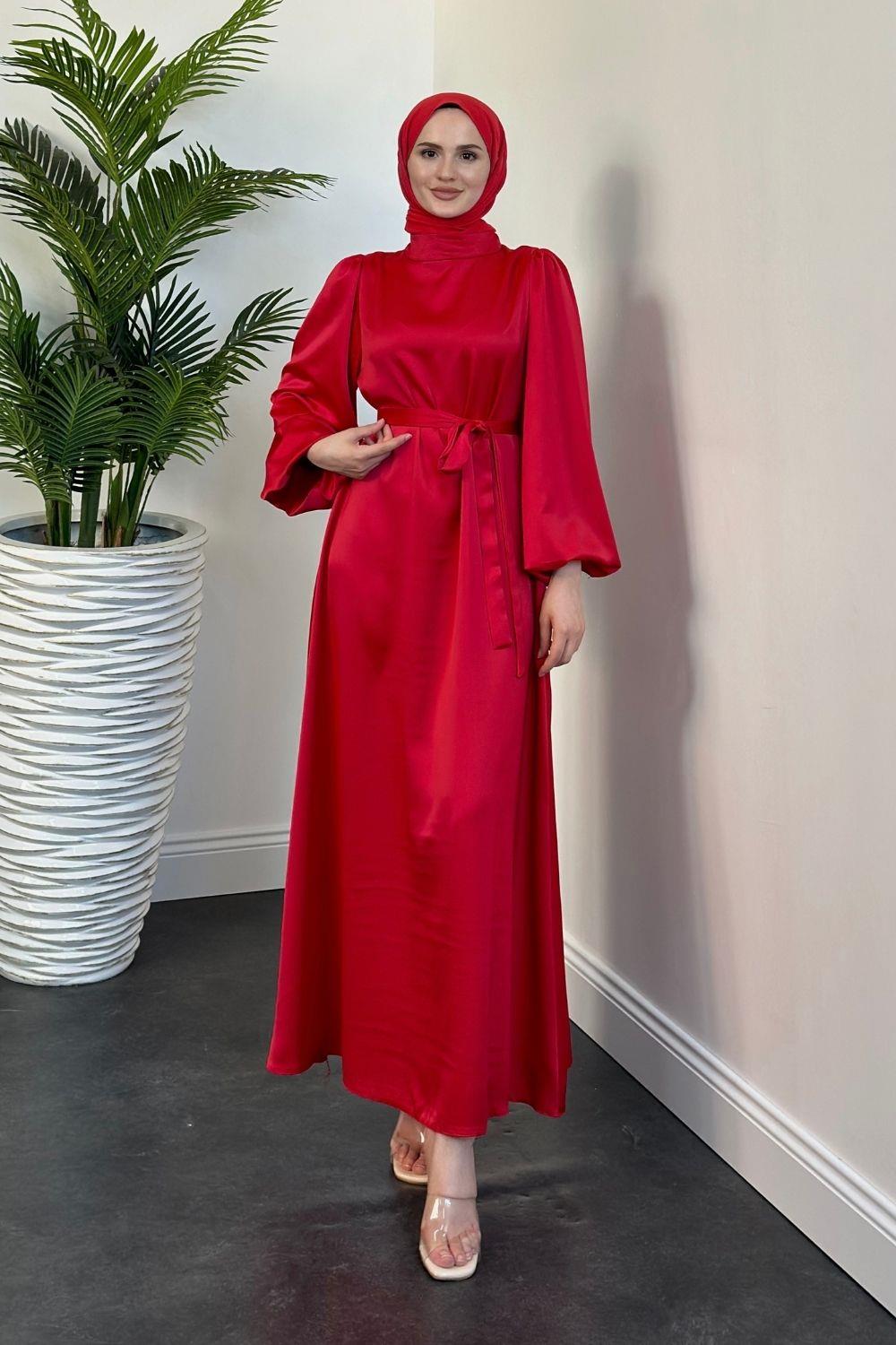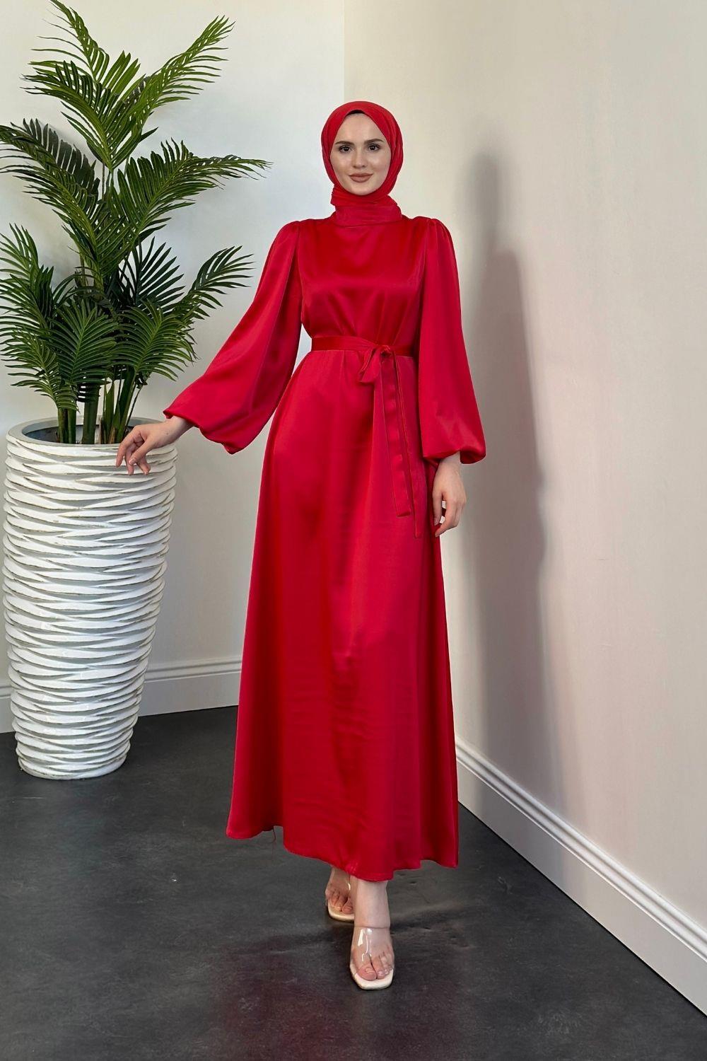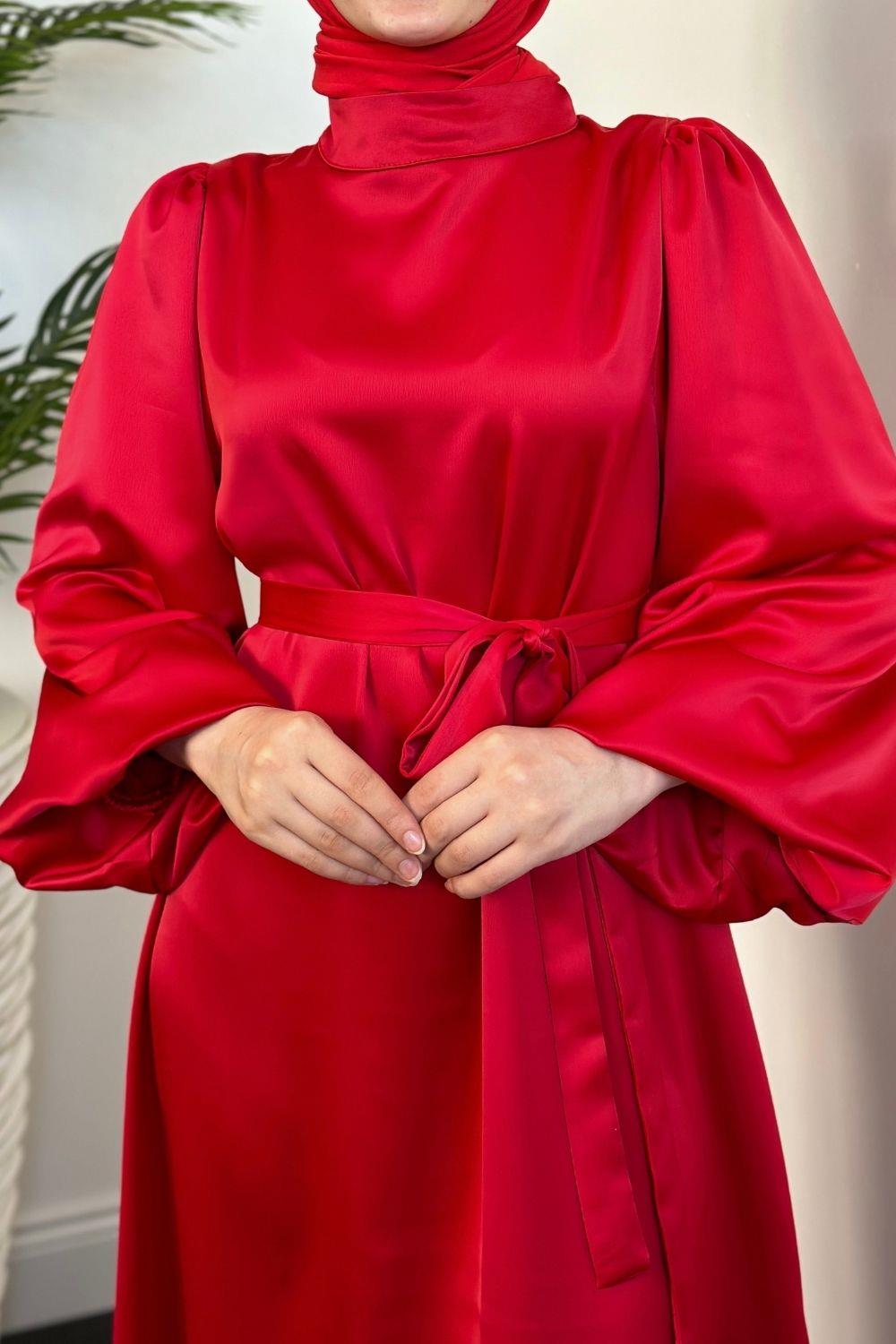 Dimitra Balon Kol Saten Elbise Kırmızı