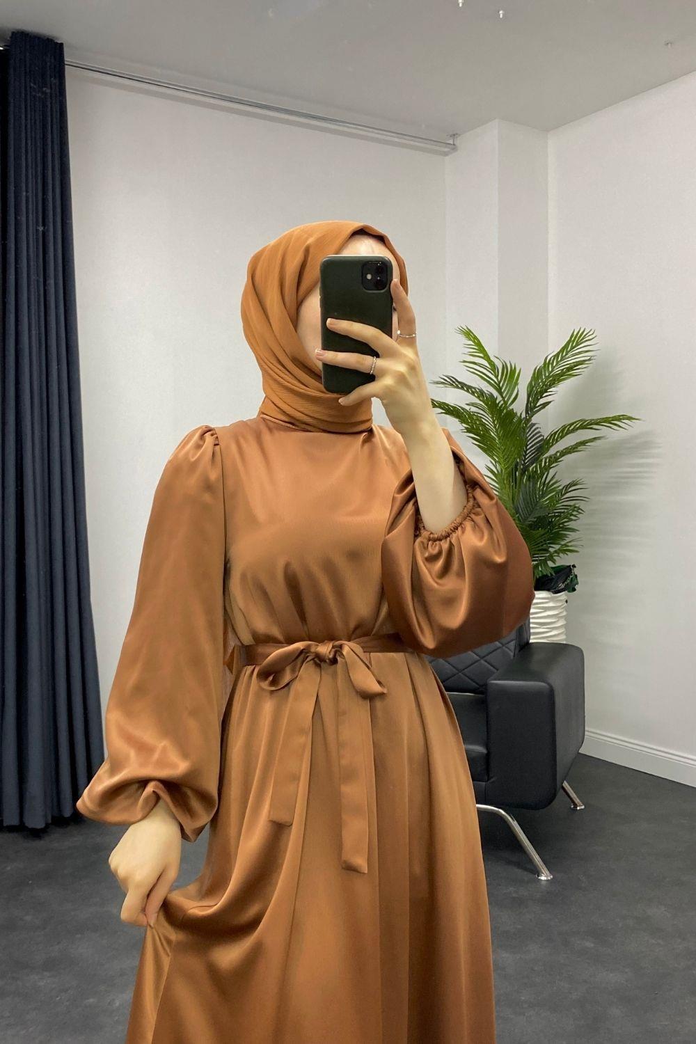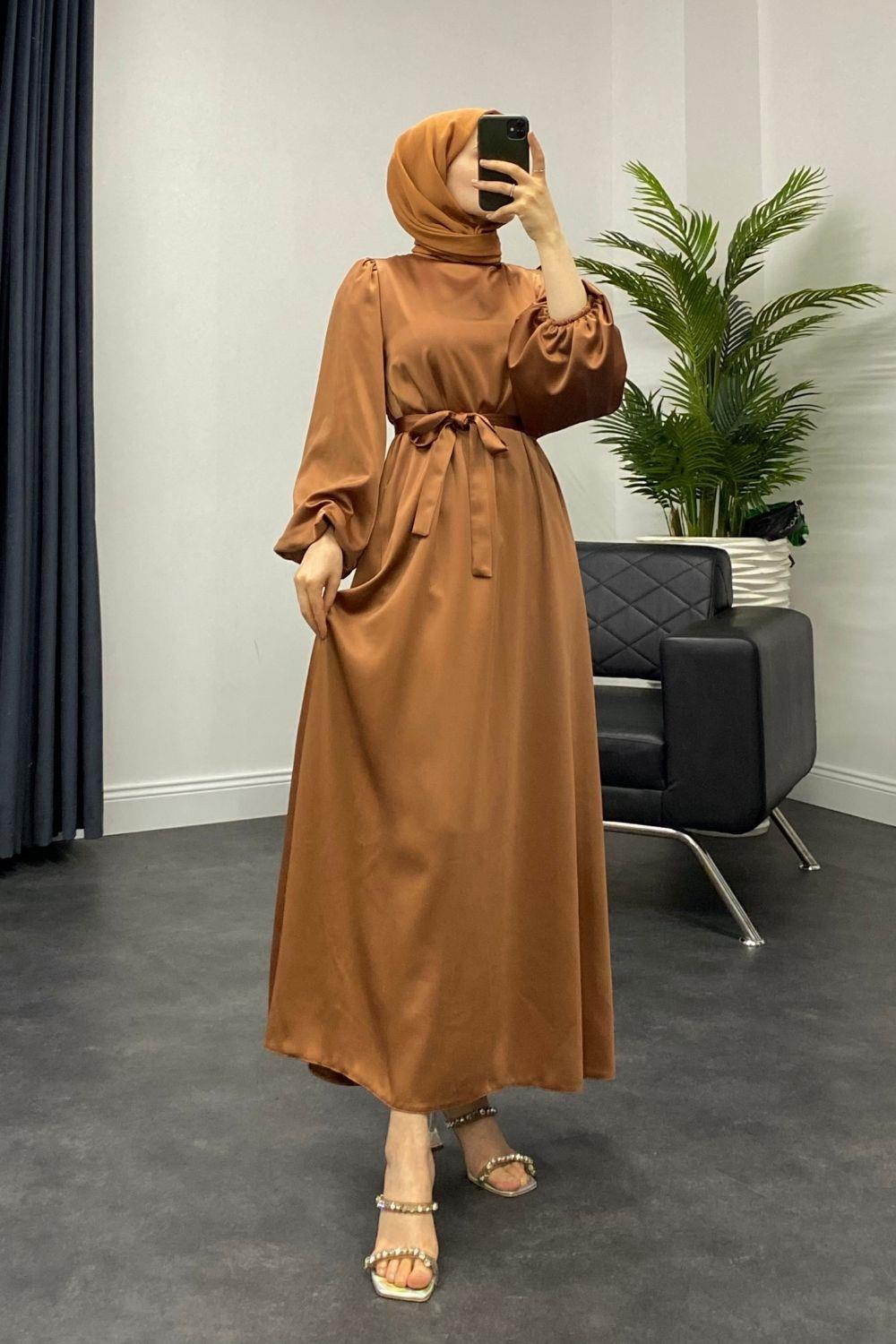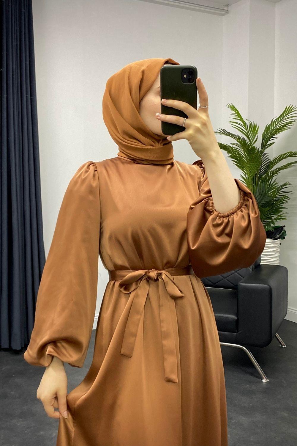 Dimitra Balon Kol Saten Elbise Kiremit