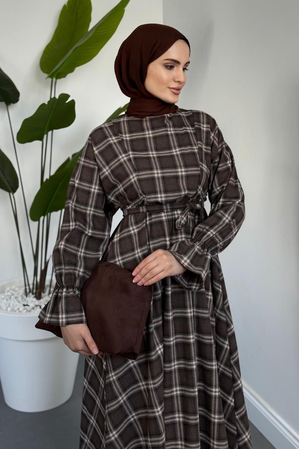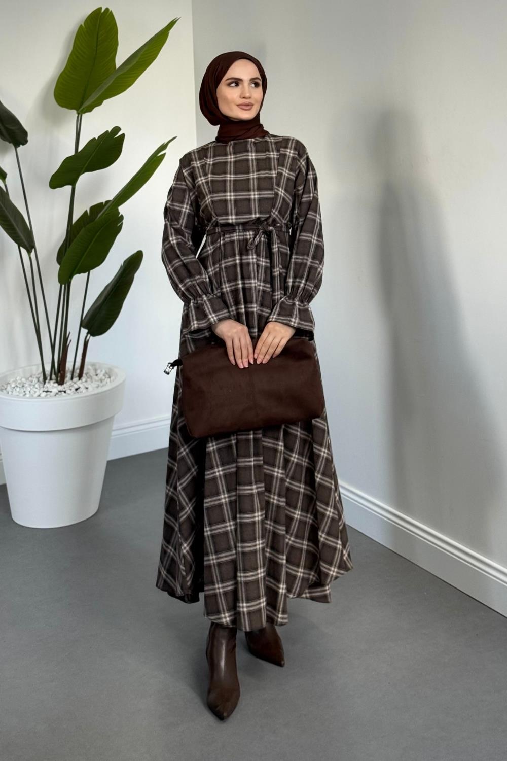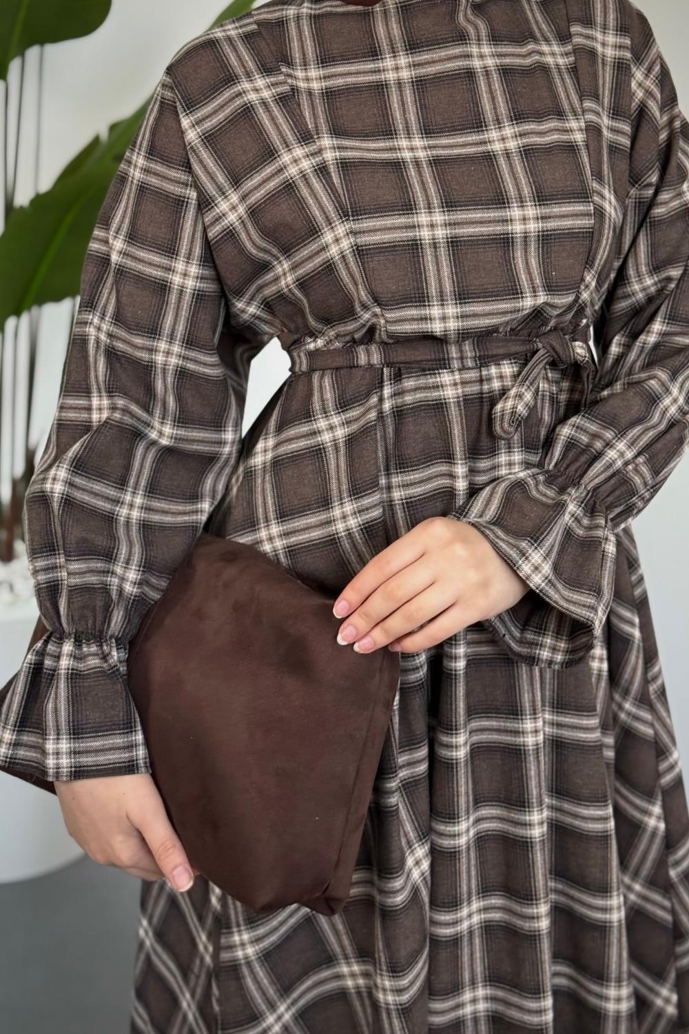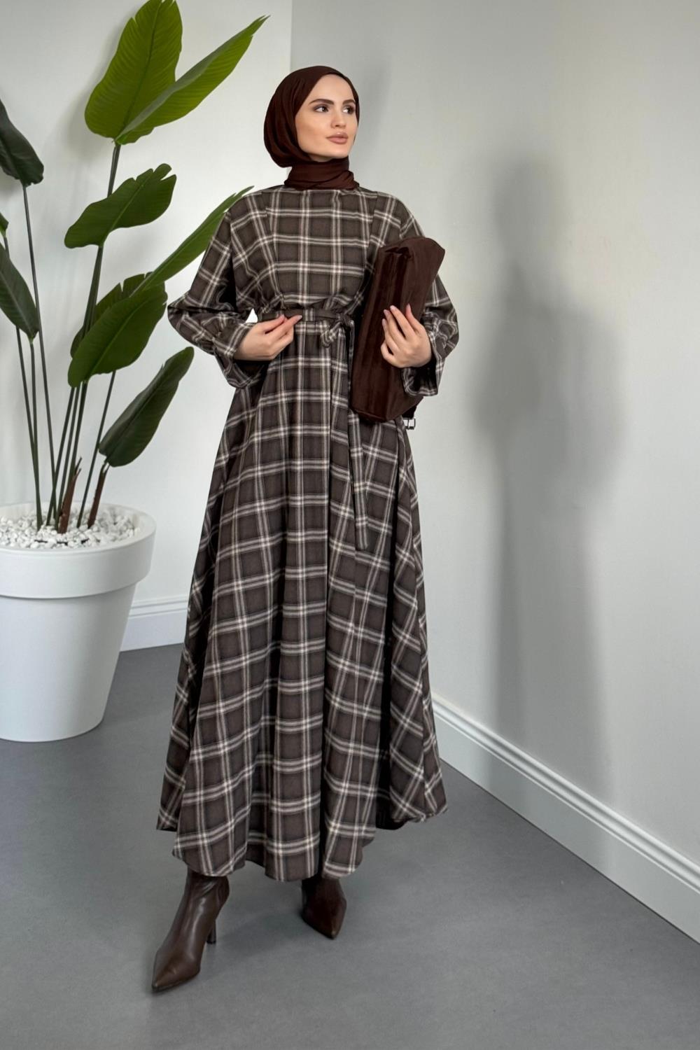 Luciana Mevlana Kesim Ekose Elbise Kahverengi