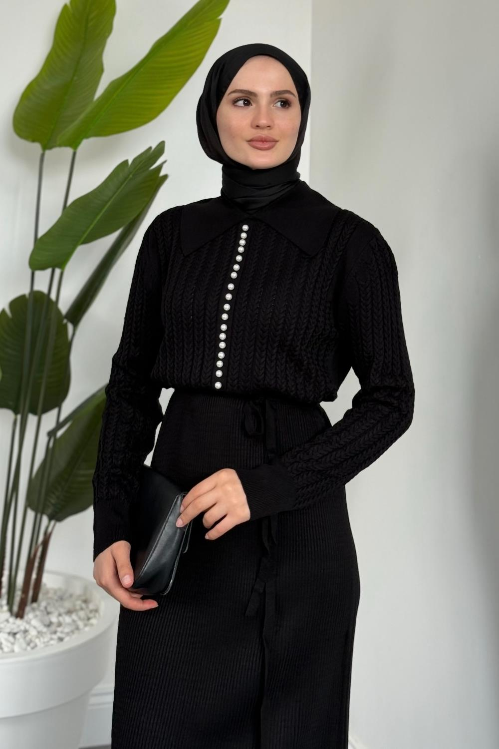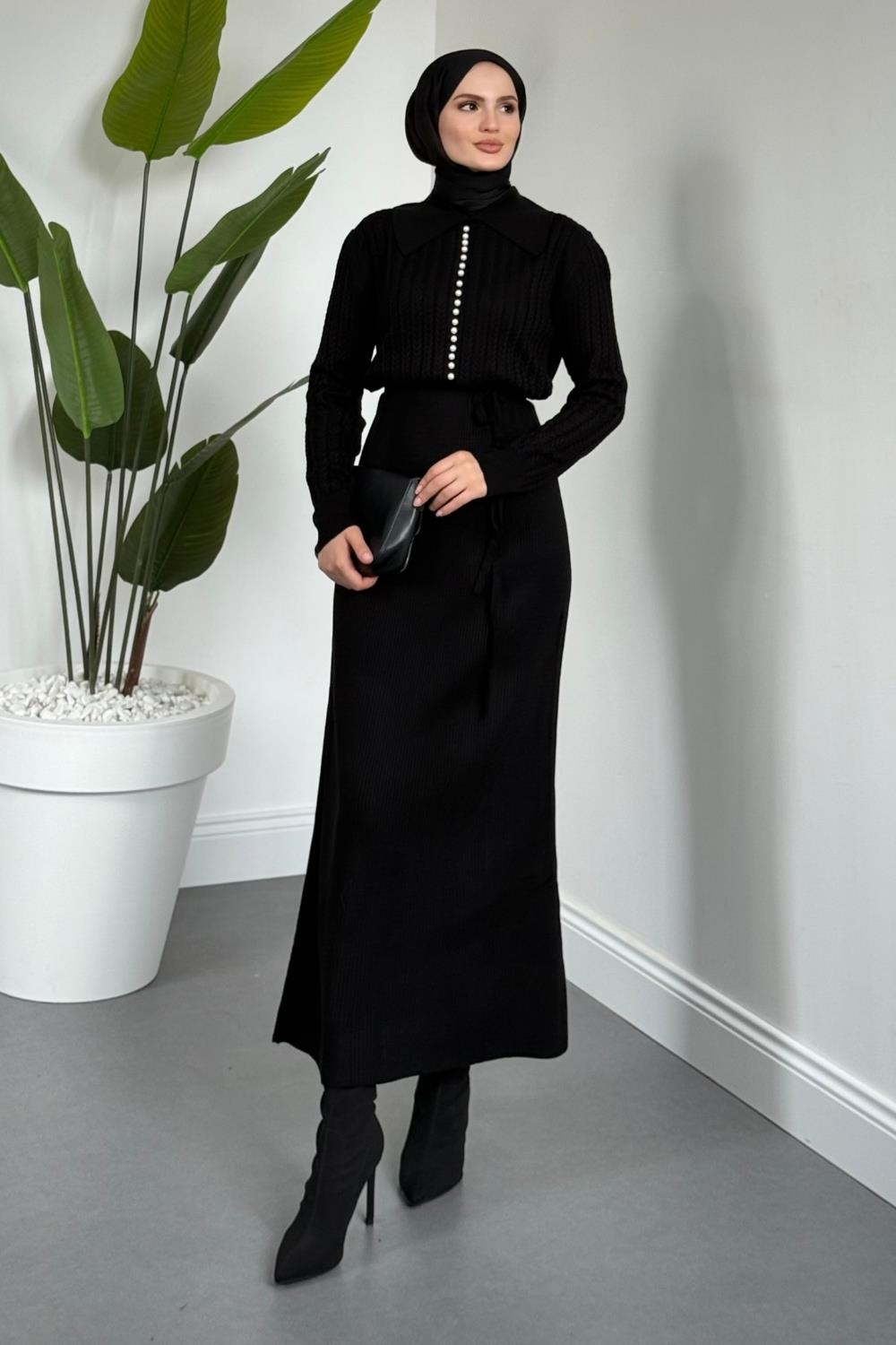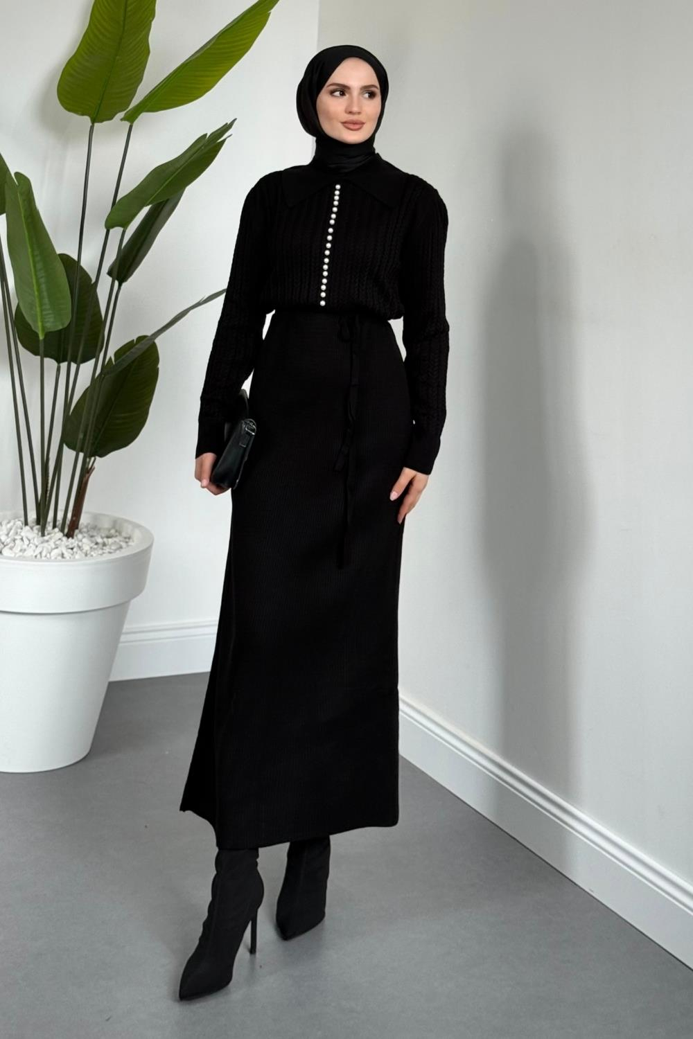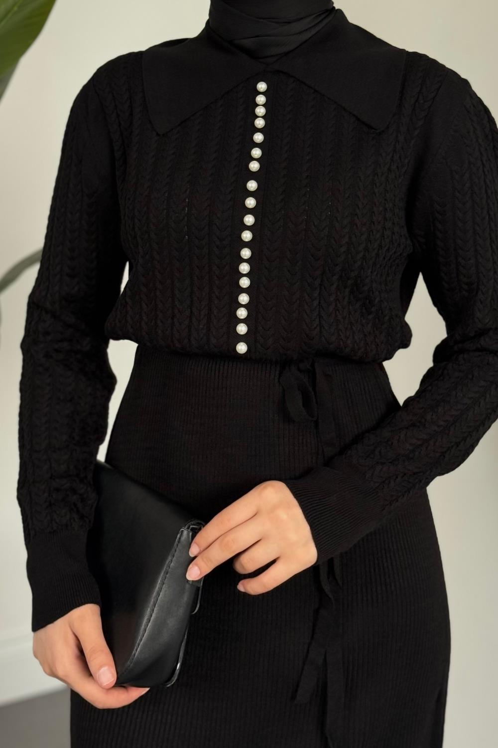 Niosette İnci Düğme Örgülü Triko Elbise Siyah