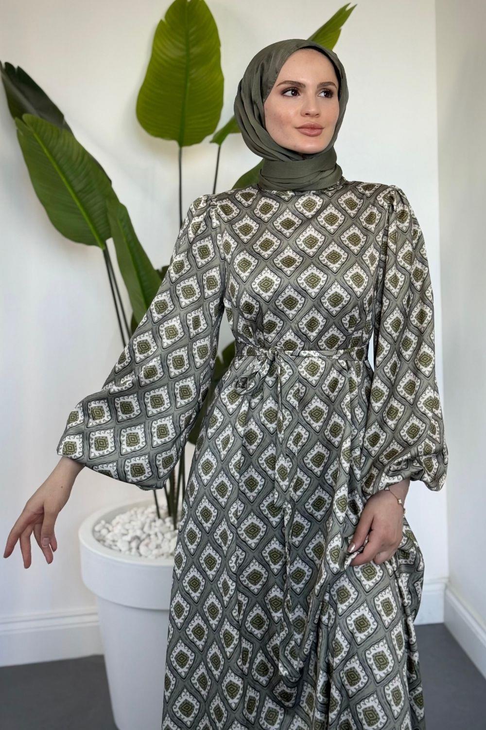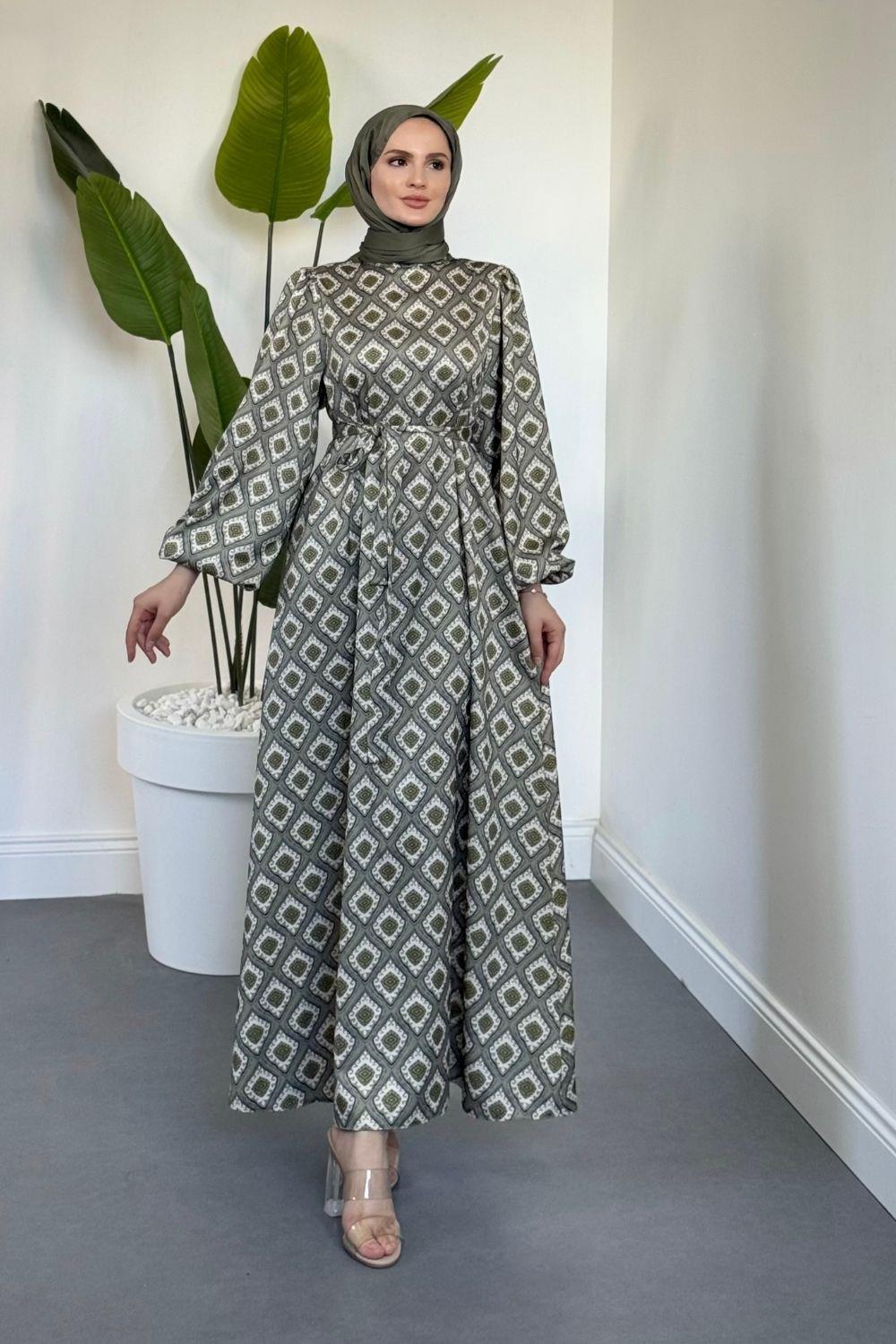Belis Desenli Saten Elbise Haki