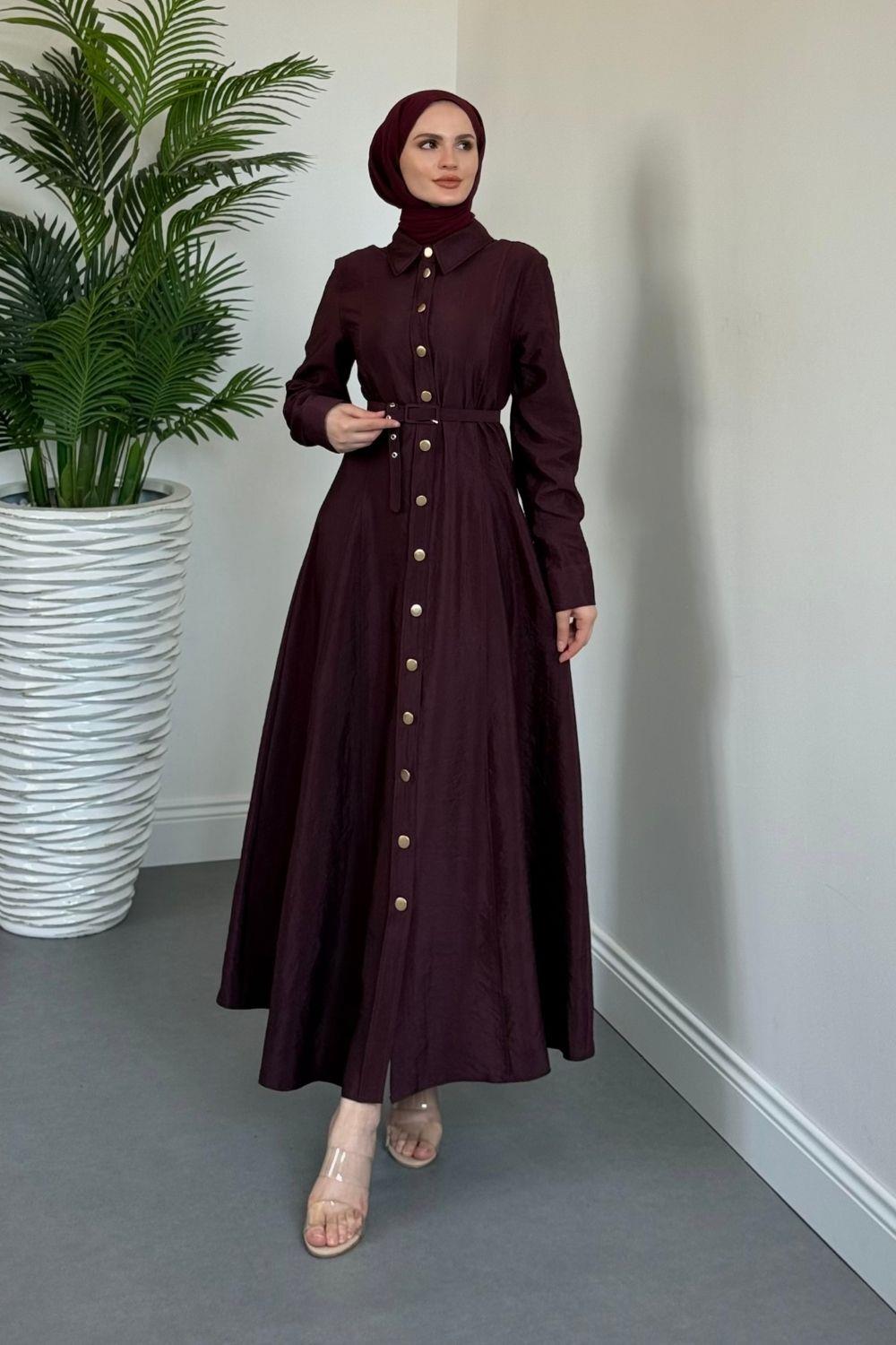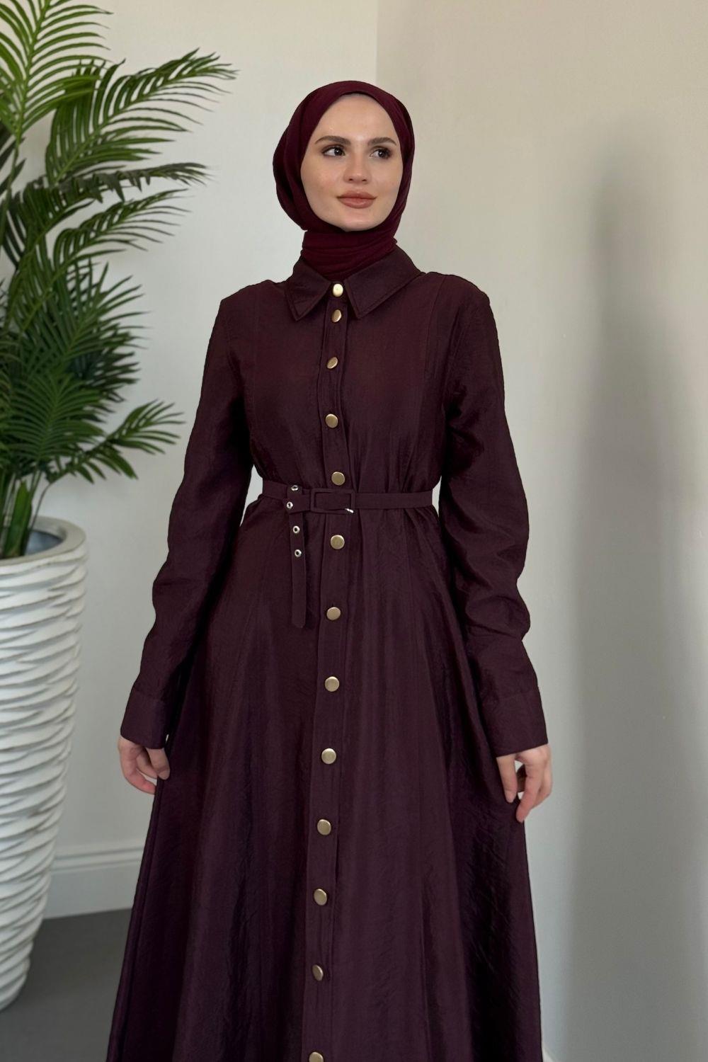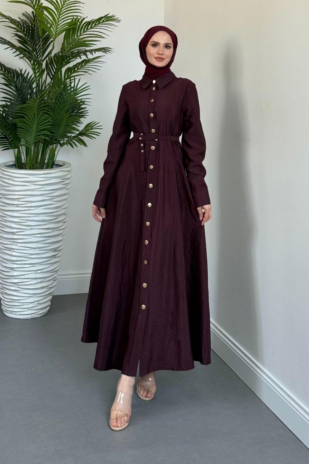 Valira Düğmeli Kemerli Elbise Mürdüm