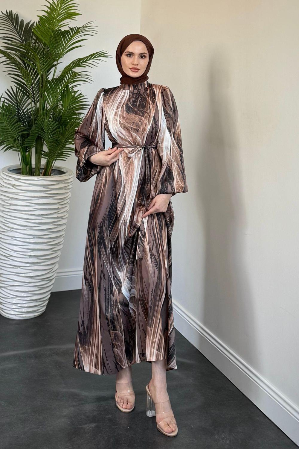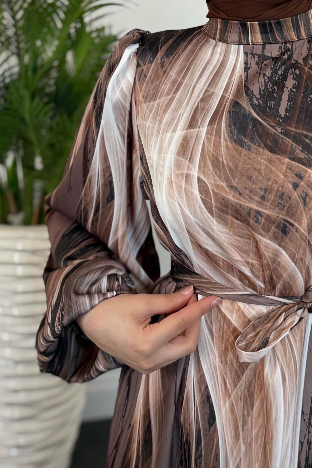 Elsa Desenli Saten Elbise Kahverengi
