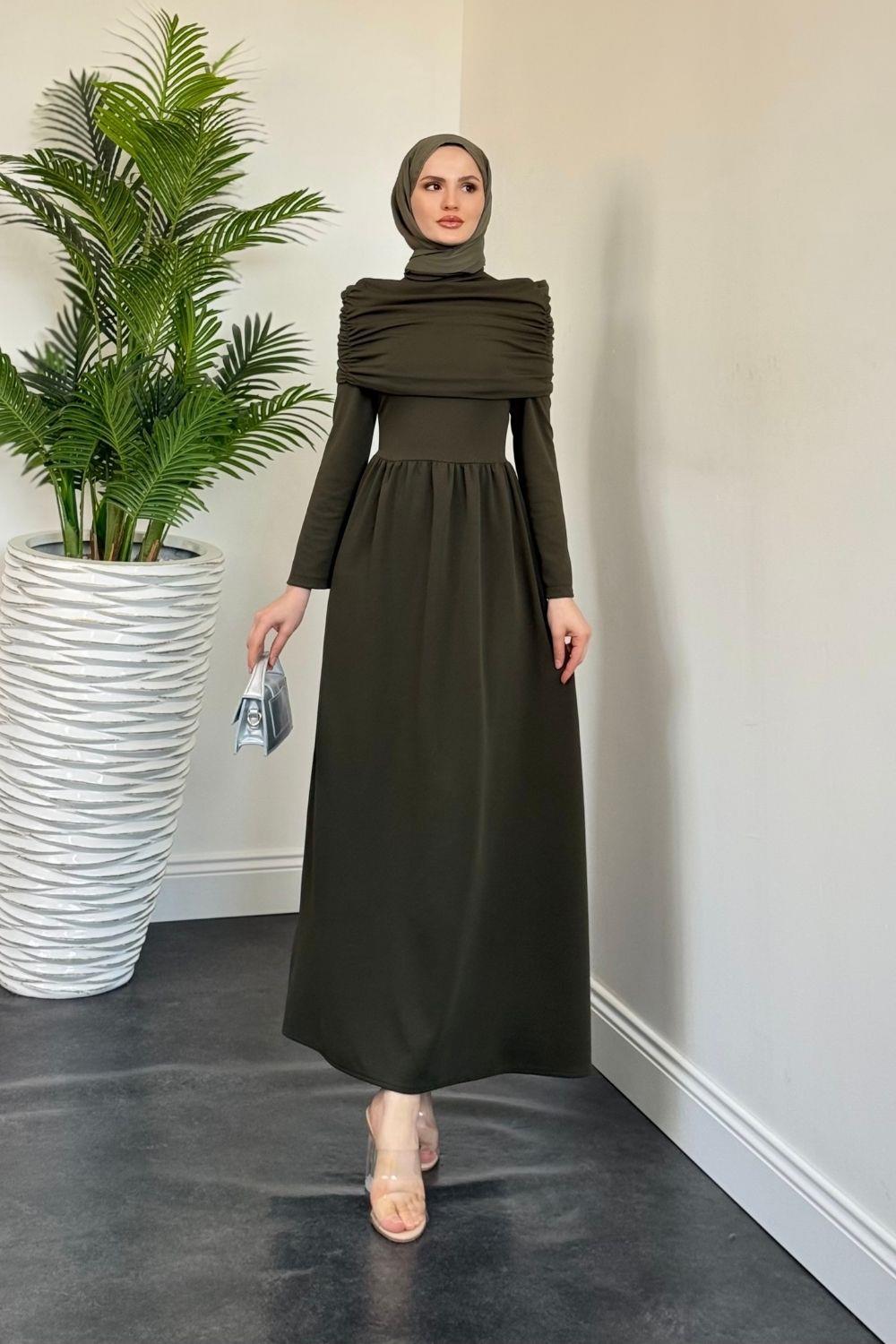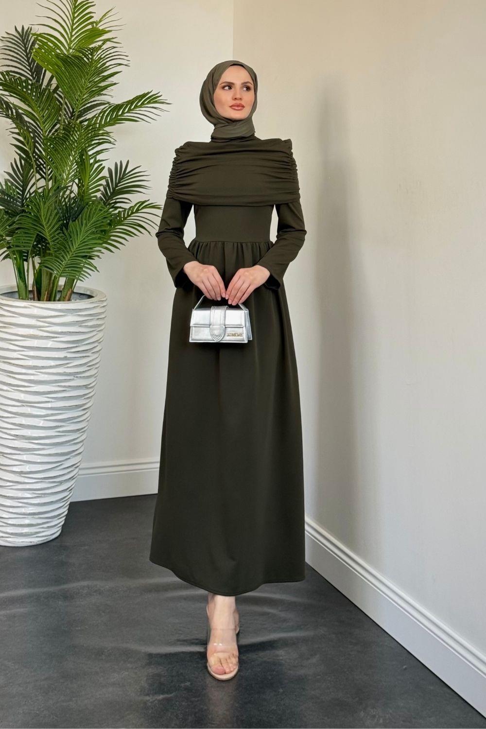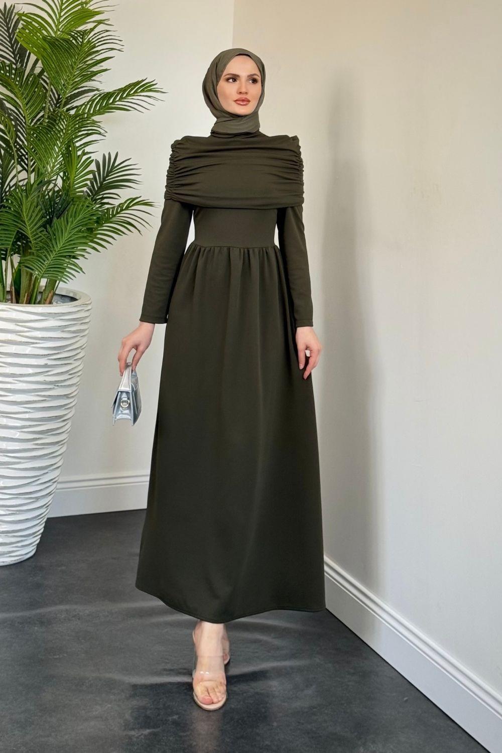 Flora Üstü Pelerinli Elbise Haki