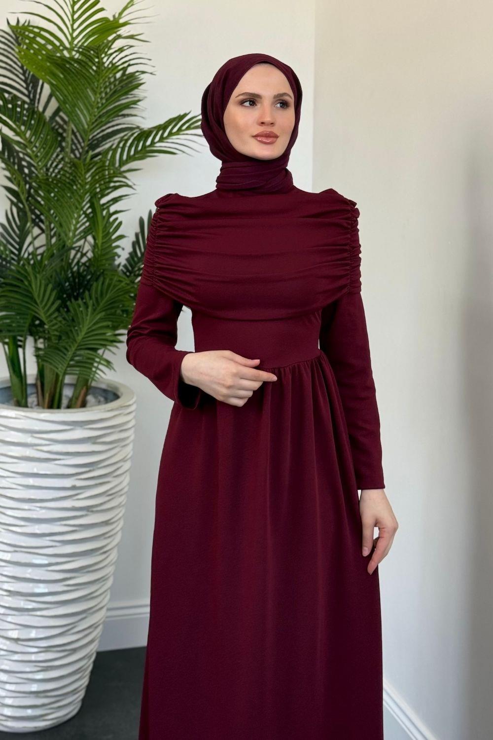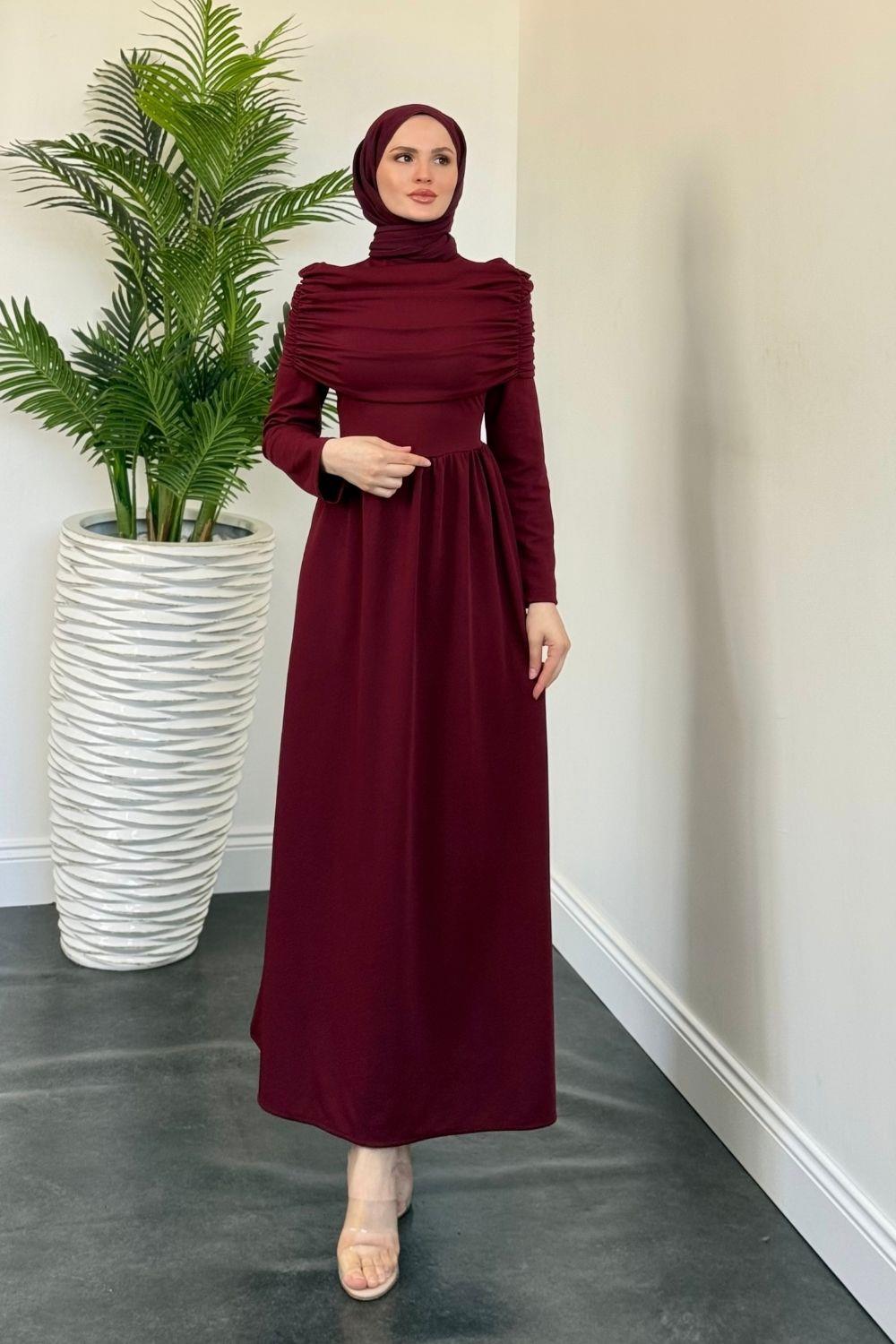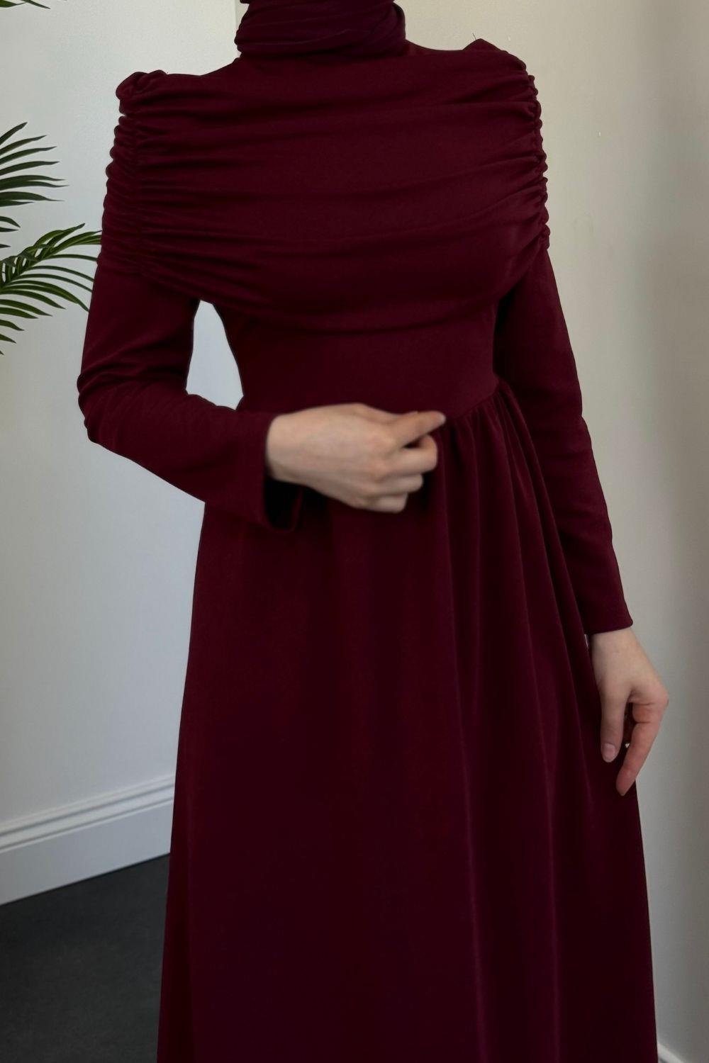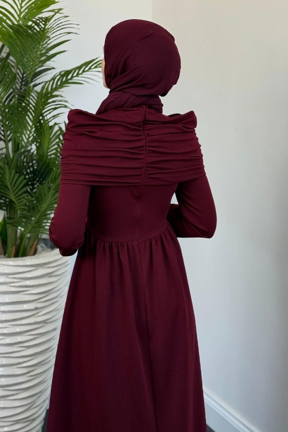 Flora Üstü Pelerinli Elbise Bordo