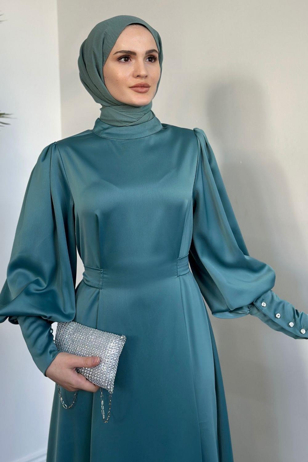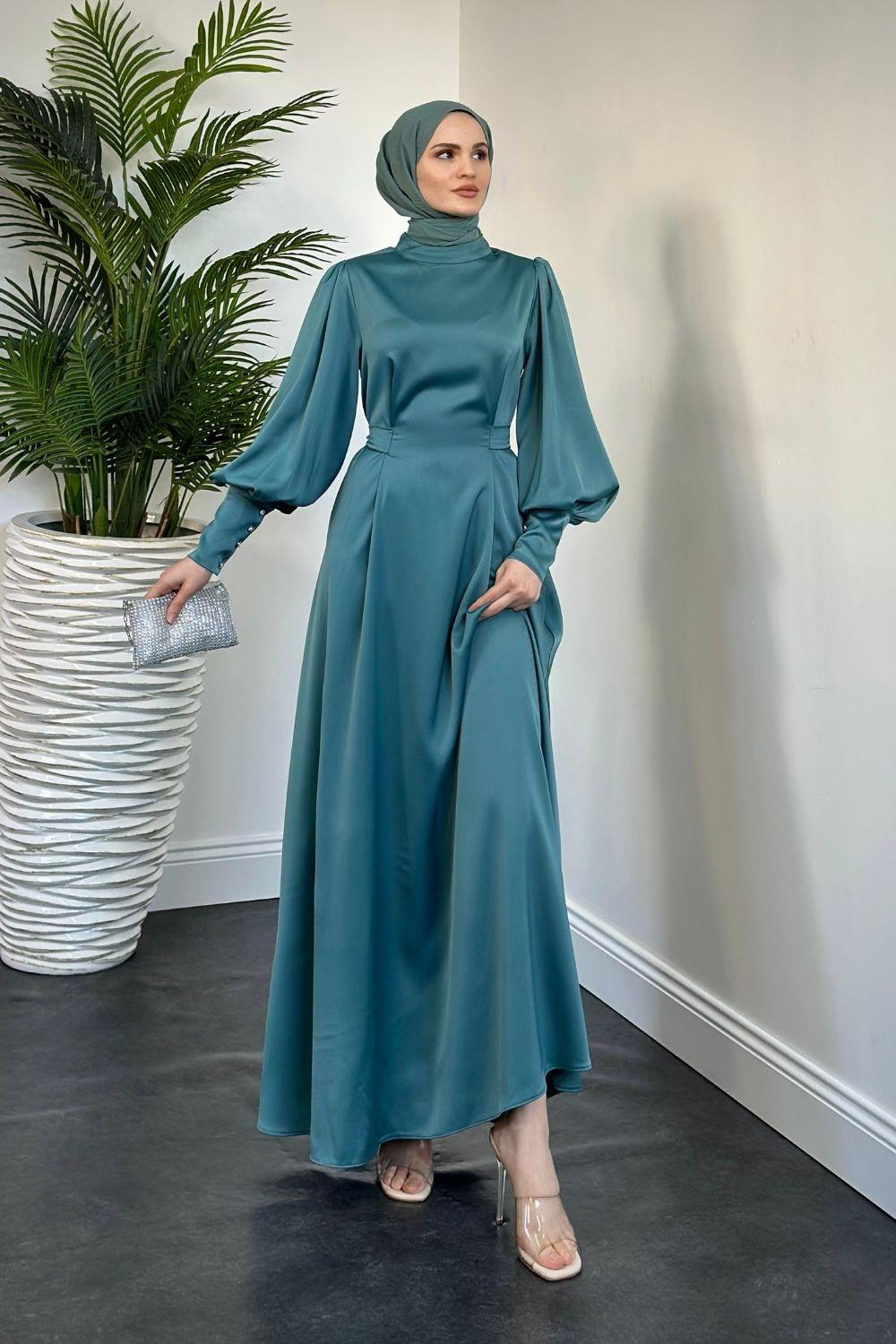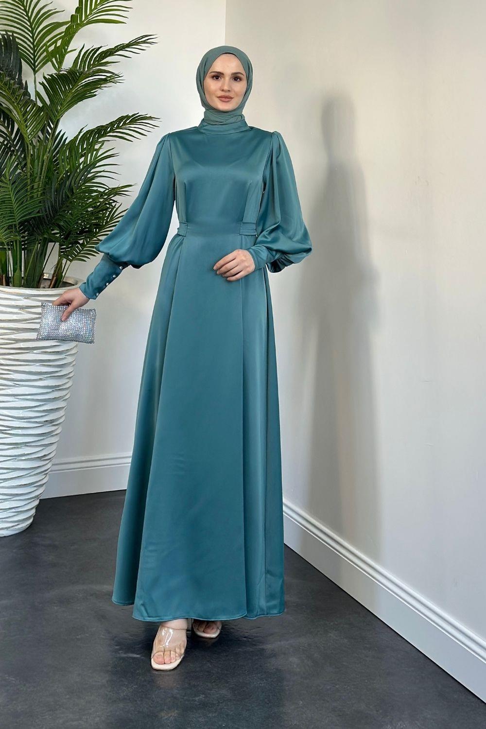 Emora Kuşaklı Saten Elbise Turkuaz