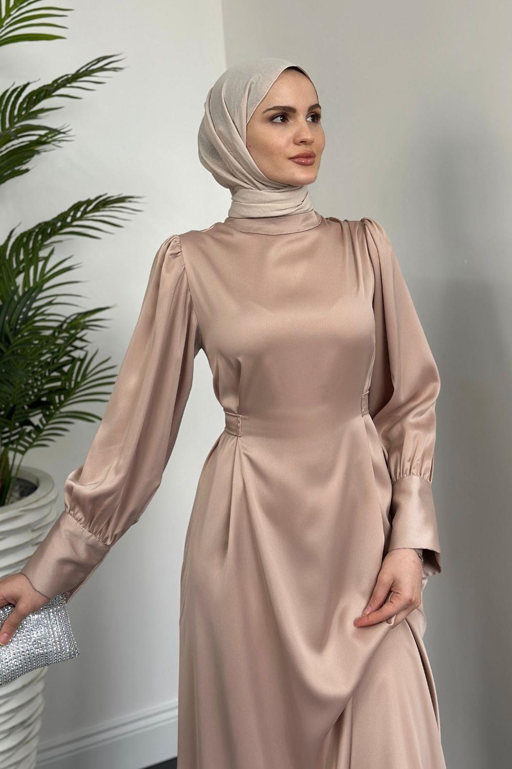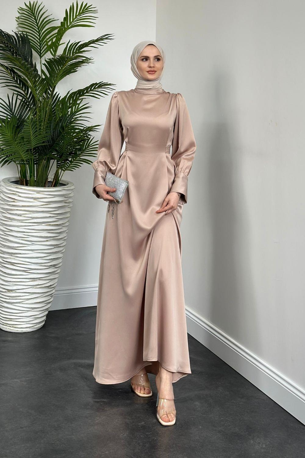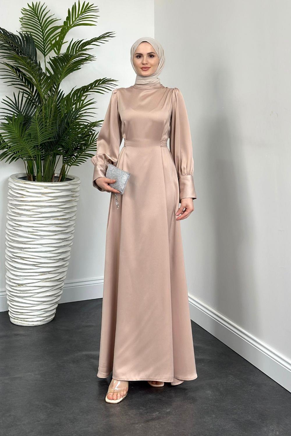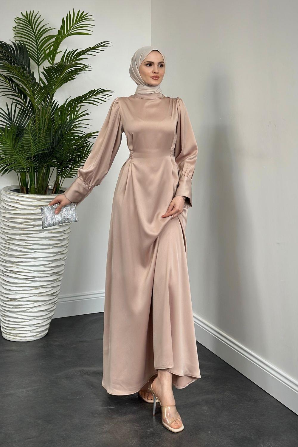 Emora Kuşaklı Saten Elbise Ekru