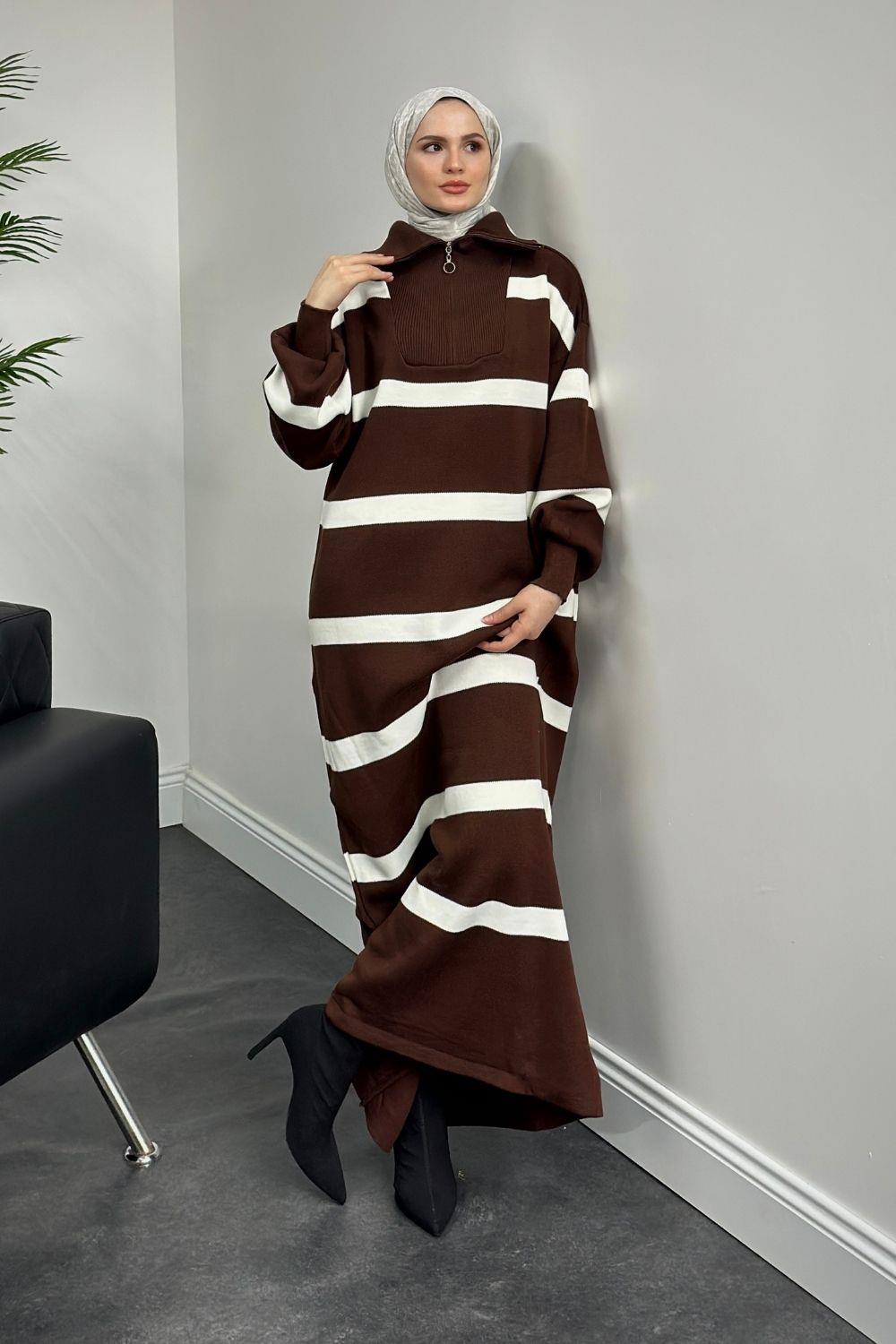 Serenity Çizgili Triko Elbise Kahverengi