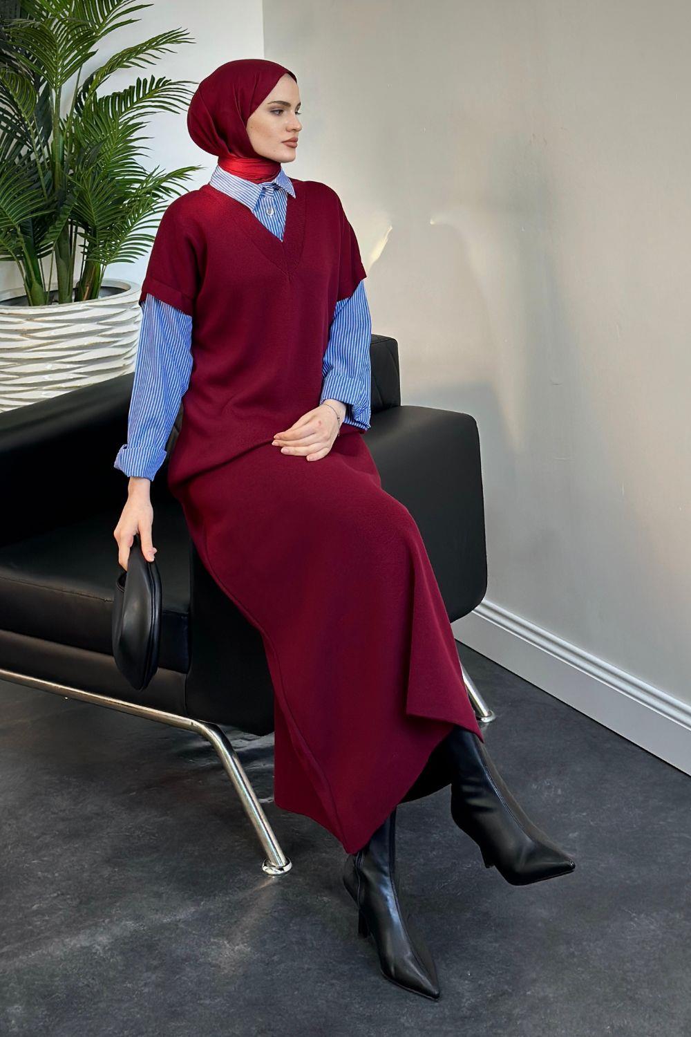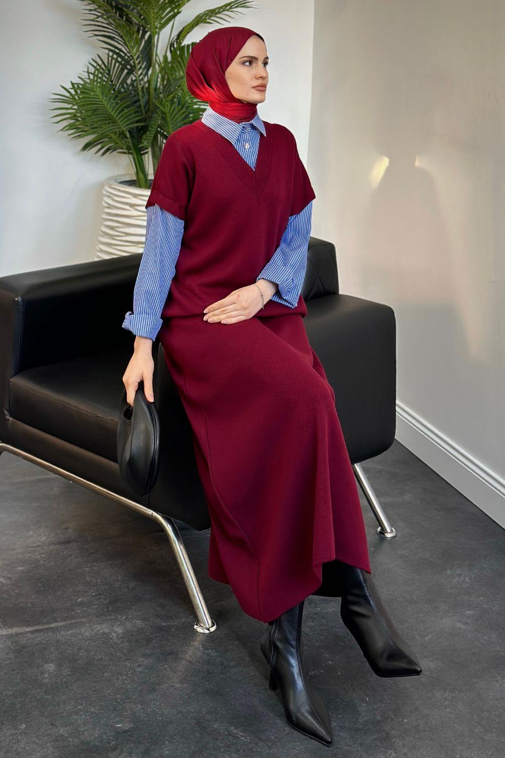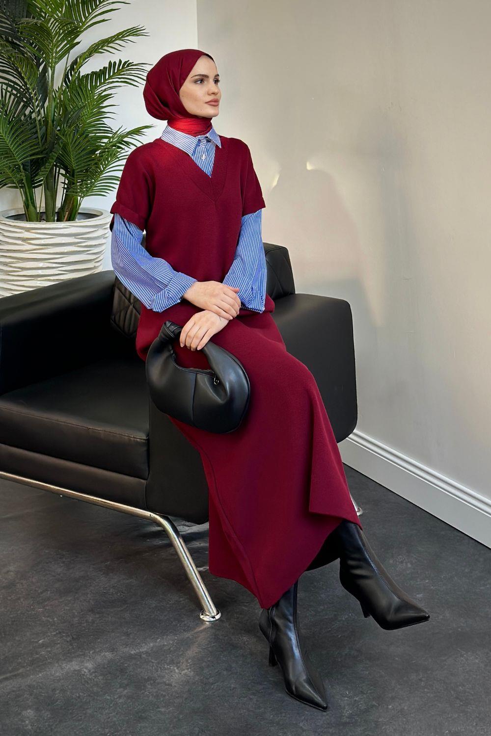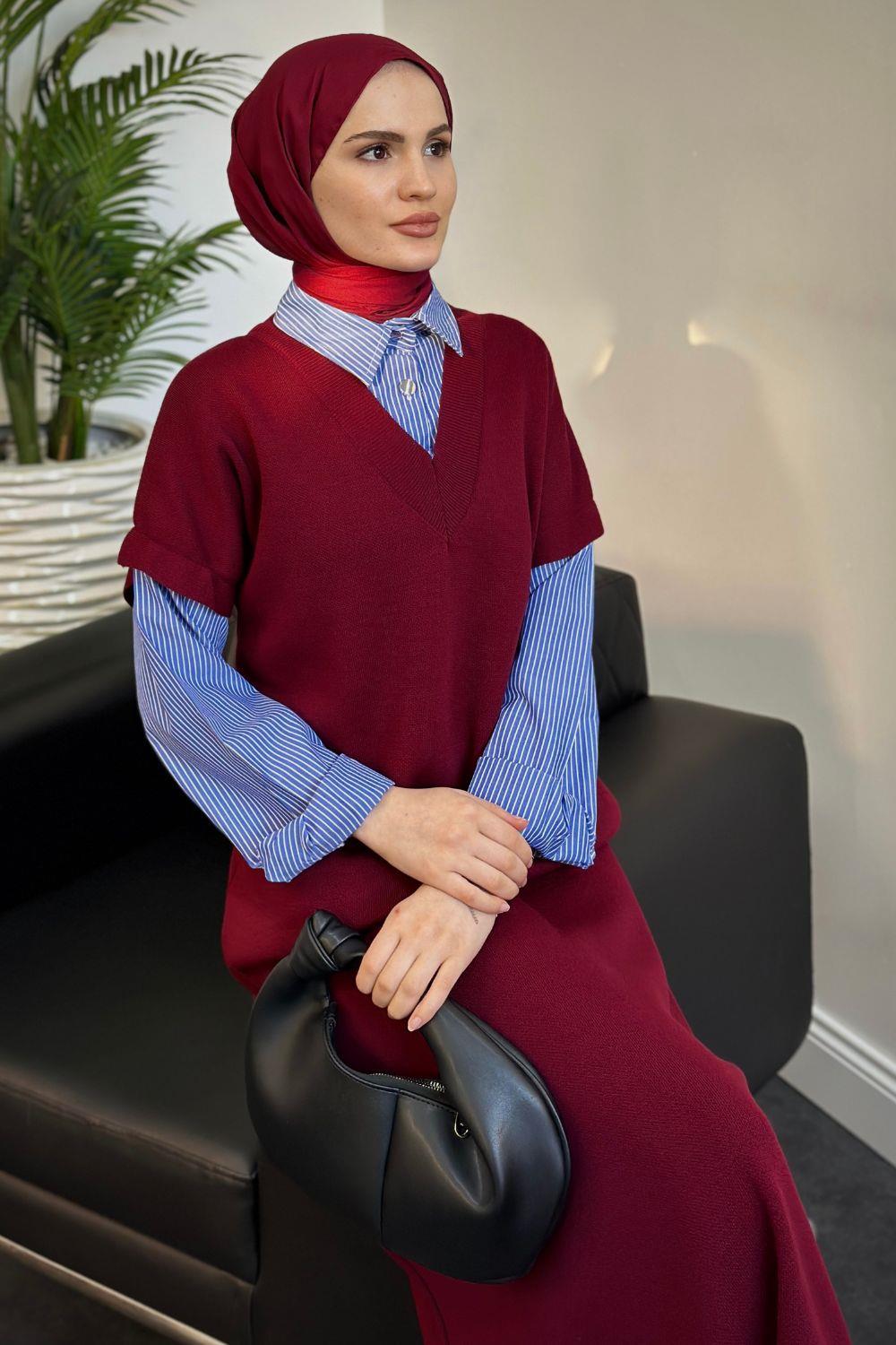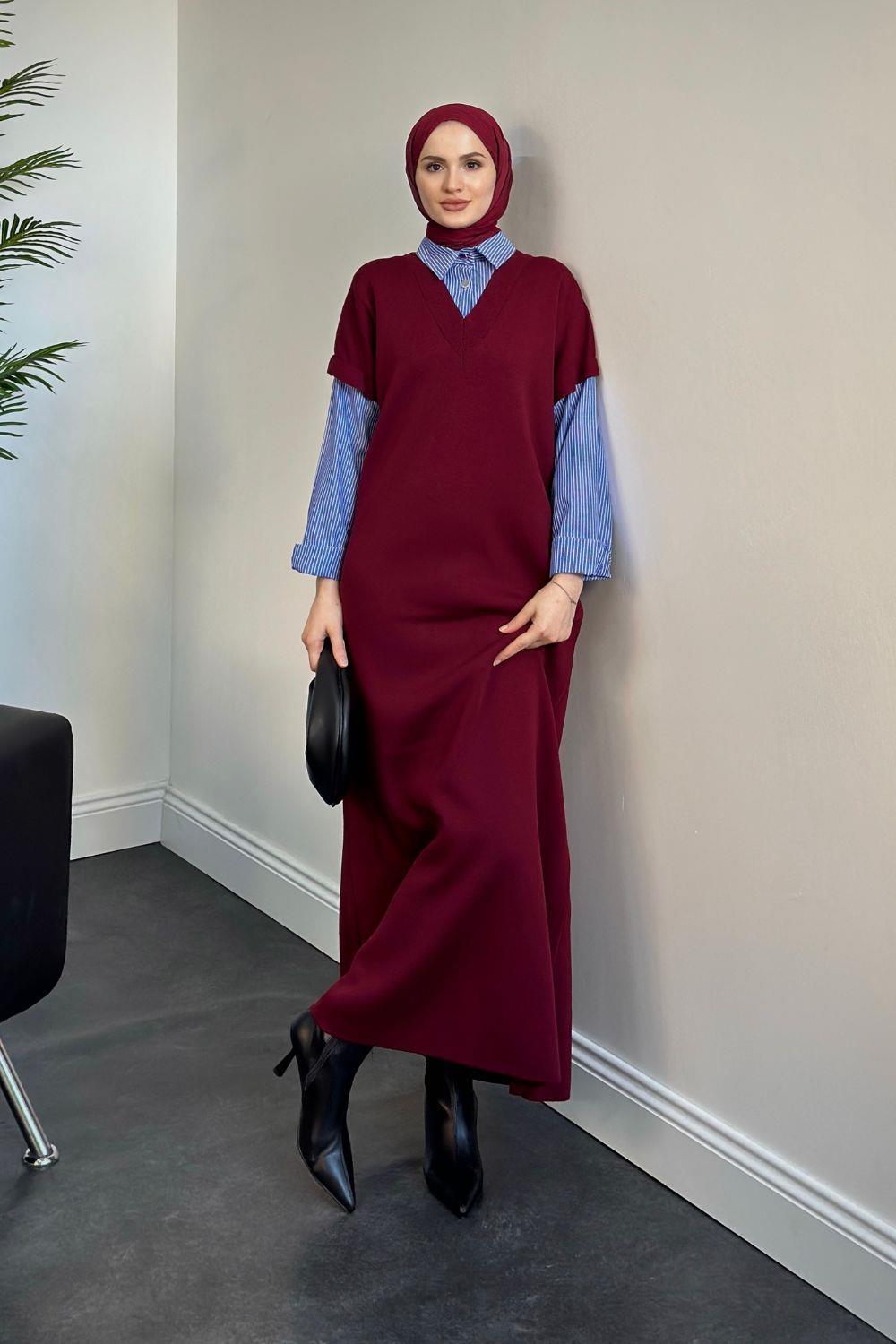 Sidney Gömlekli Triko Elbise Bordo