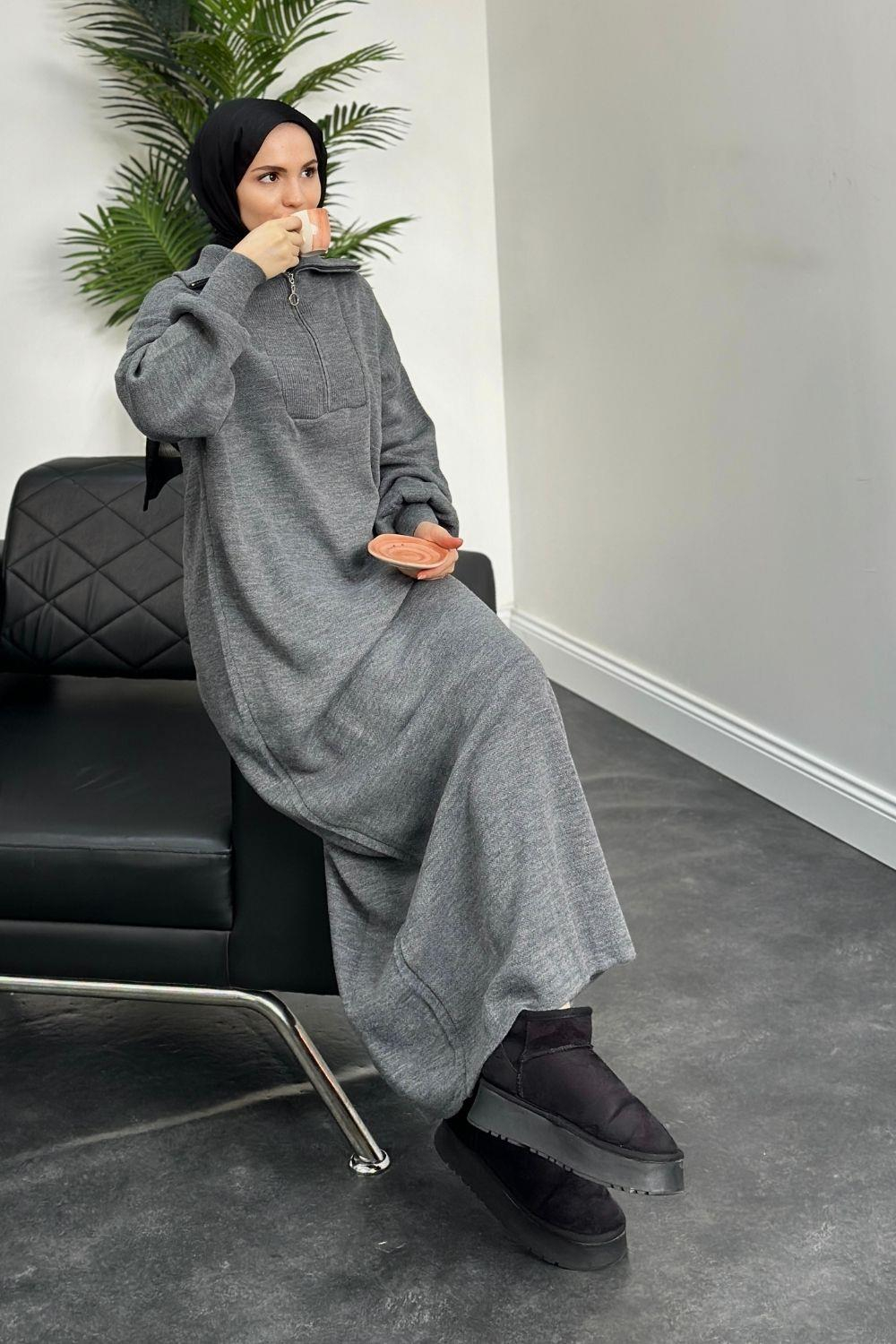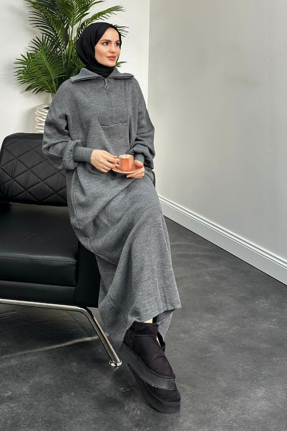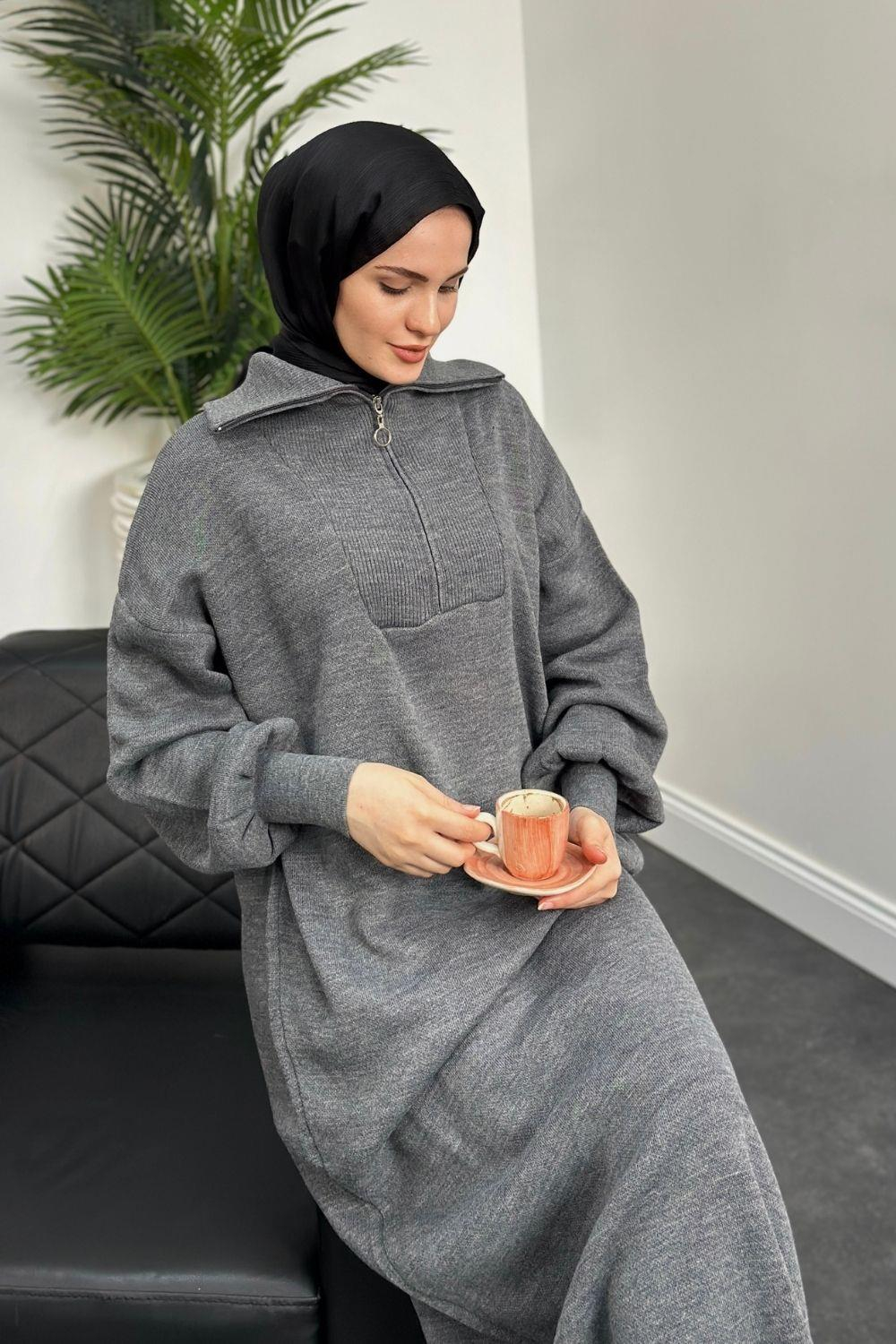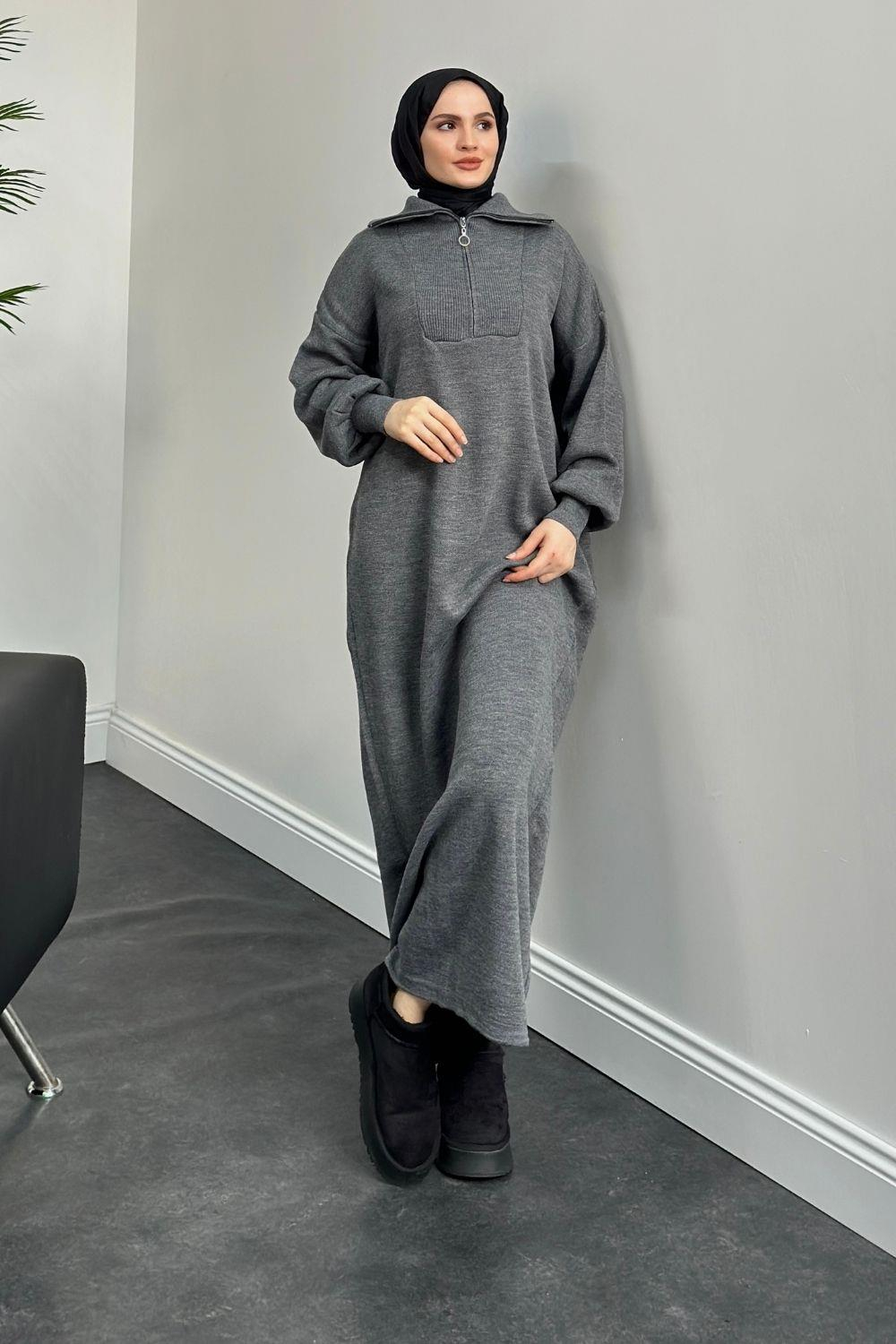 Jairo Fermuarlı Oversize Triko Elbise Gri