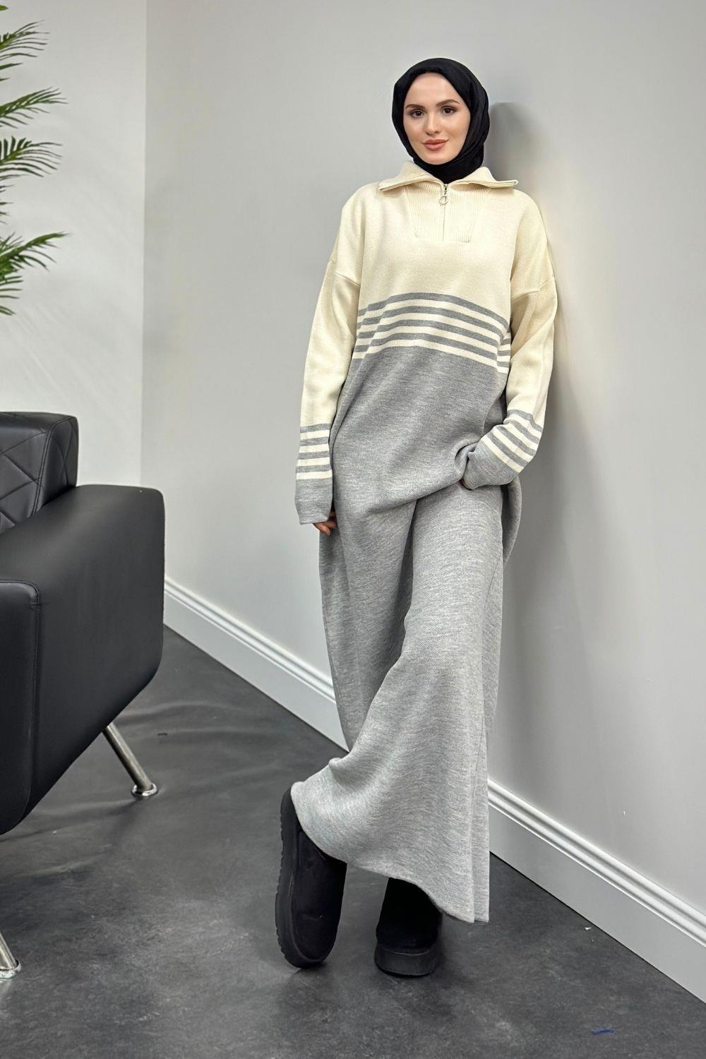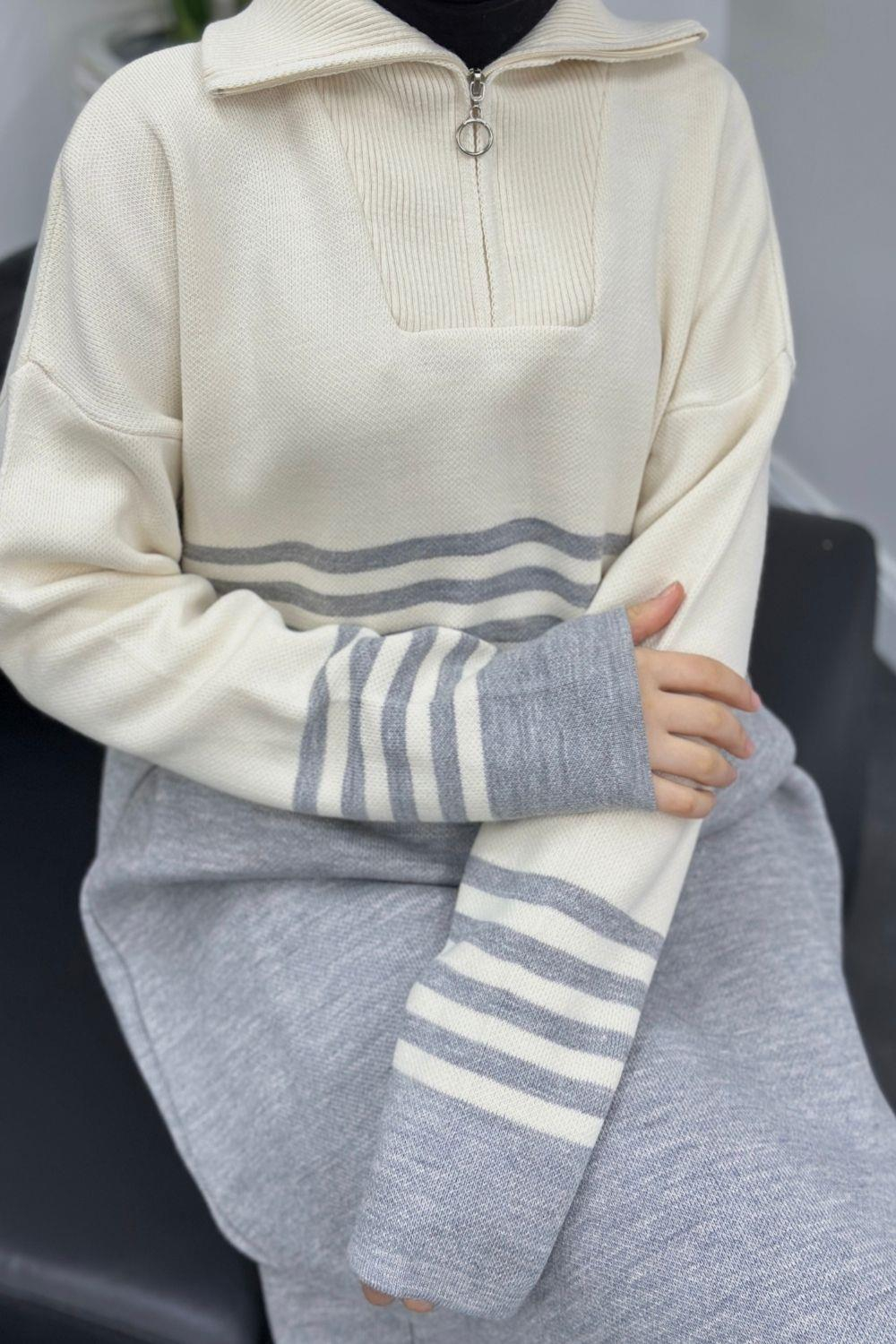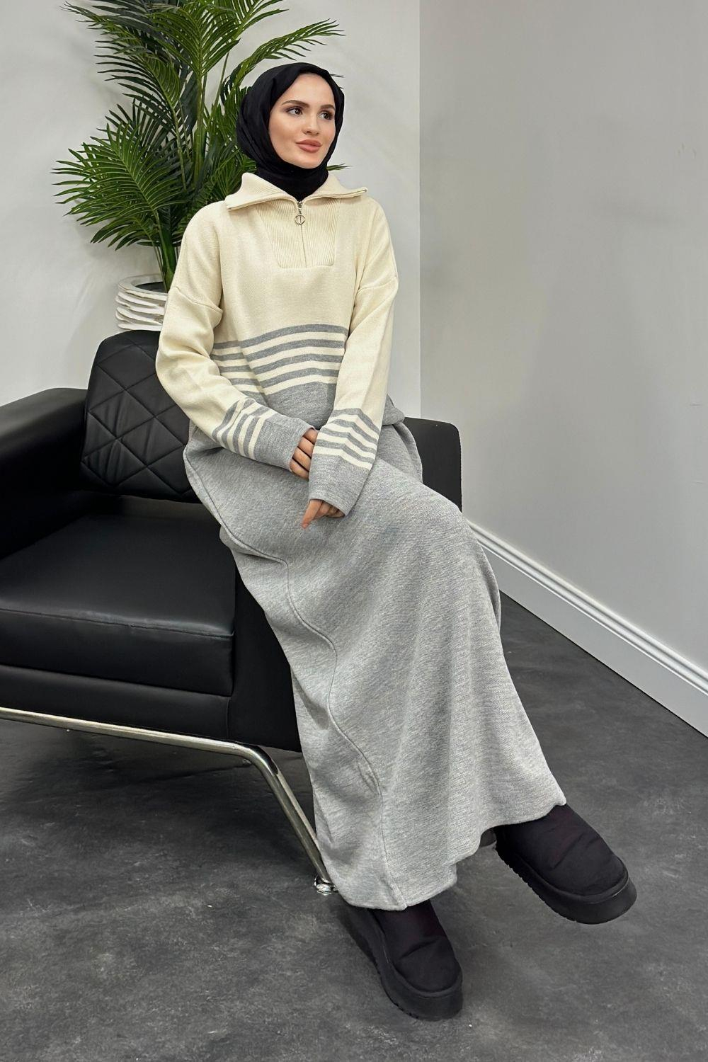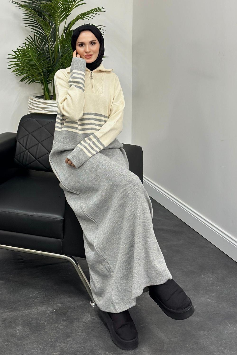 Vernon Çizgili Fermuarlı Triko Elbise Gri