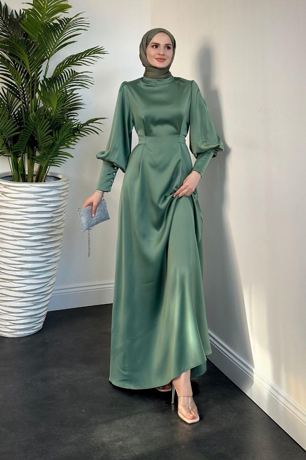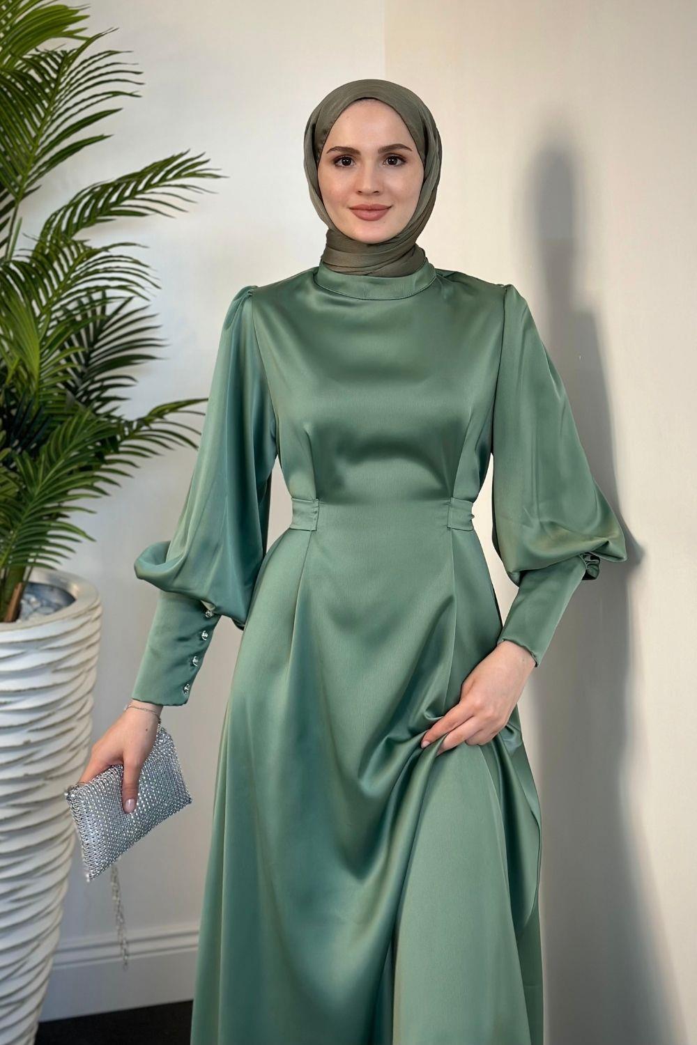 Emora Kuşaklı Saten Elbise Mint