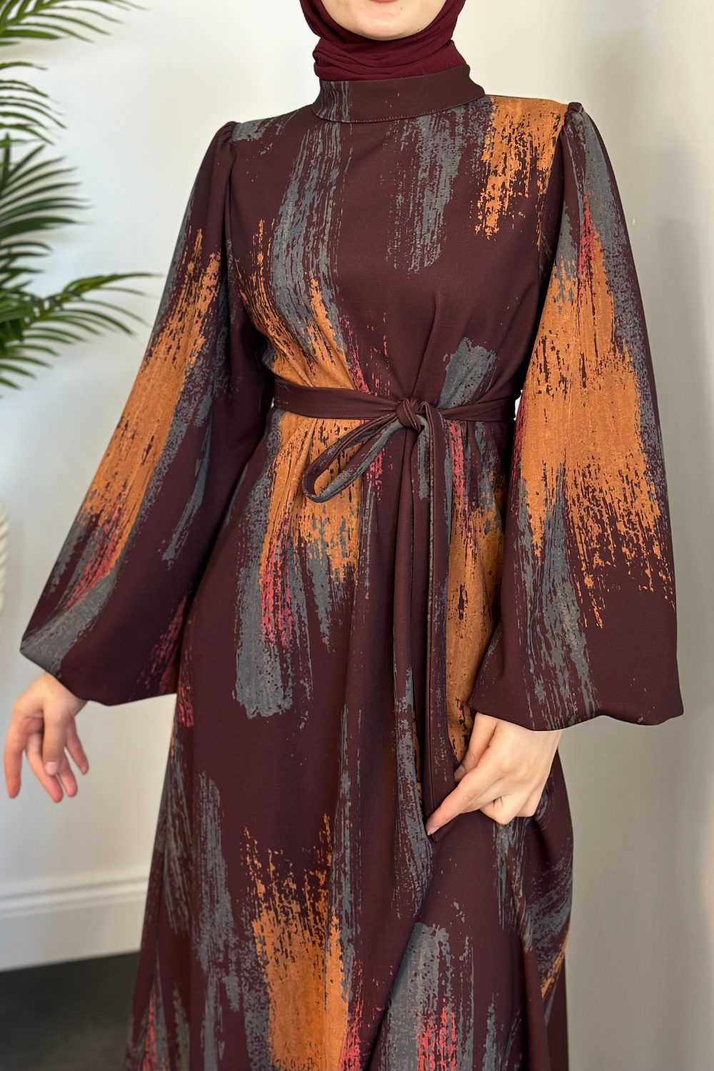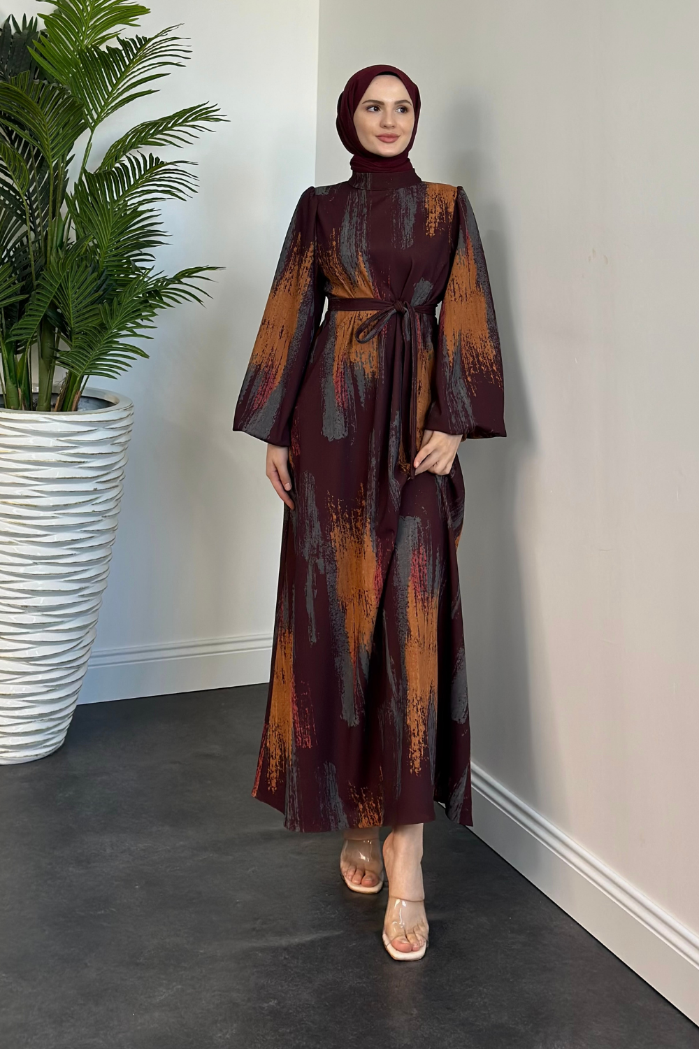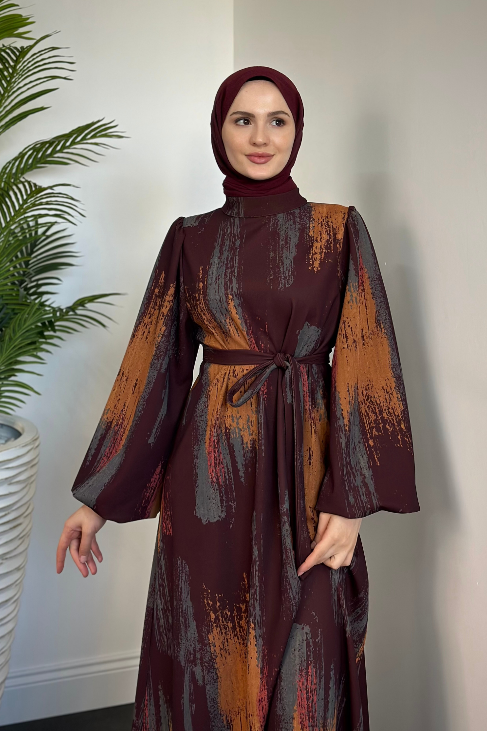 Alessa Fırça Desen Balon Kol Elbise Bordo