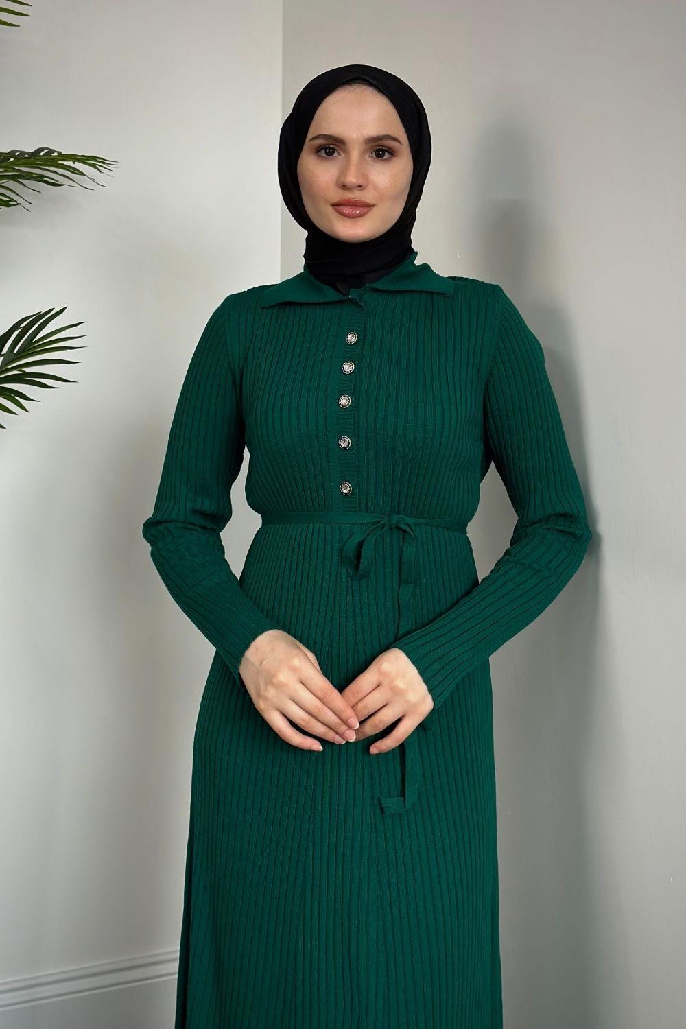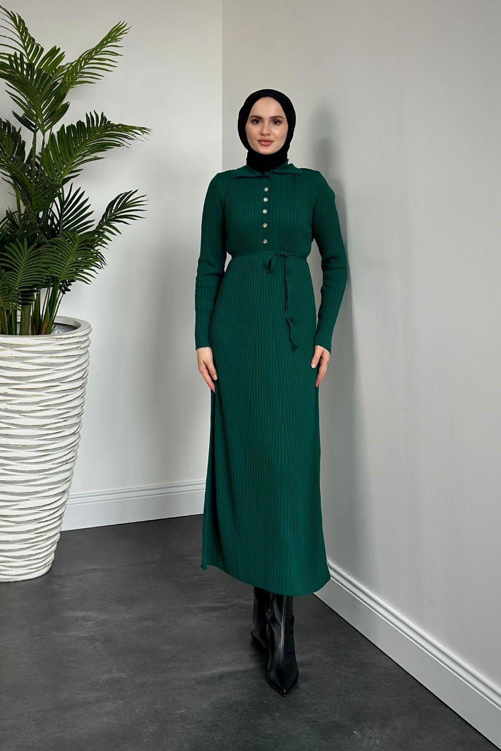 Karunika Düğmeli Seyyar Kuşak Triko Elbise Zümrüt