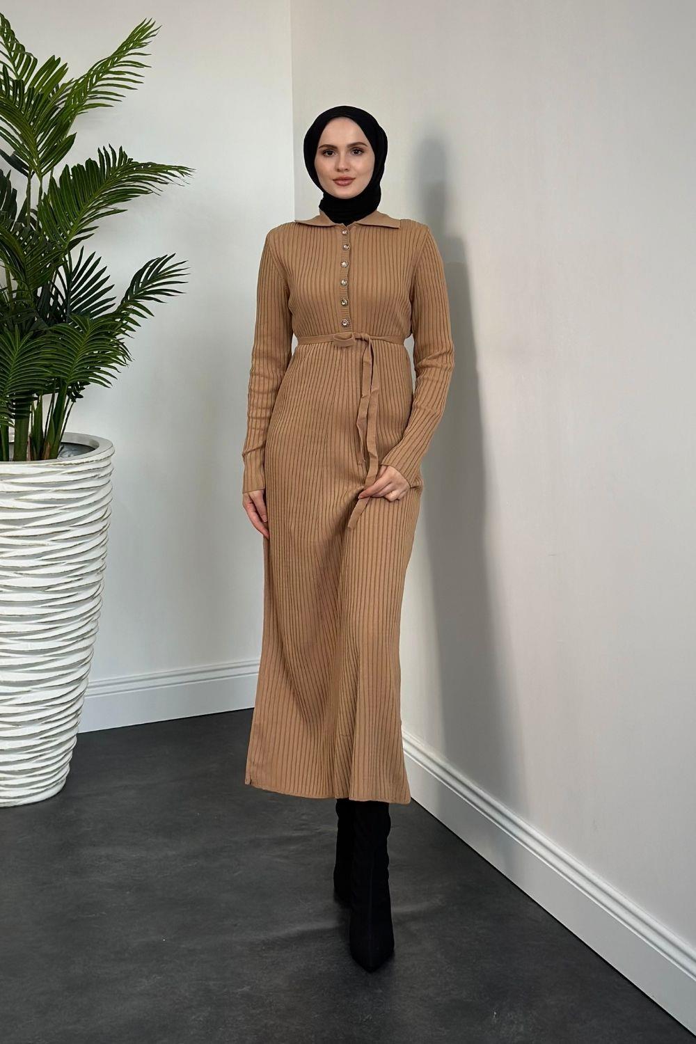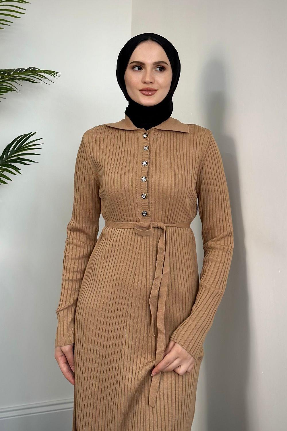 Karunika Düğmeli Seyyar Kuşak Triko Elbise Vizon