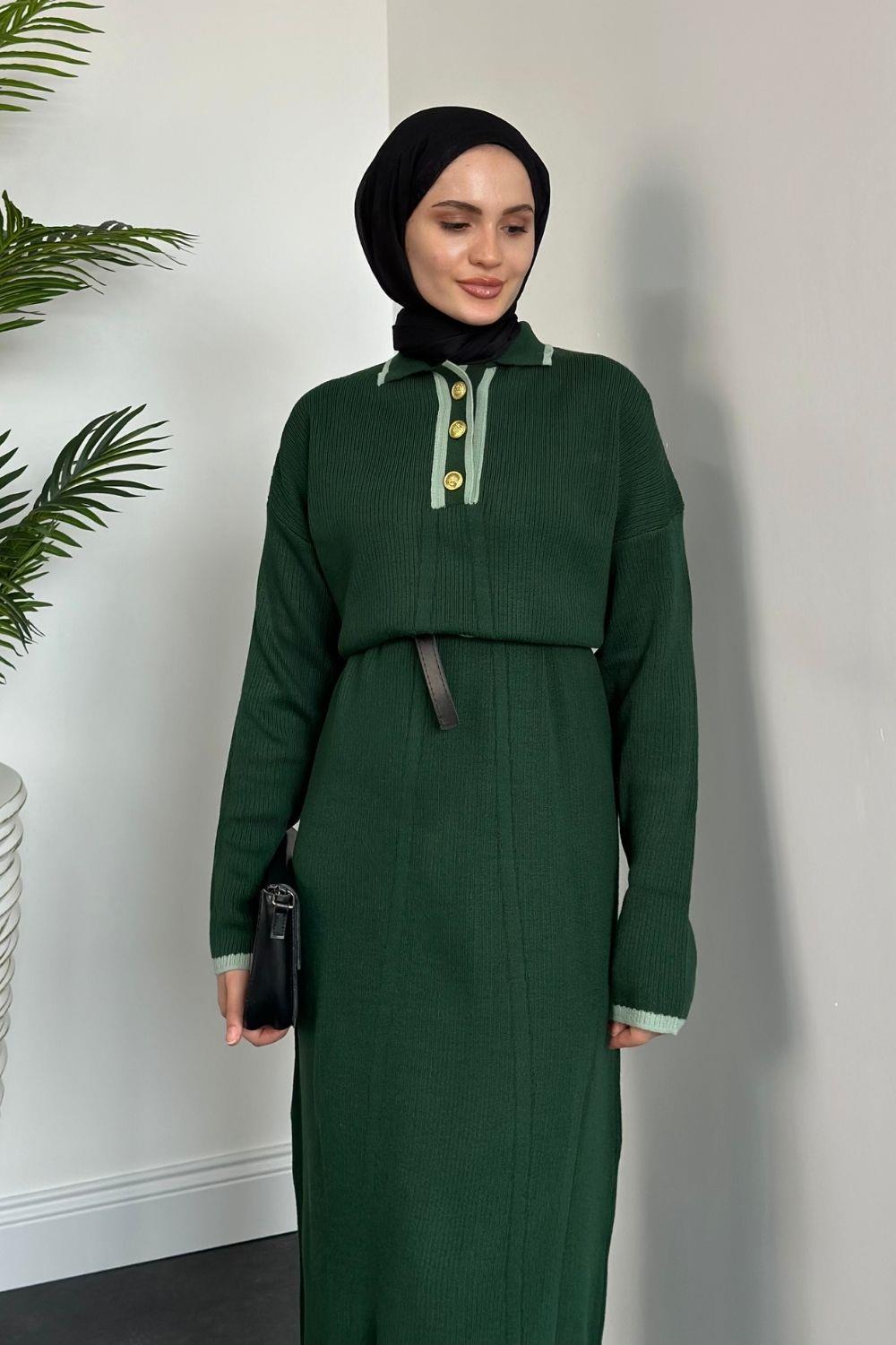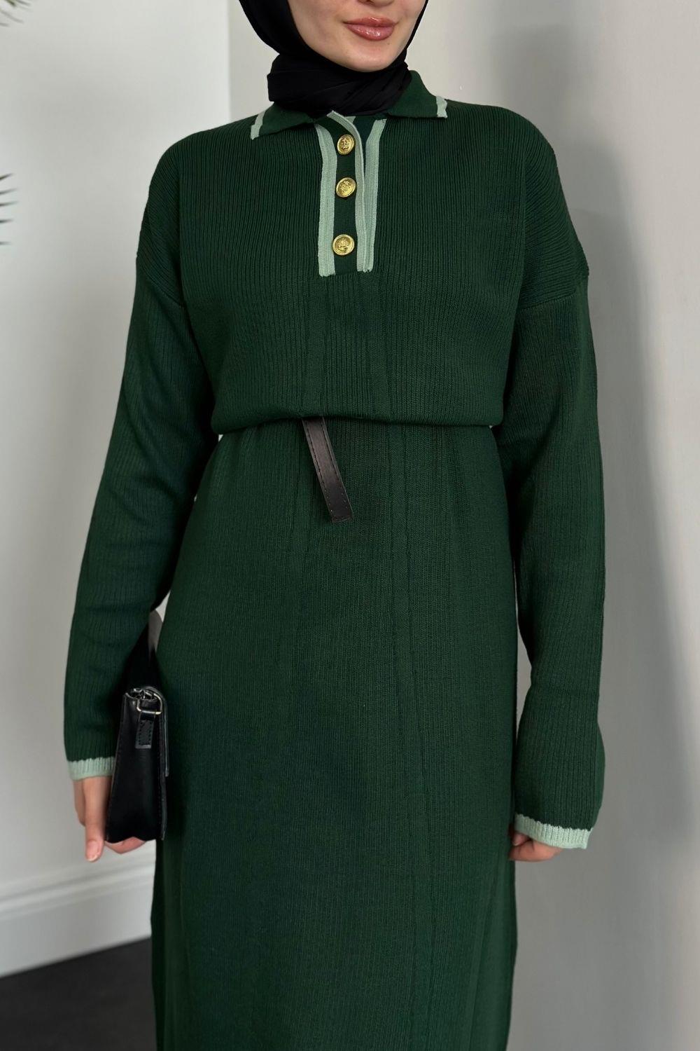 Amiya Düğmeli Triko Elbise Zümrüt