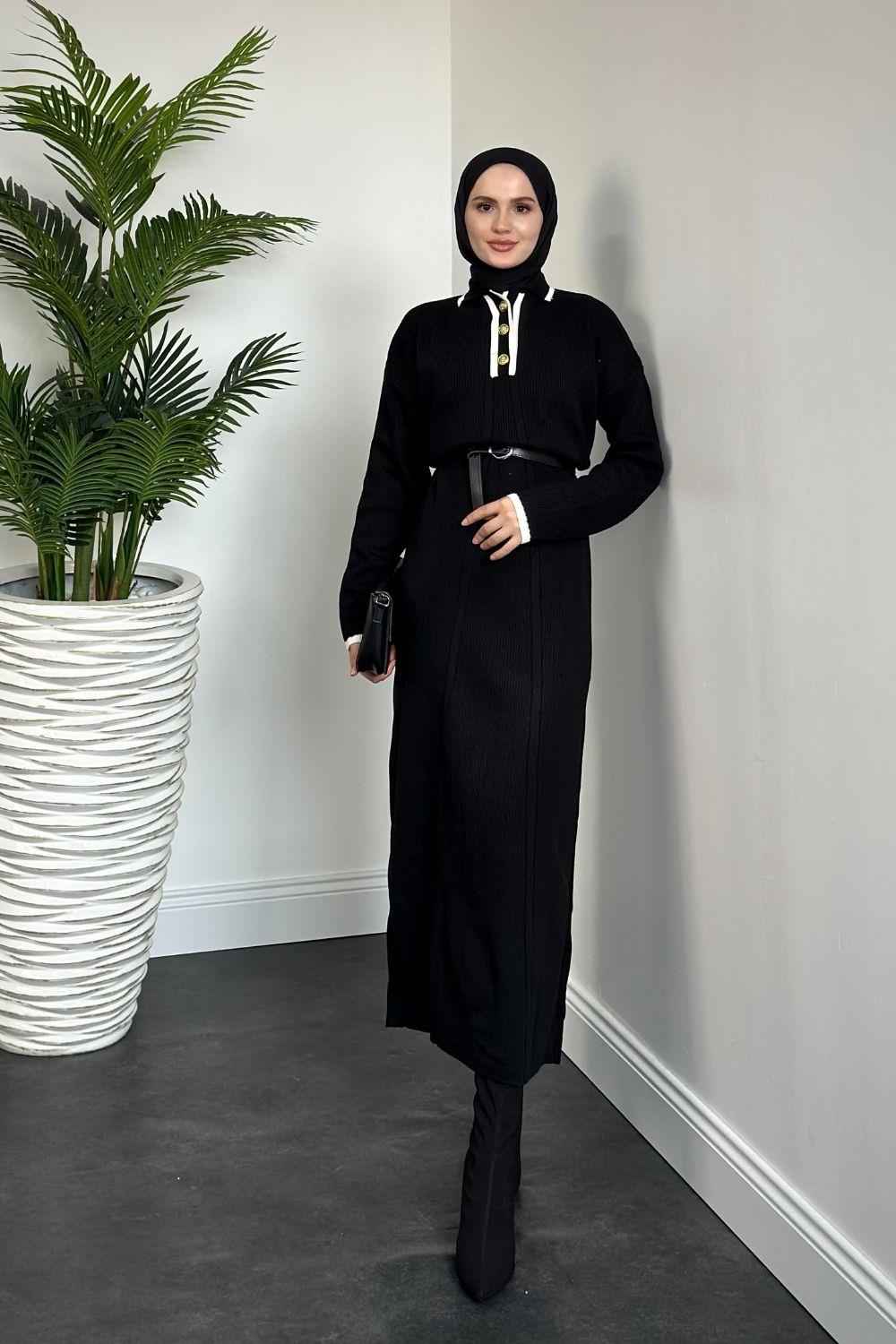 Amiya Düğmeli Triko Elbise Siyah