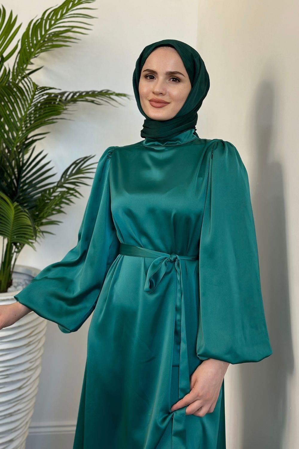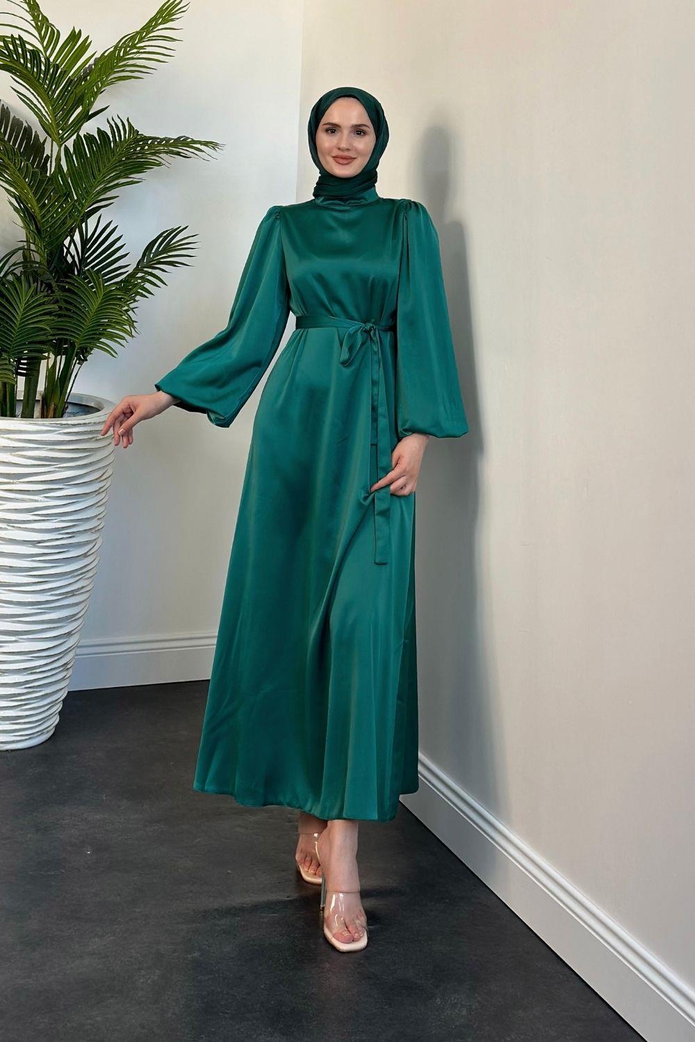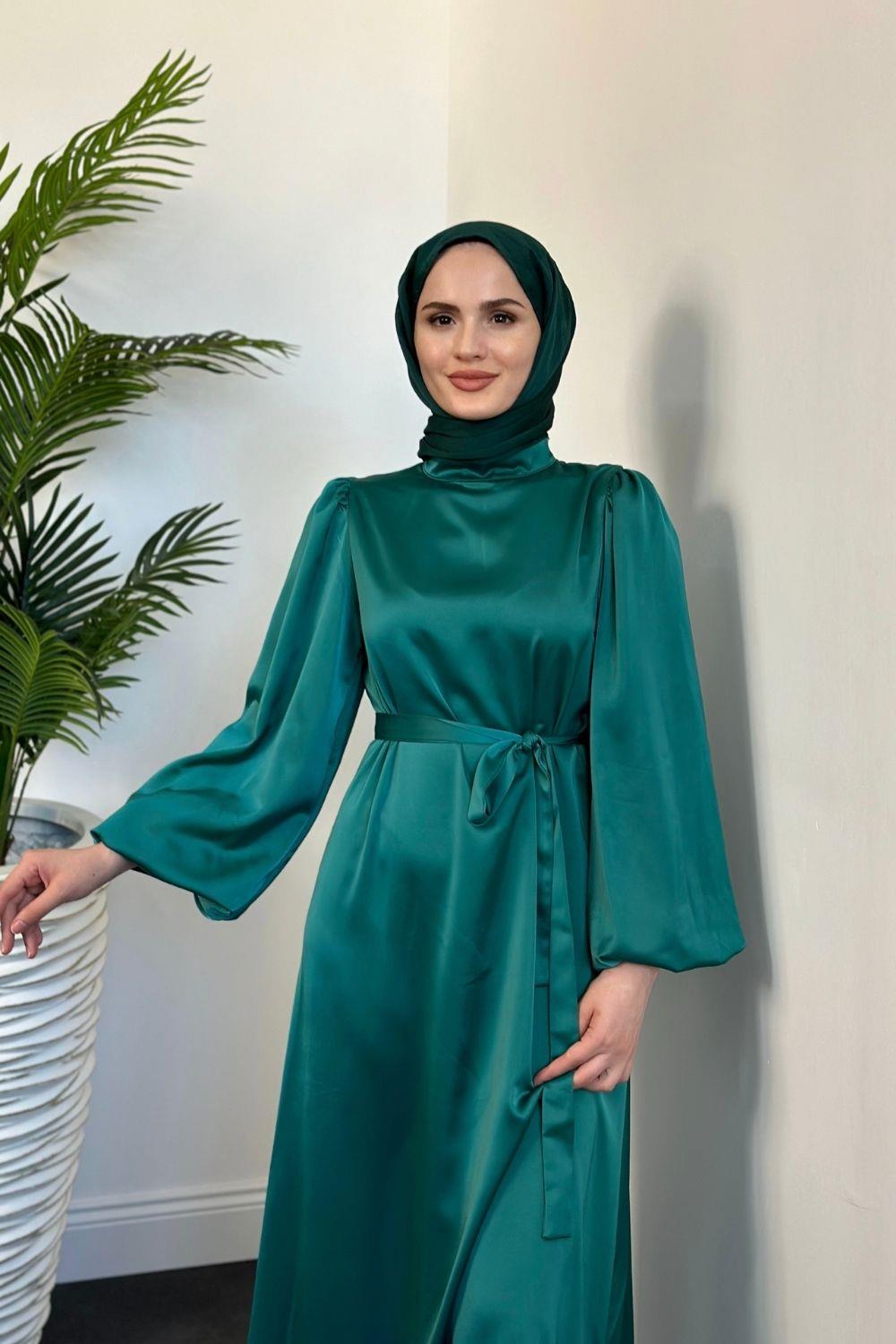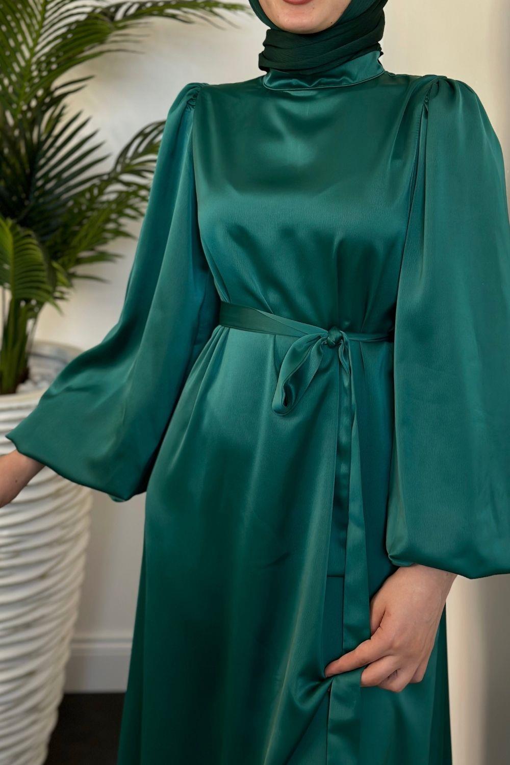 Dimitra Balon Kol Saten Elbise Yeşil