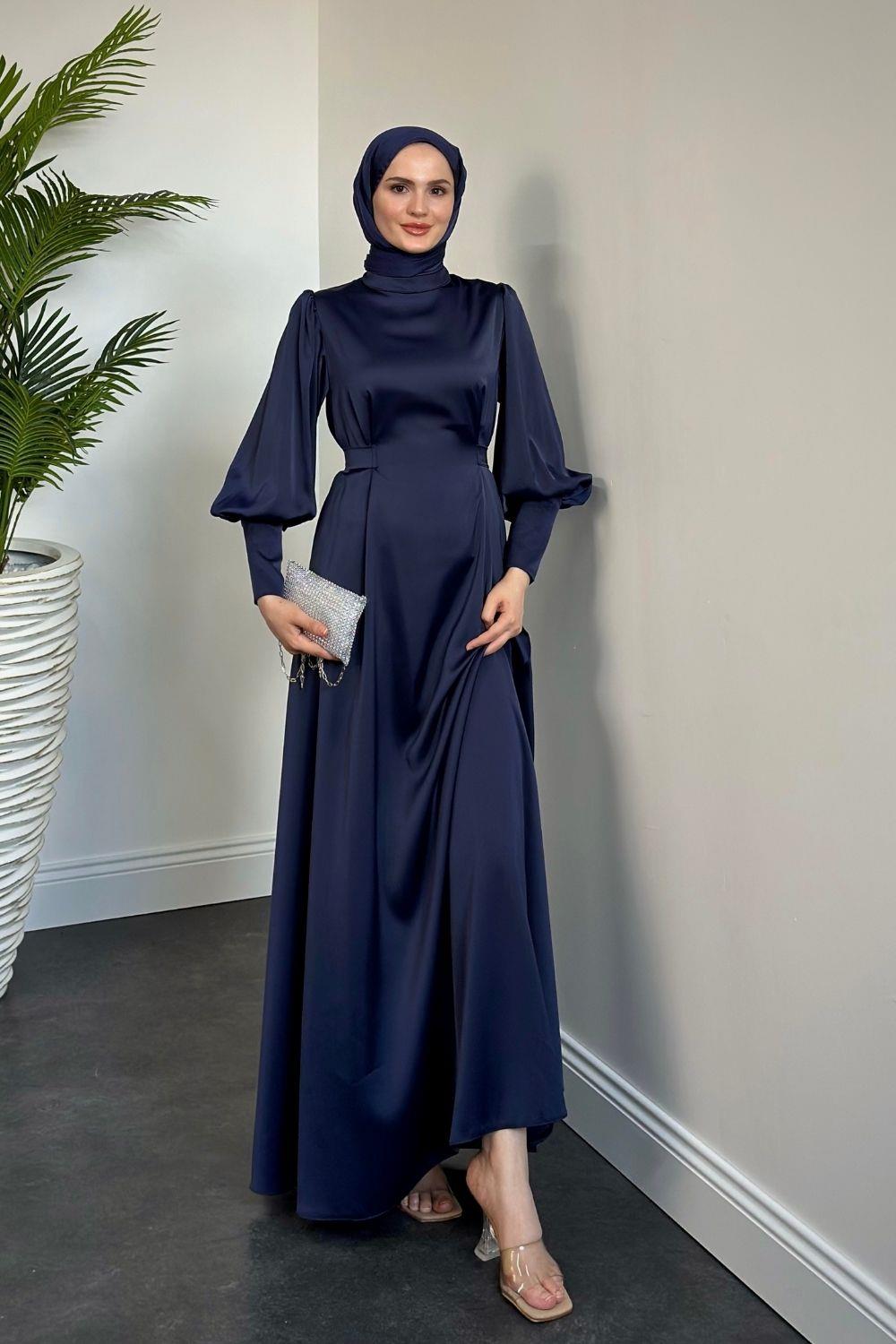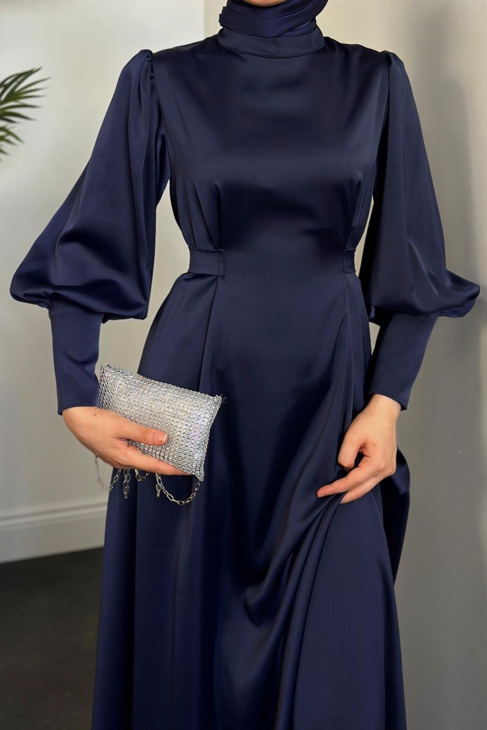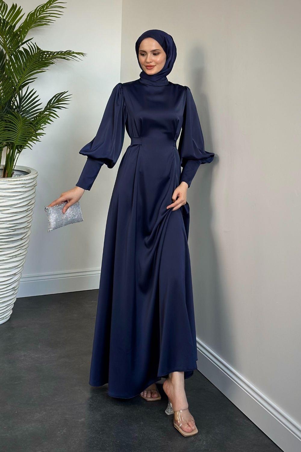 Emora Kuşaklı Saten Elbise Lacivert
