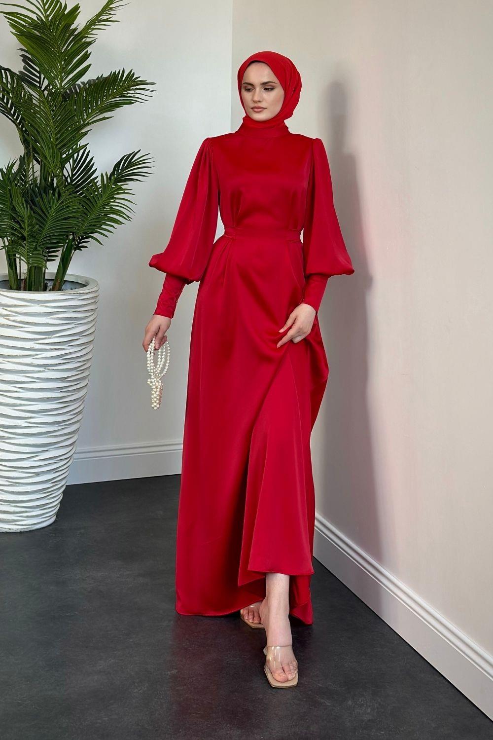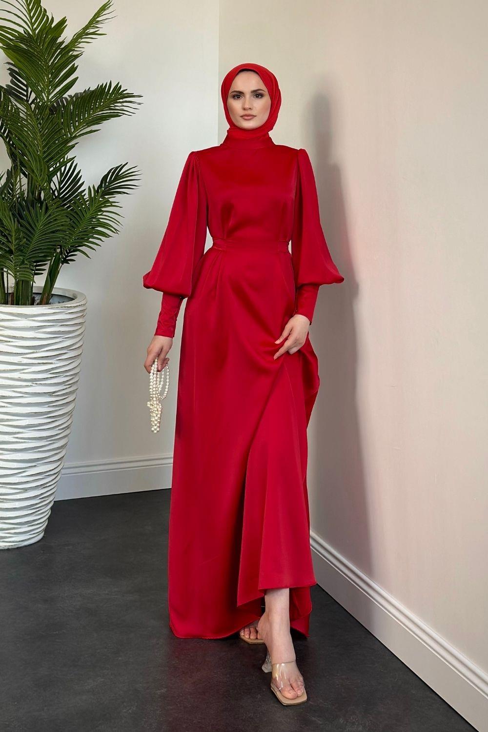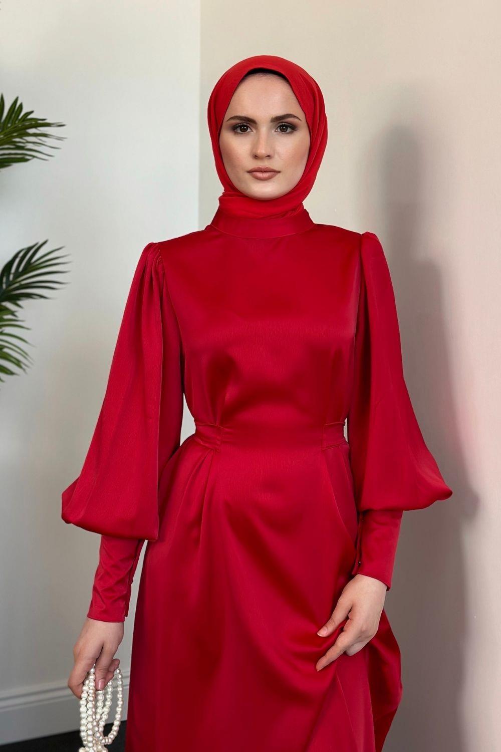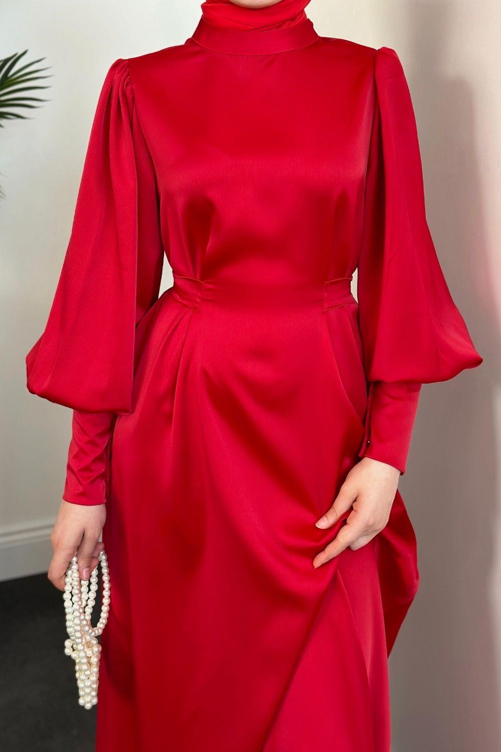Emora Kuşaklı Saten Elbise Kırmızı