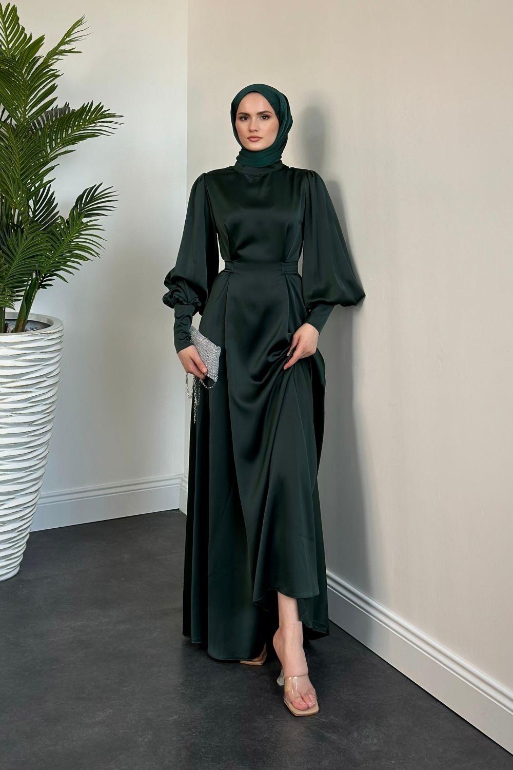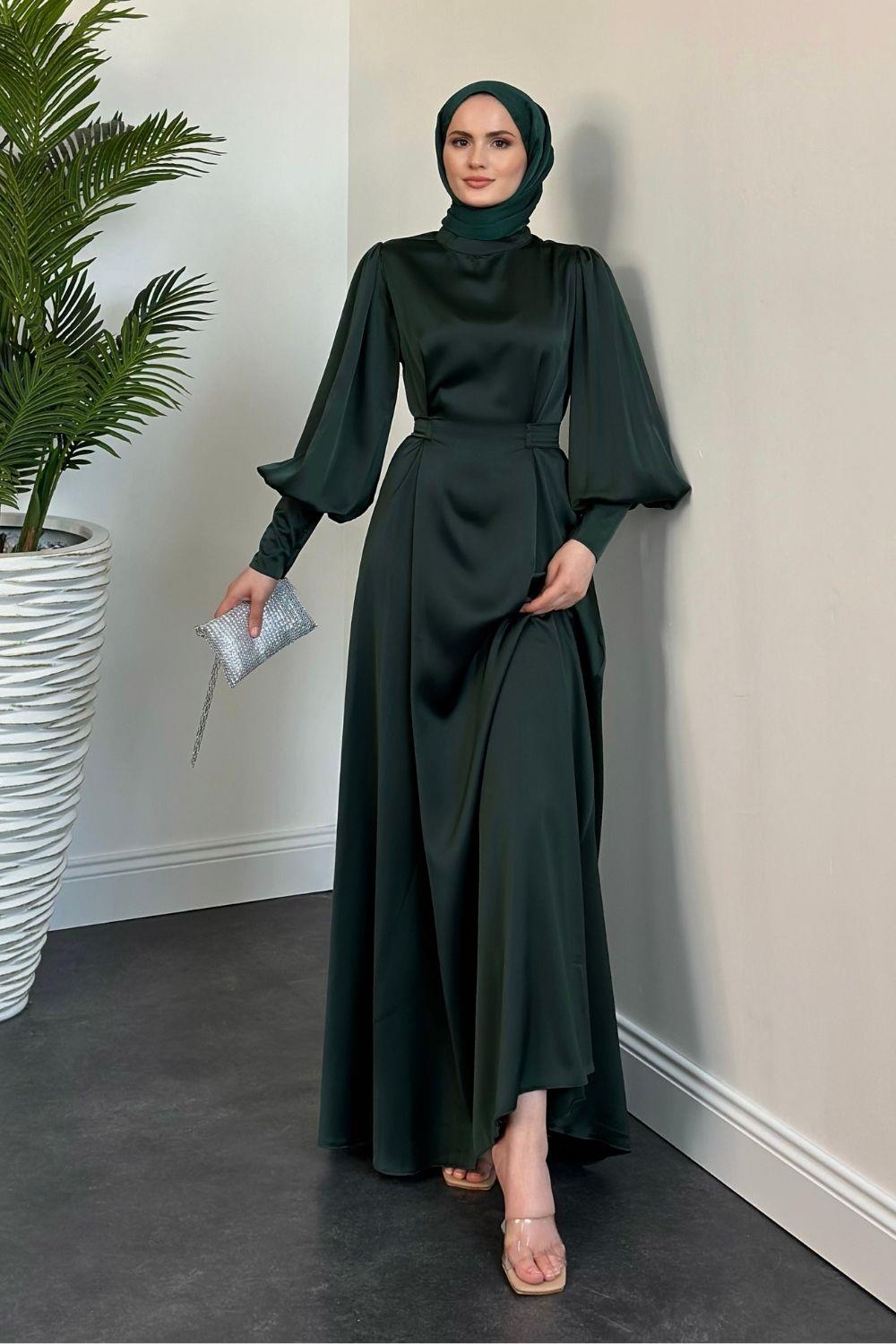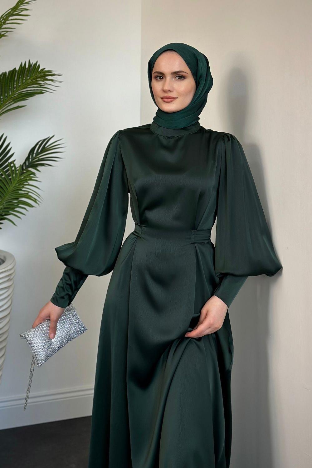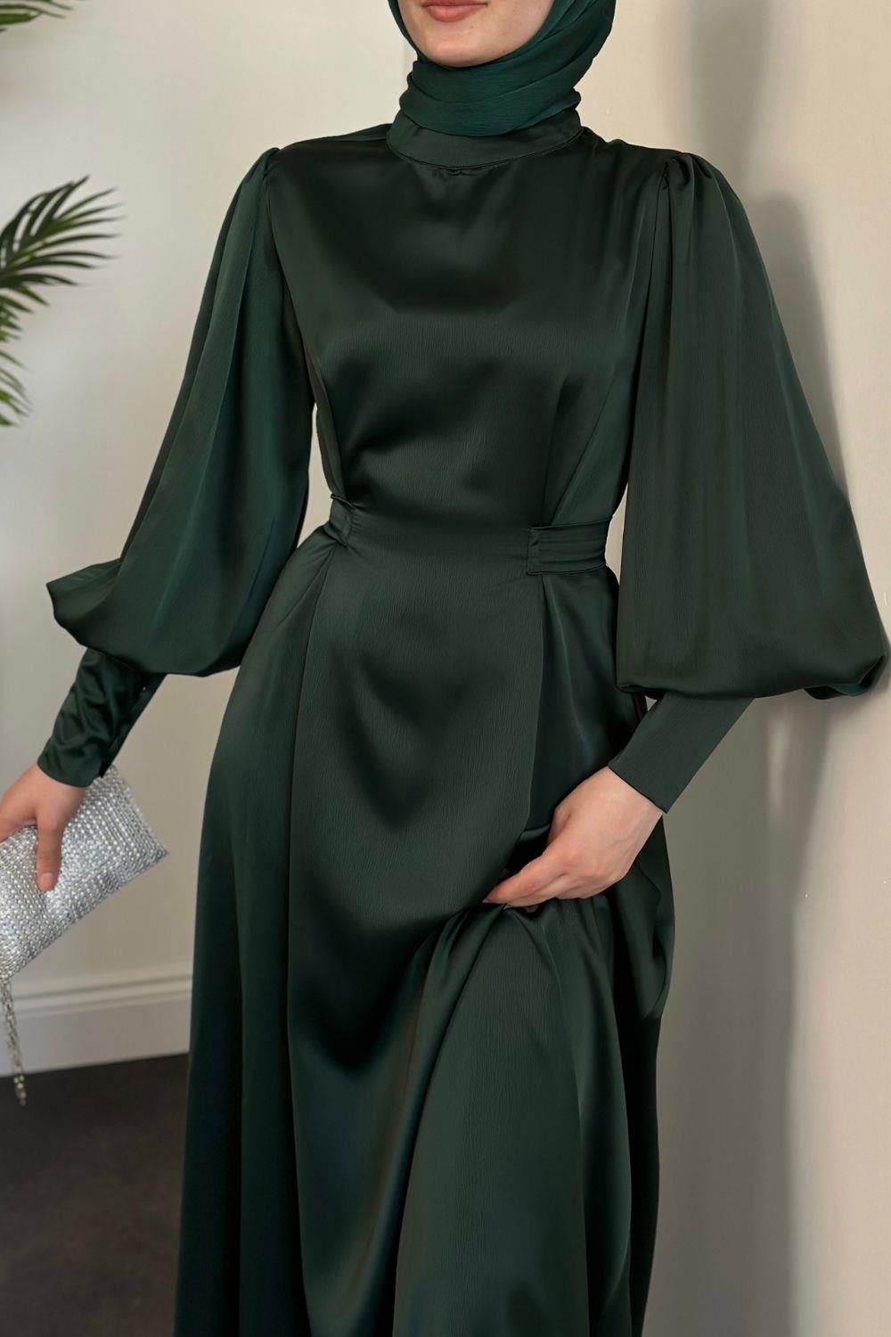 Emora Kuşaklı Saten Elbise Zümrüt