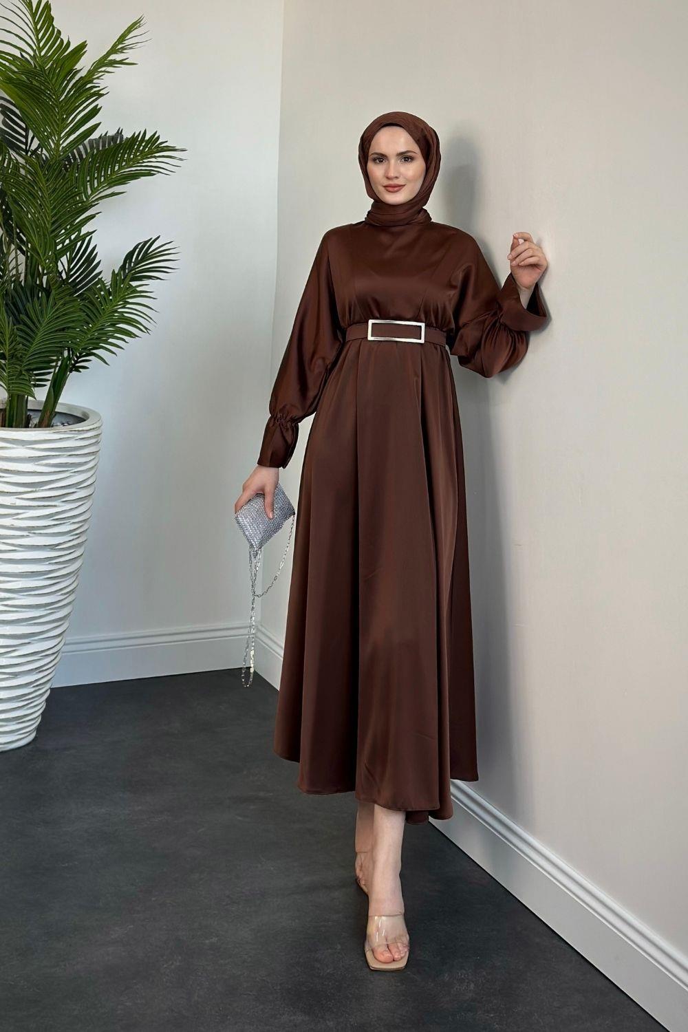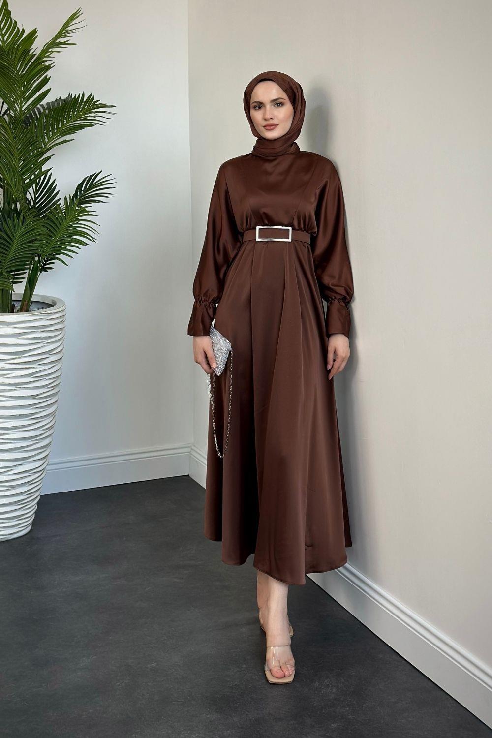 Della Kemerli Saten Elbise Kahverengi