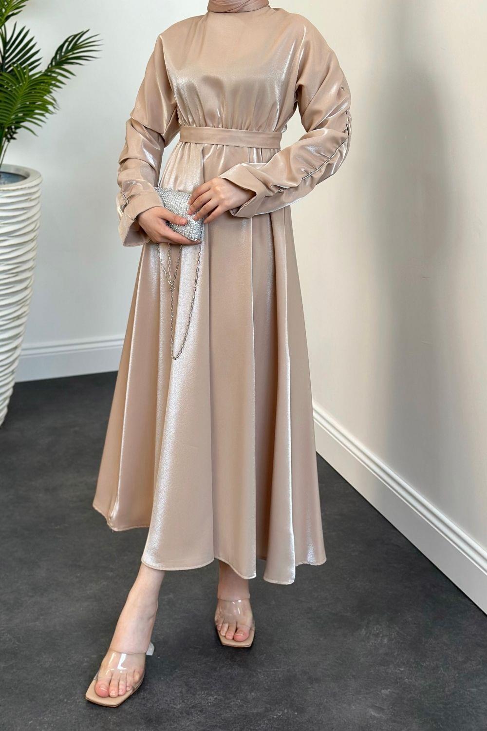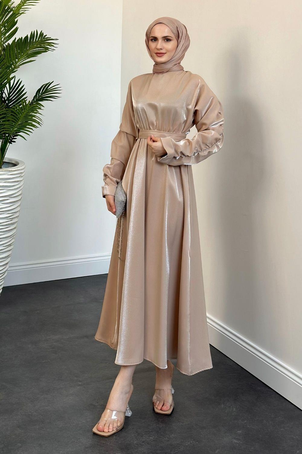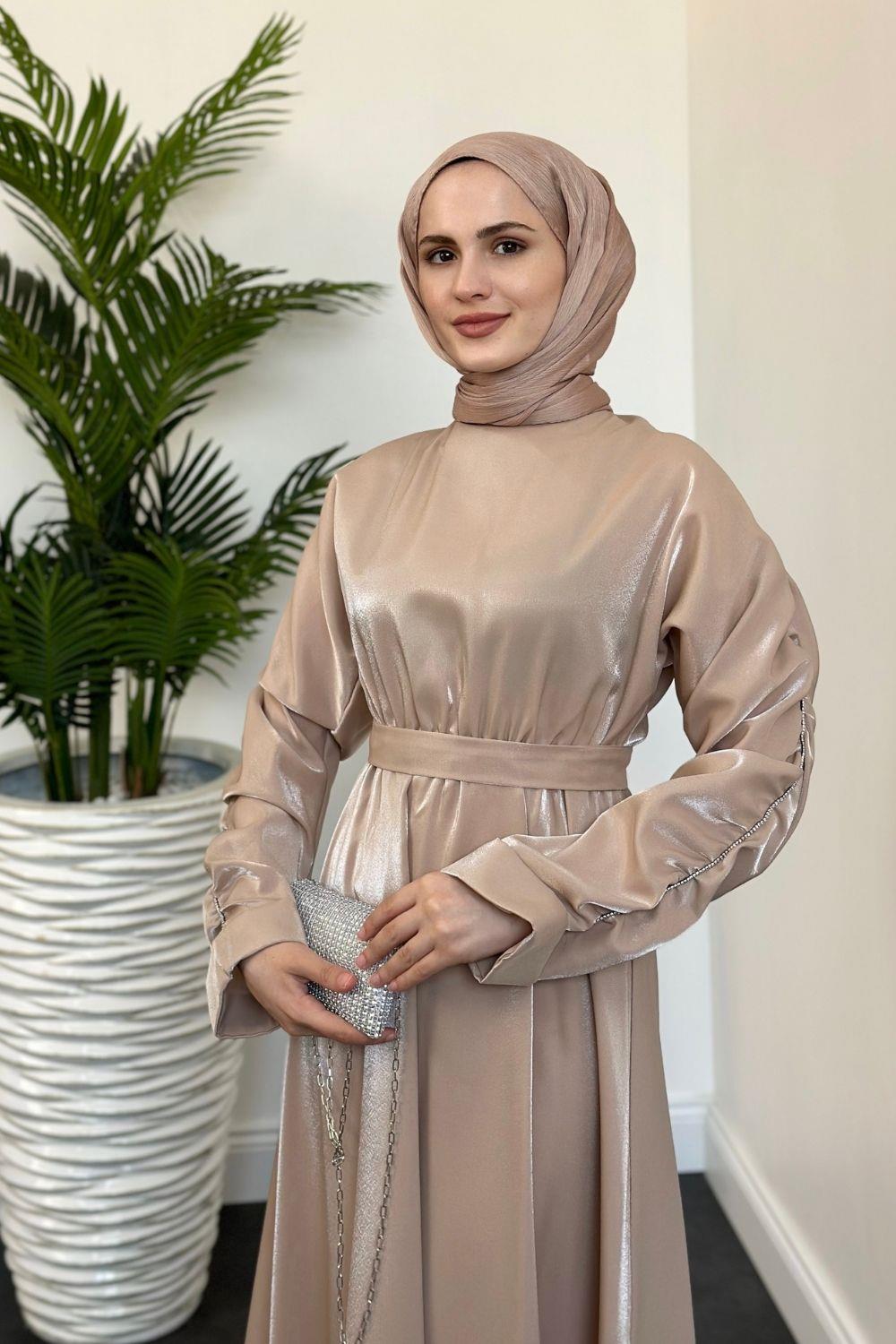 Defne Kolları Taşlı Elbise Vizon