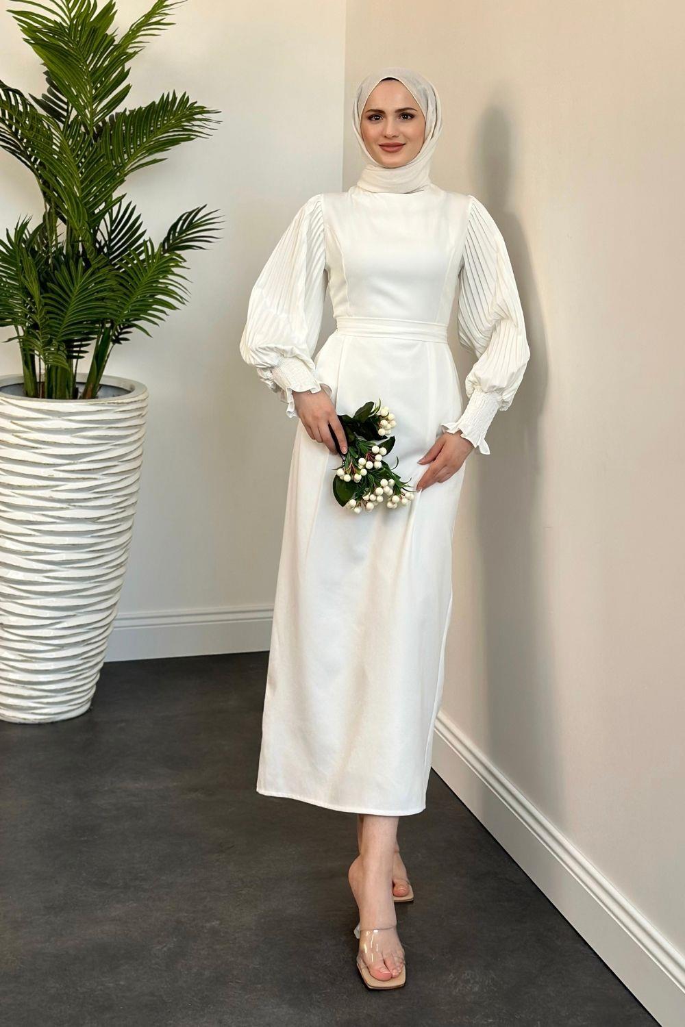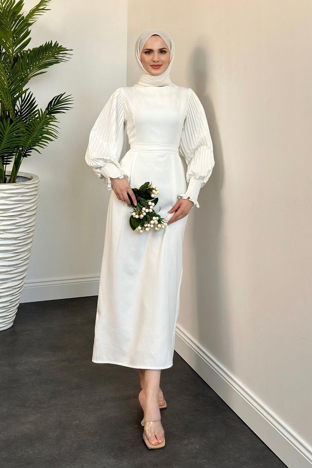 Pia Kolları Pliseli Kalem Elbise Beyaz