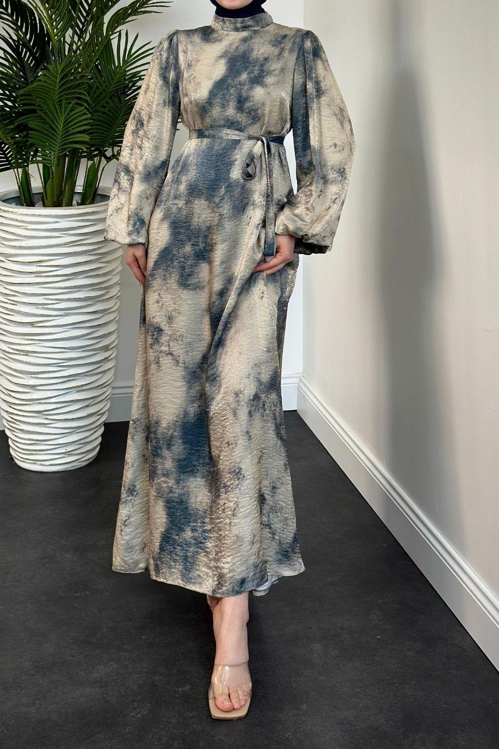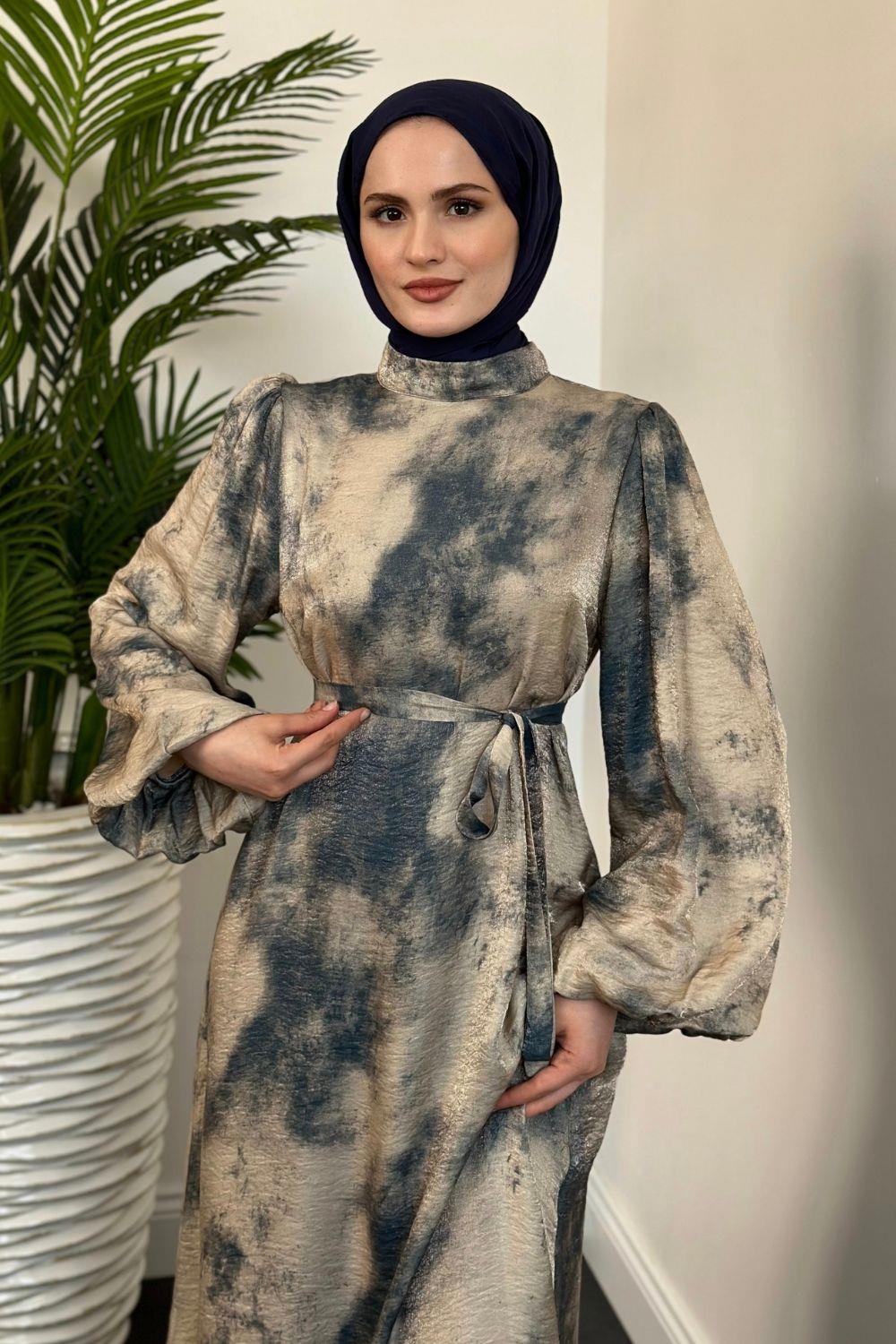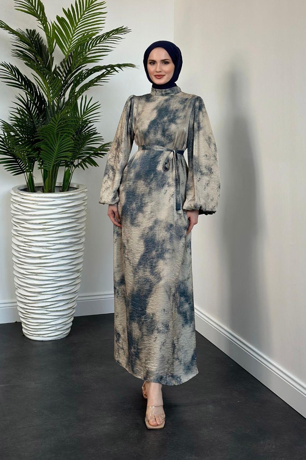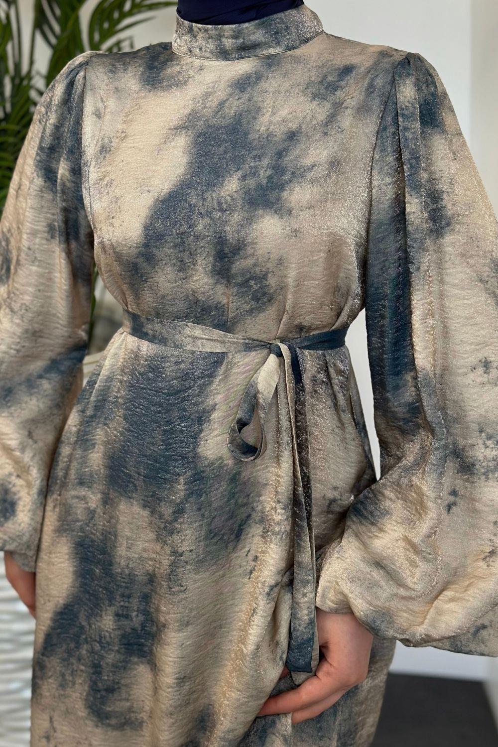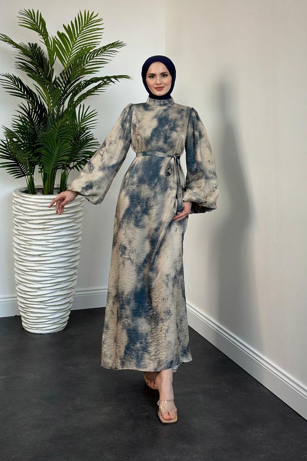 Benna Ebru Desen Balon Kol Elbise Lacivert