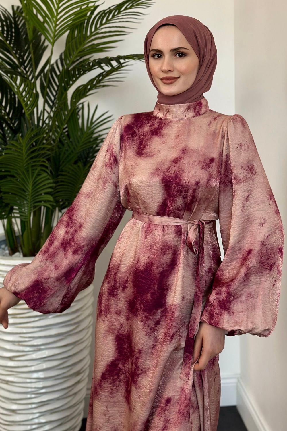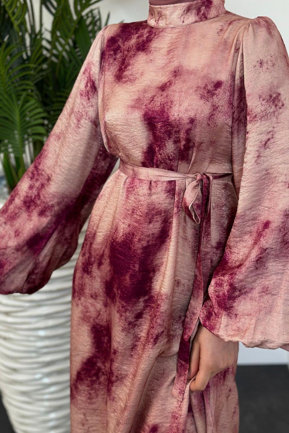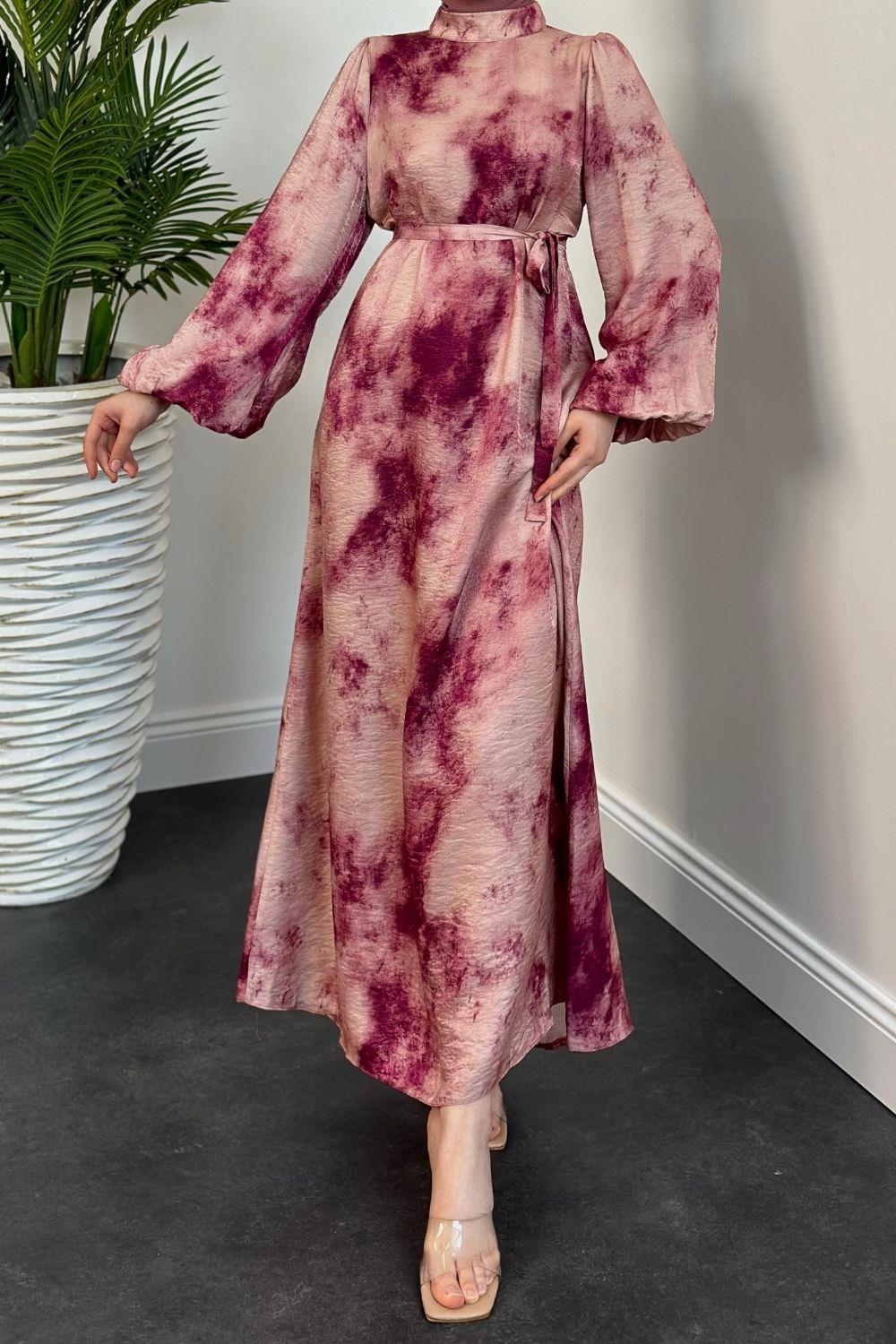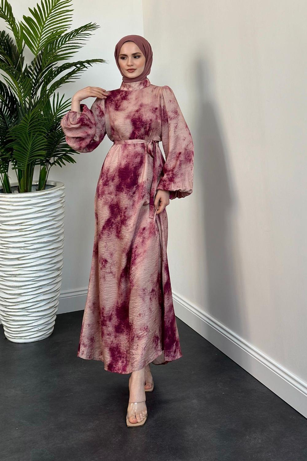 Benna Ebru Desen Balon Kol Elbise Fuşya