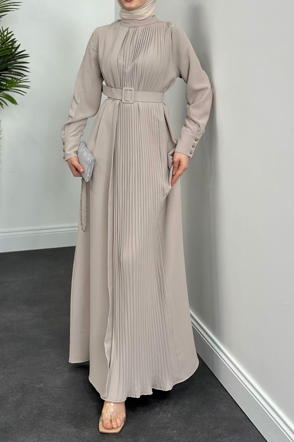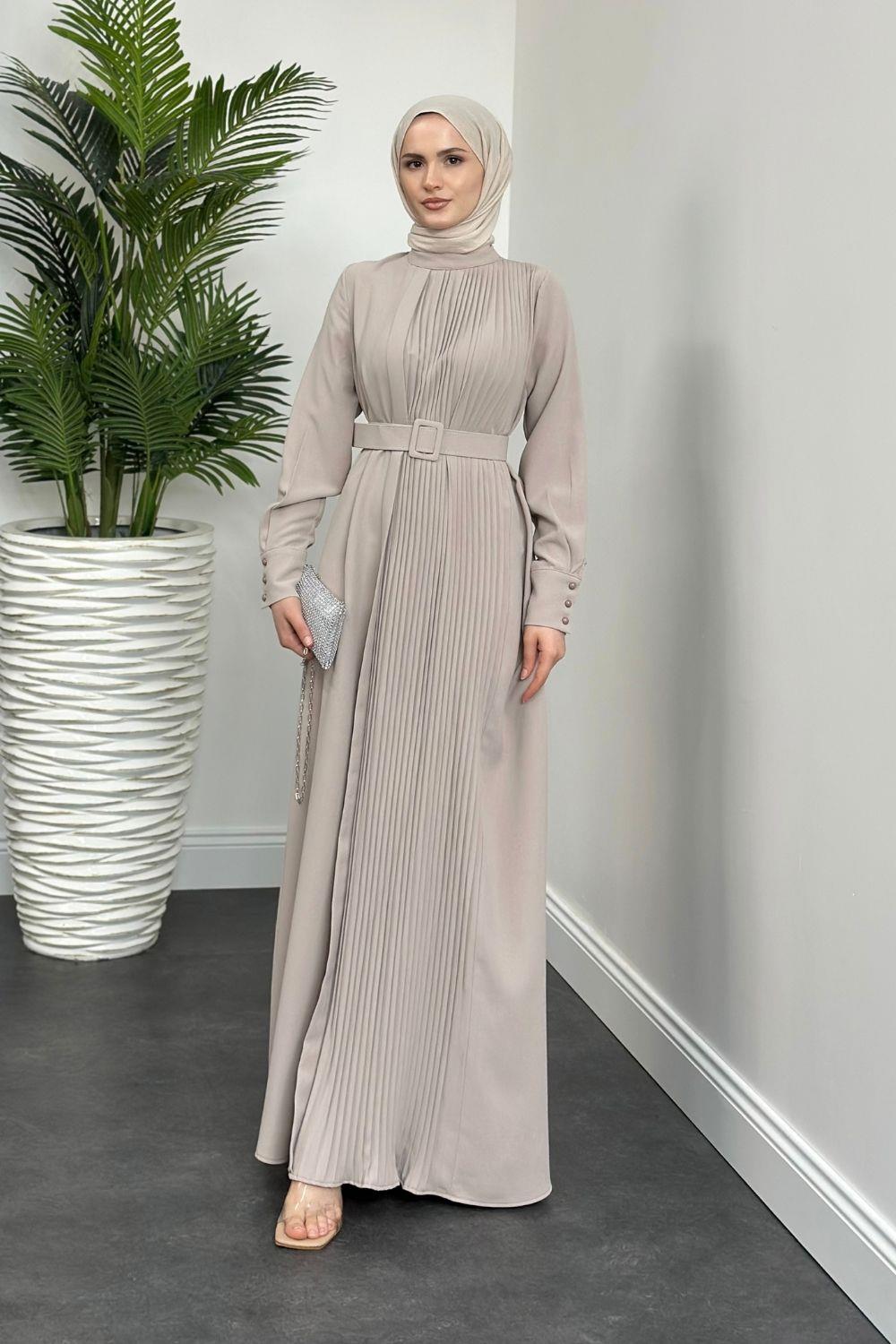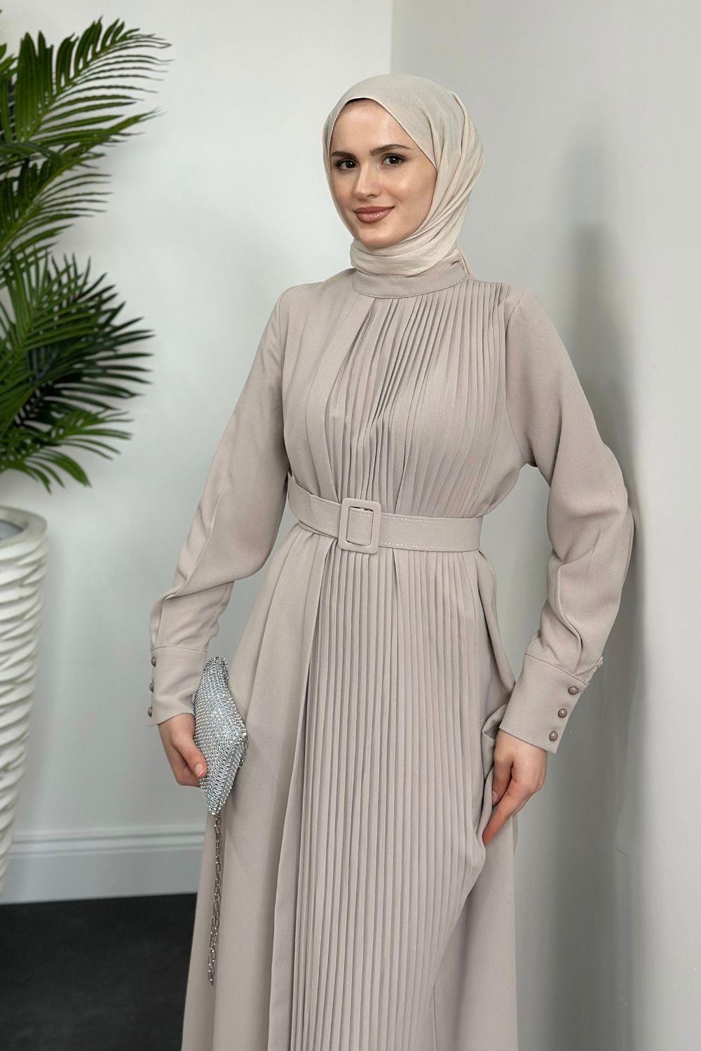 Belur Kemerli Krep Elbise Krem