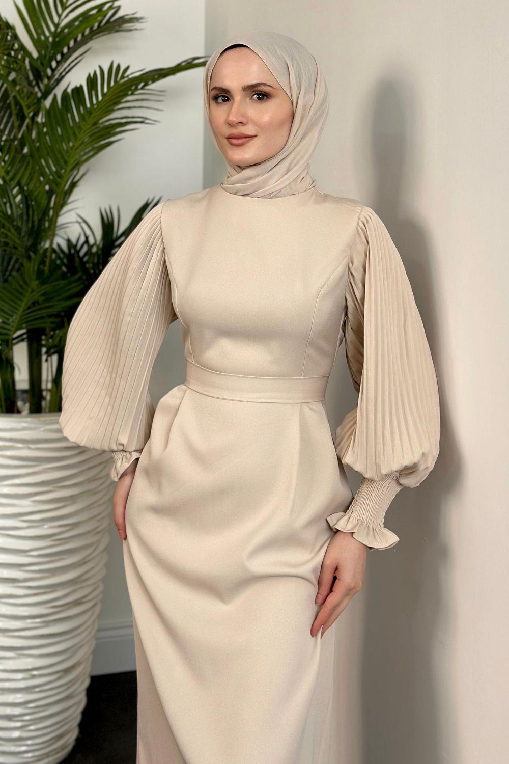 Pia Kolları Pliseli Kalem Elbise Krem