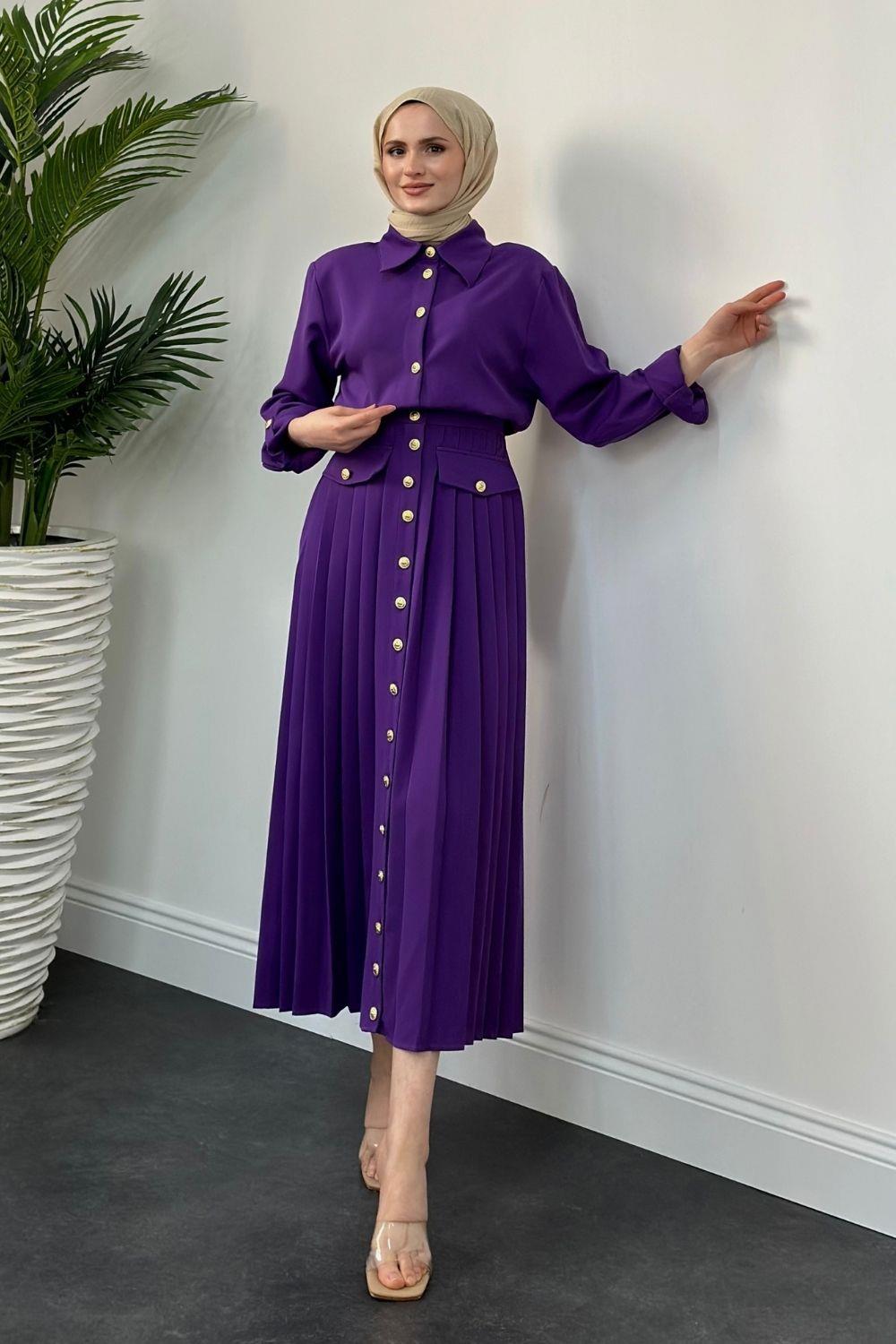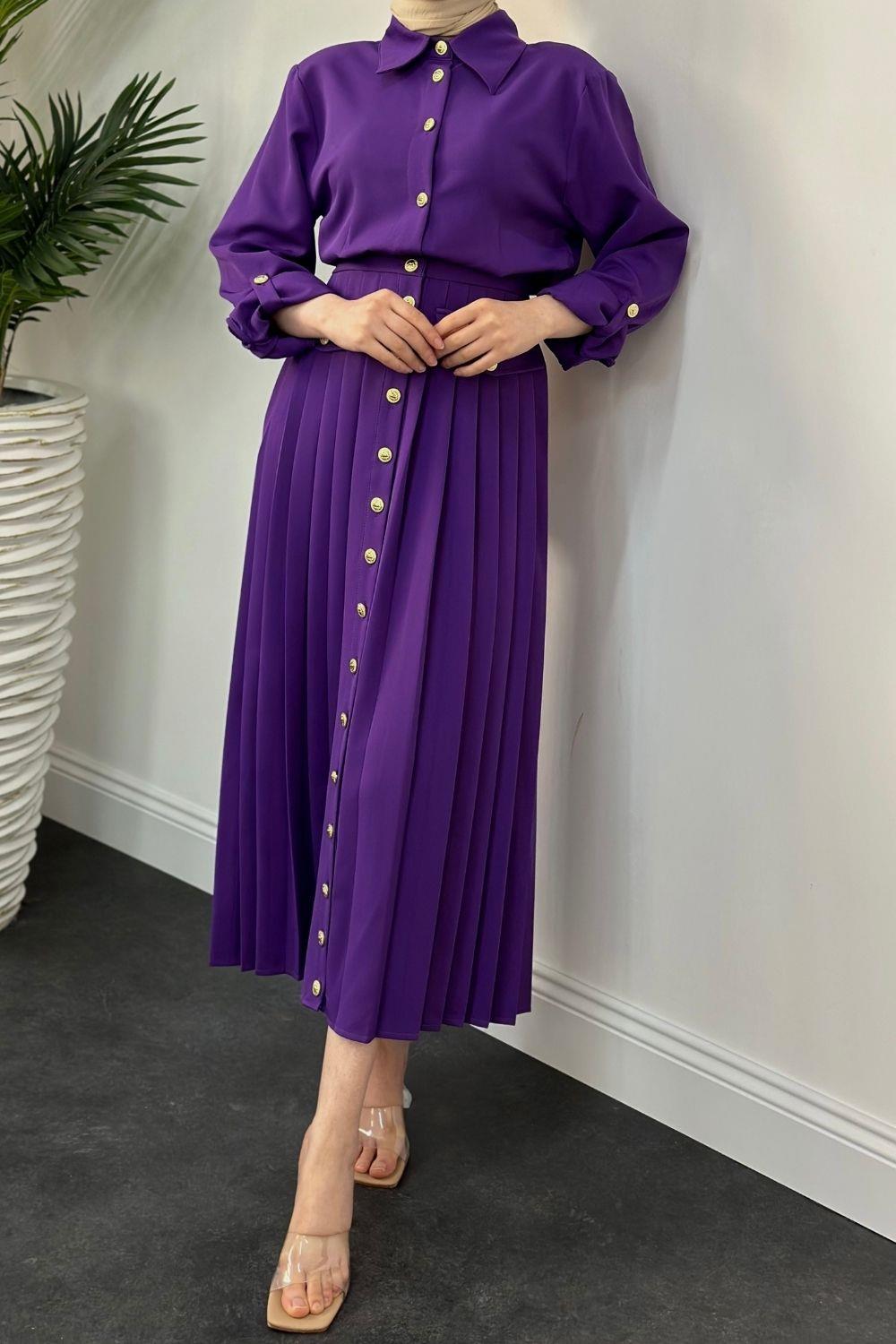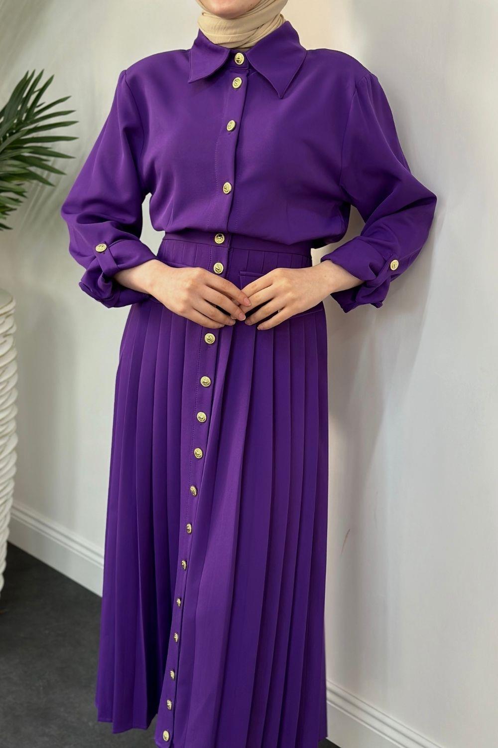 Sera Düğmeli Plise Elbise Mor