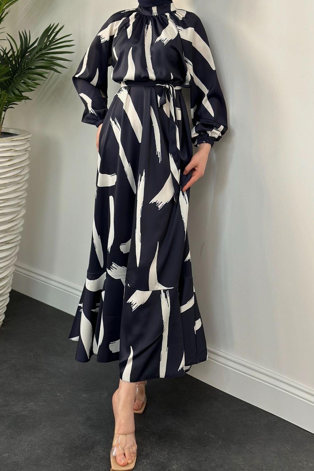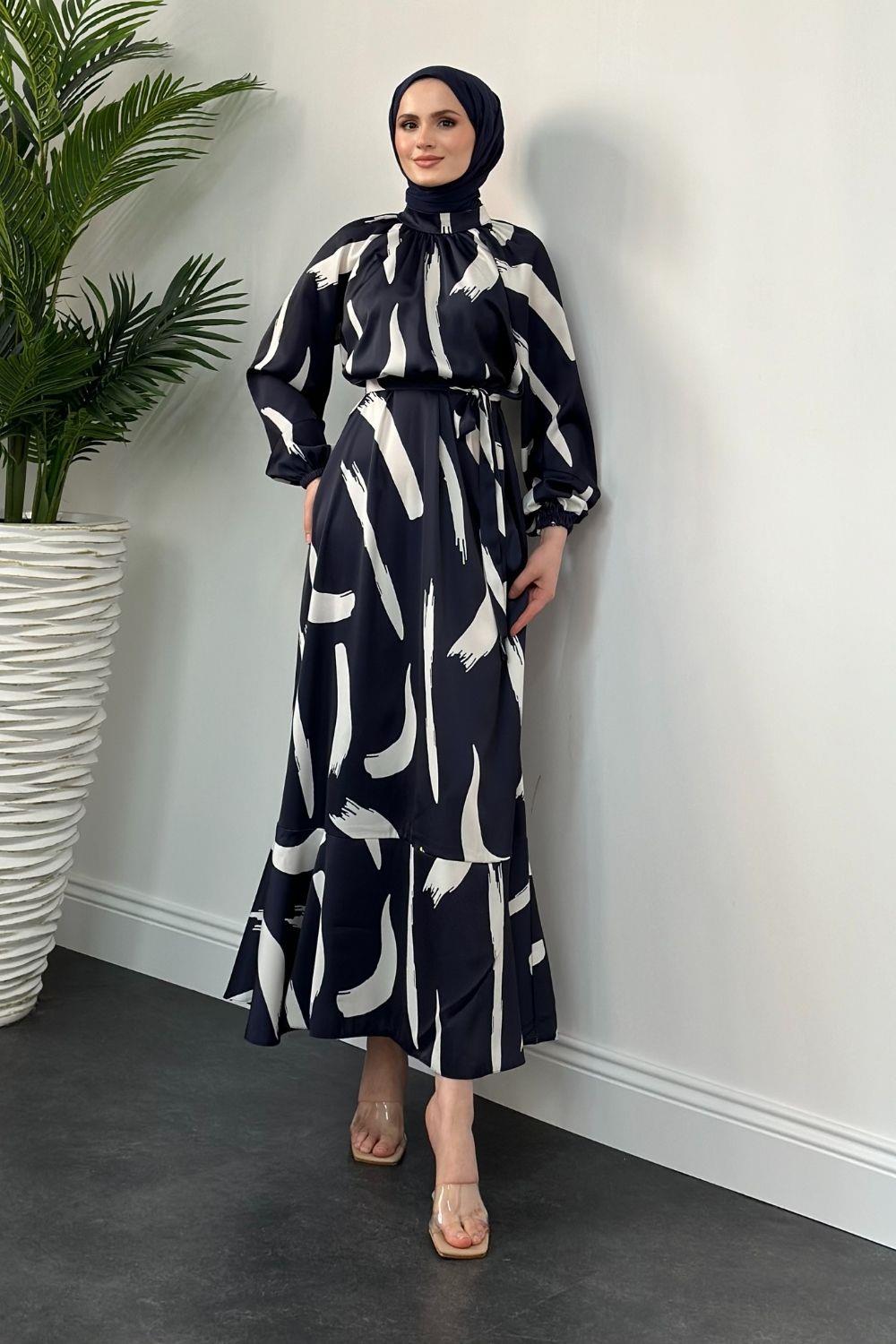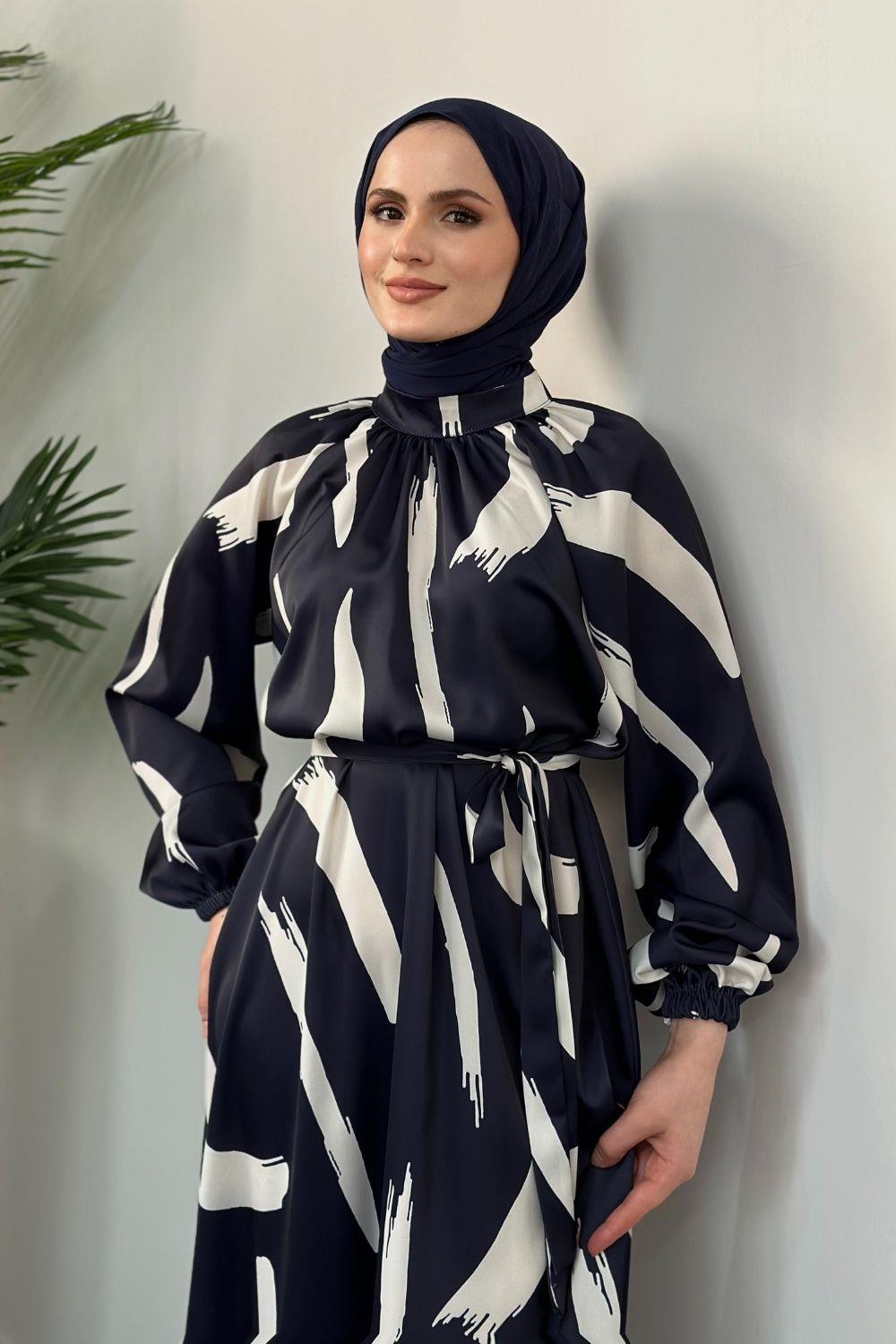 Angel Desenli Saten Elbise Lacivert
