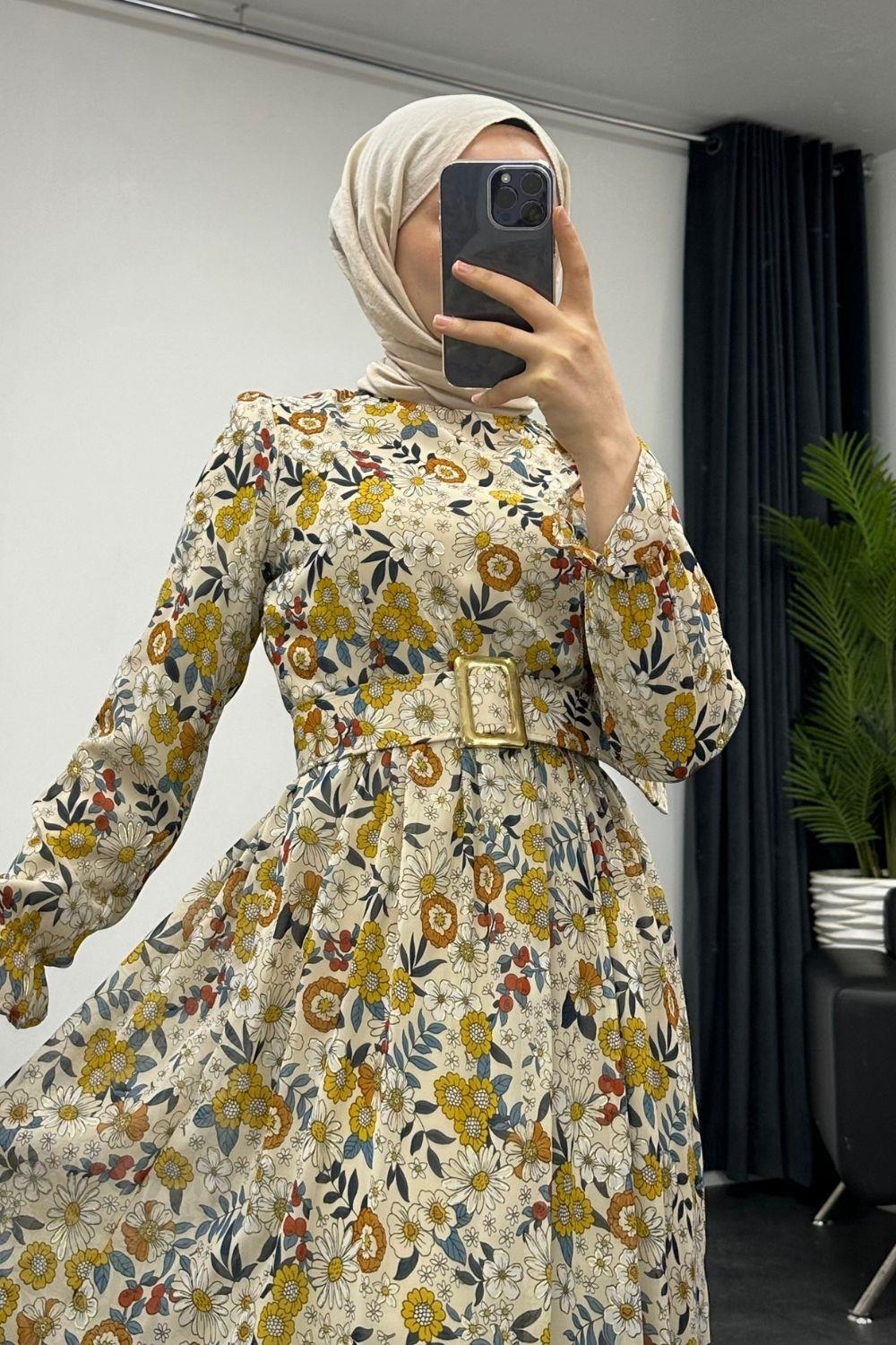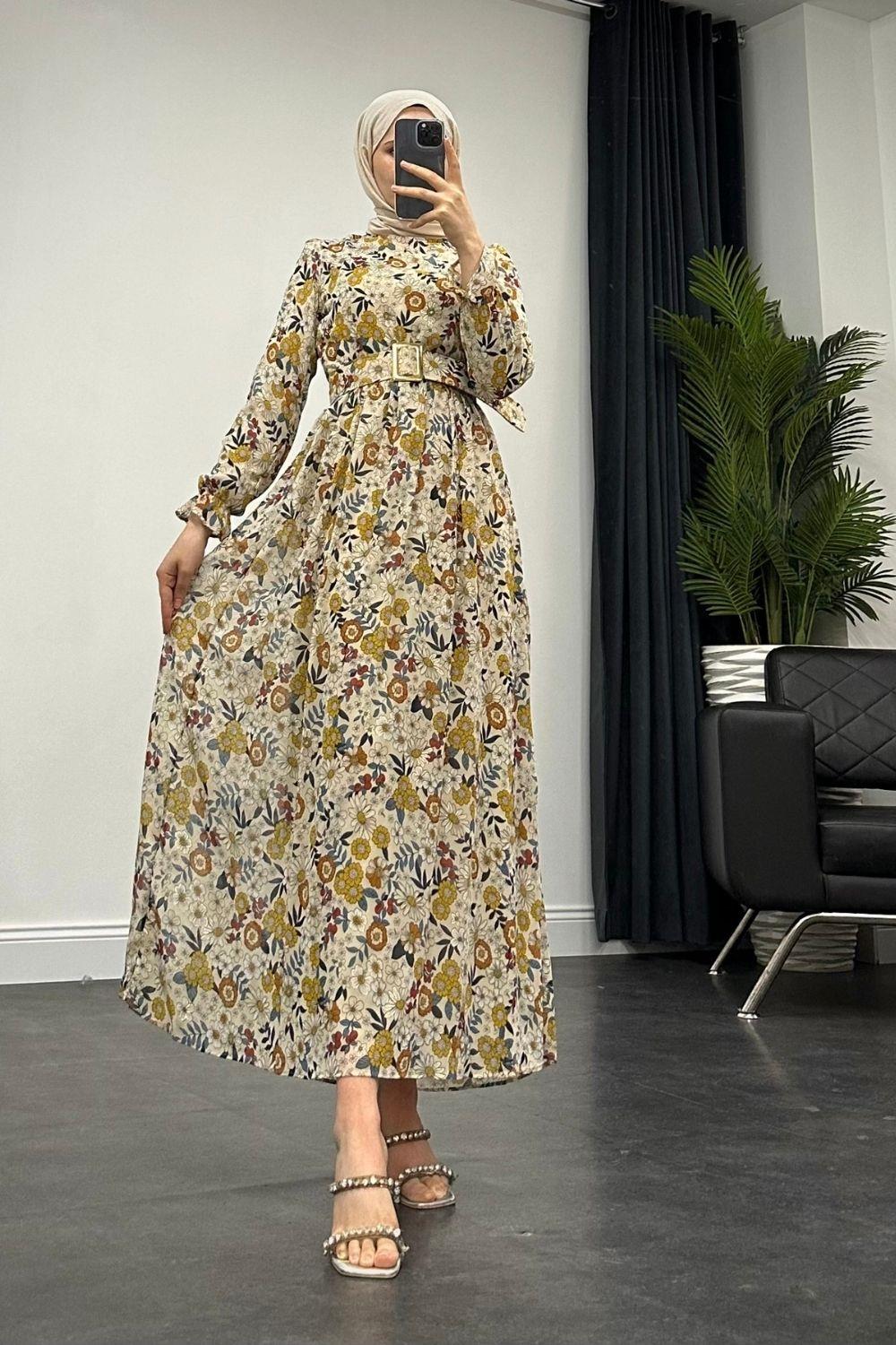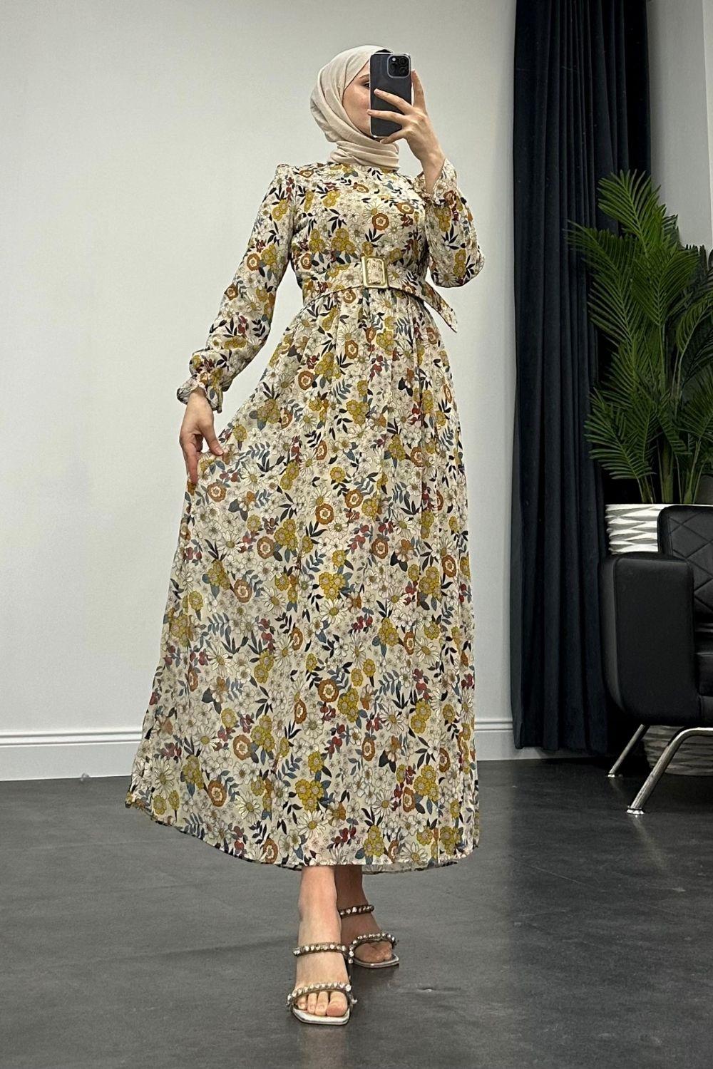 Pura Kalın Kemerli Çiçek Desen Elbise Krem