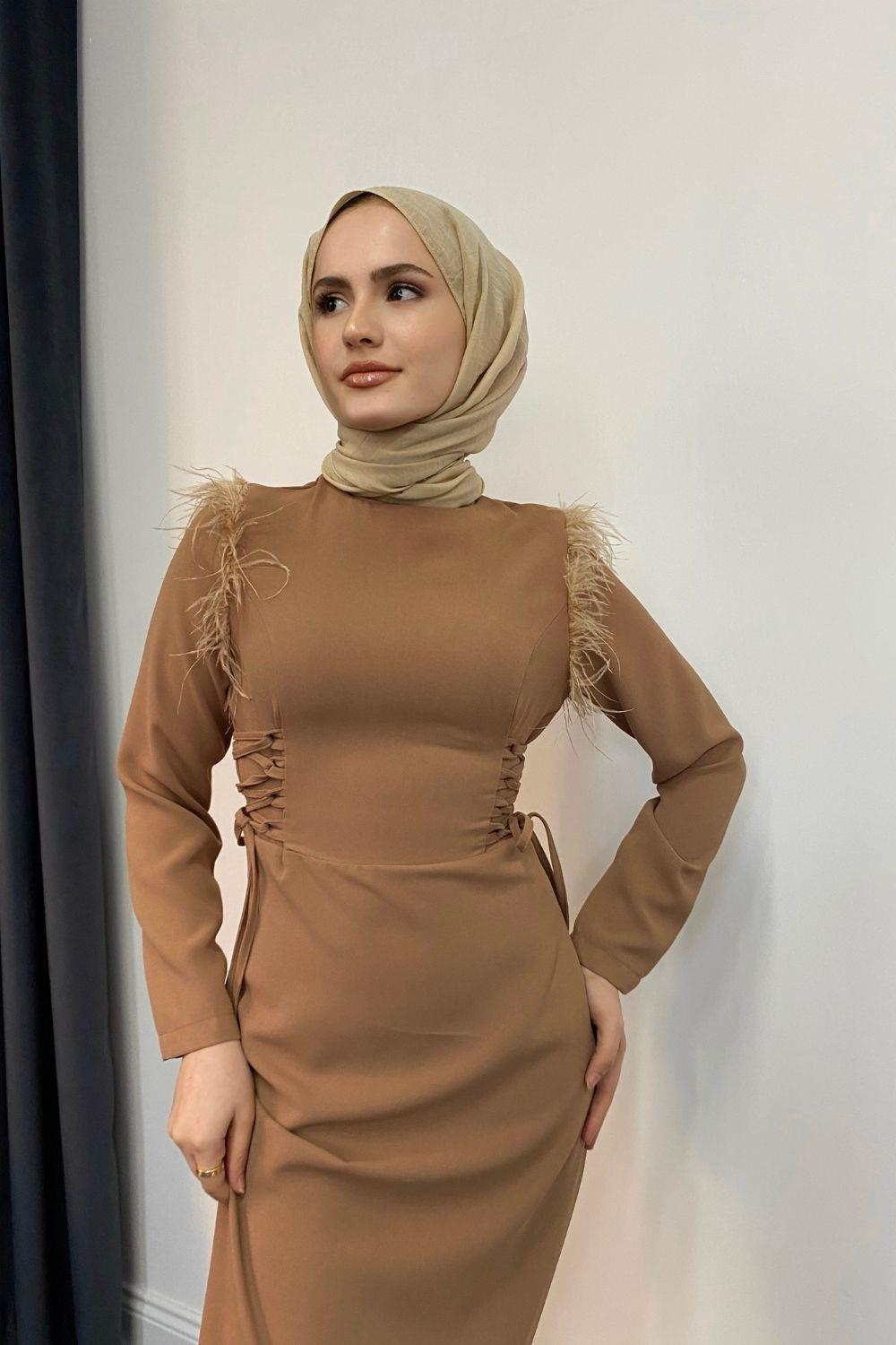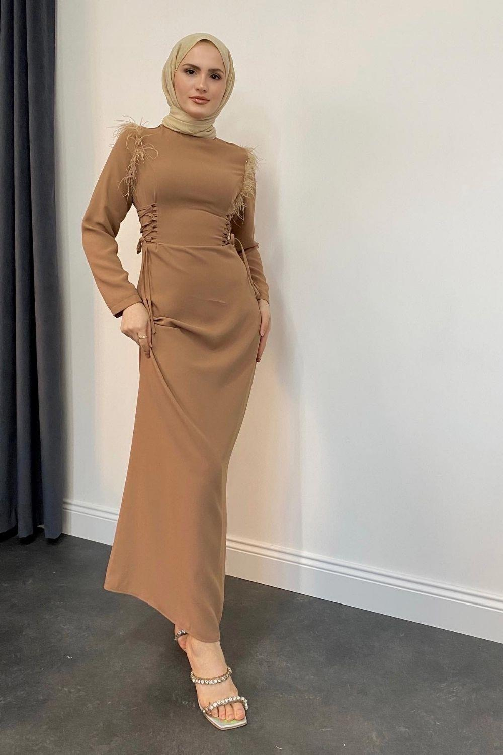 Yolanta Omzu Tüylü Abiye SütlüKahve