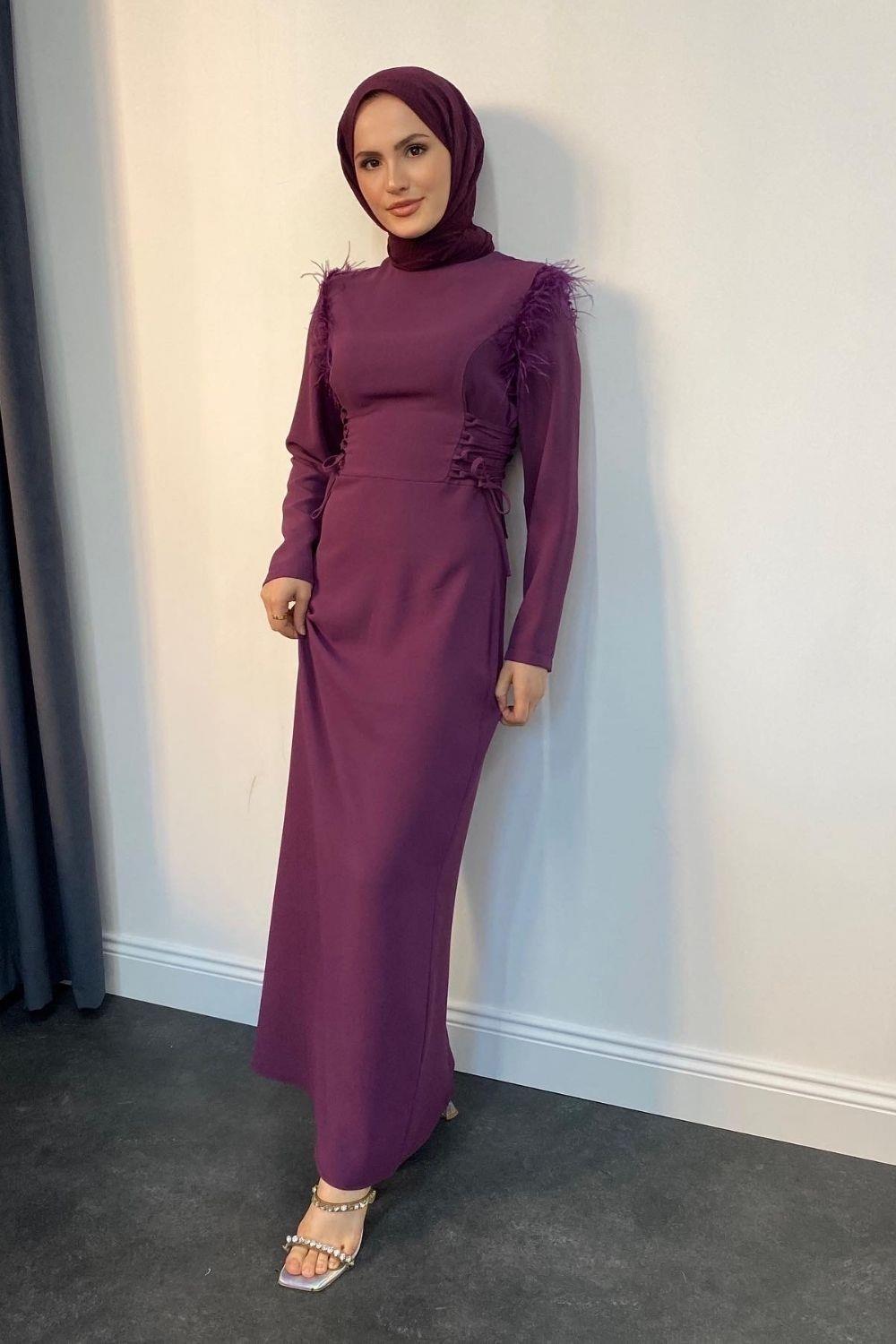 Yolanta Omzu Tüylü Abiye Mürdüm