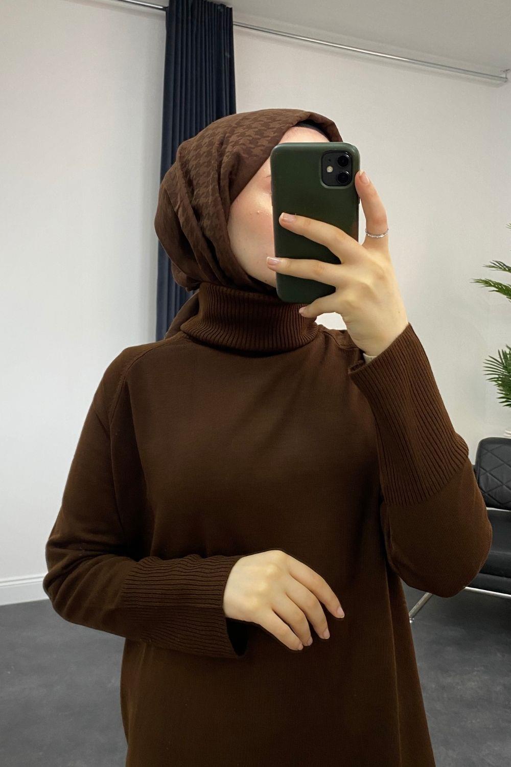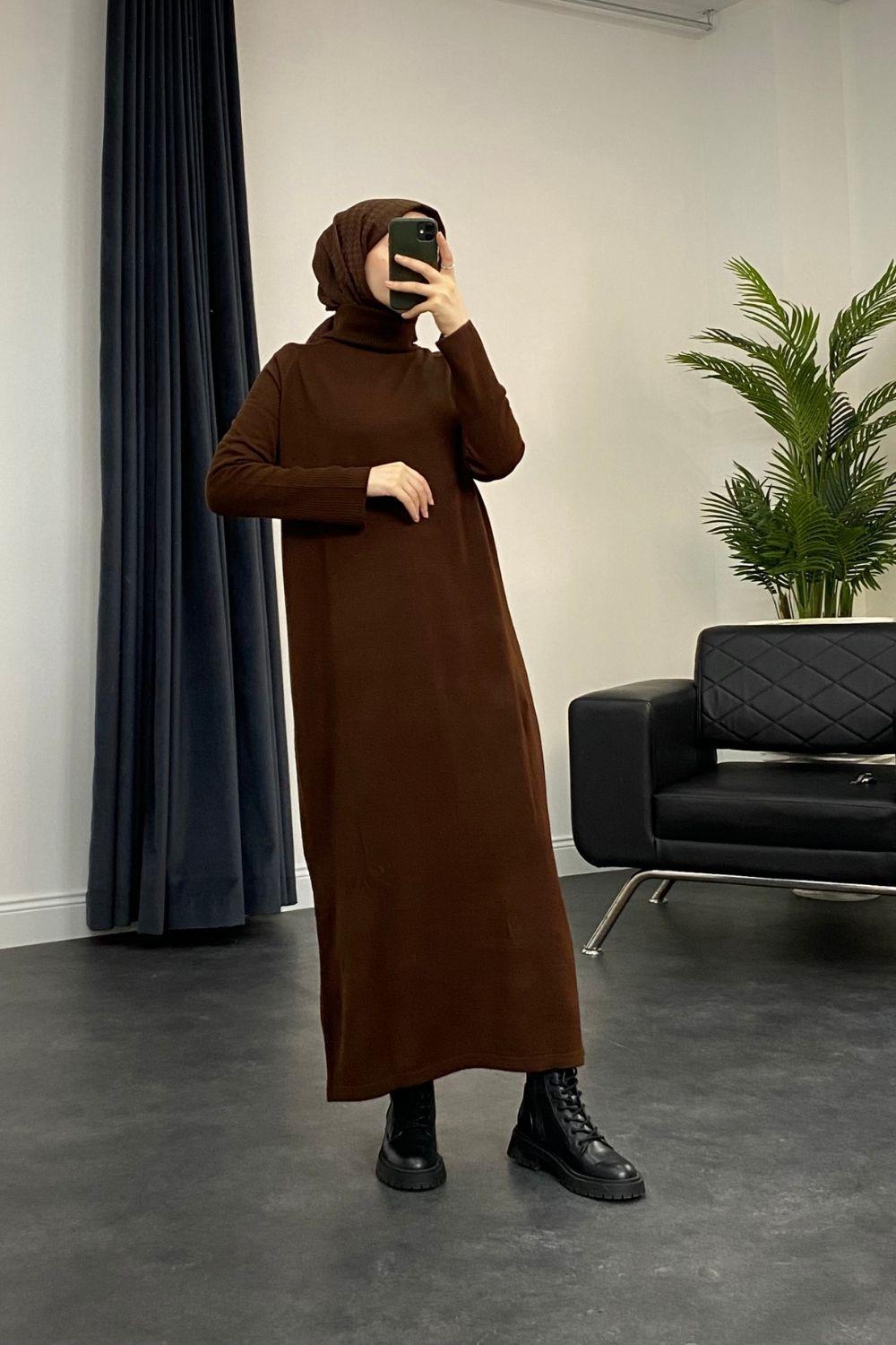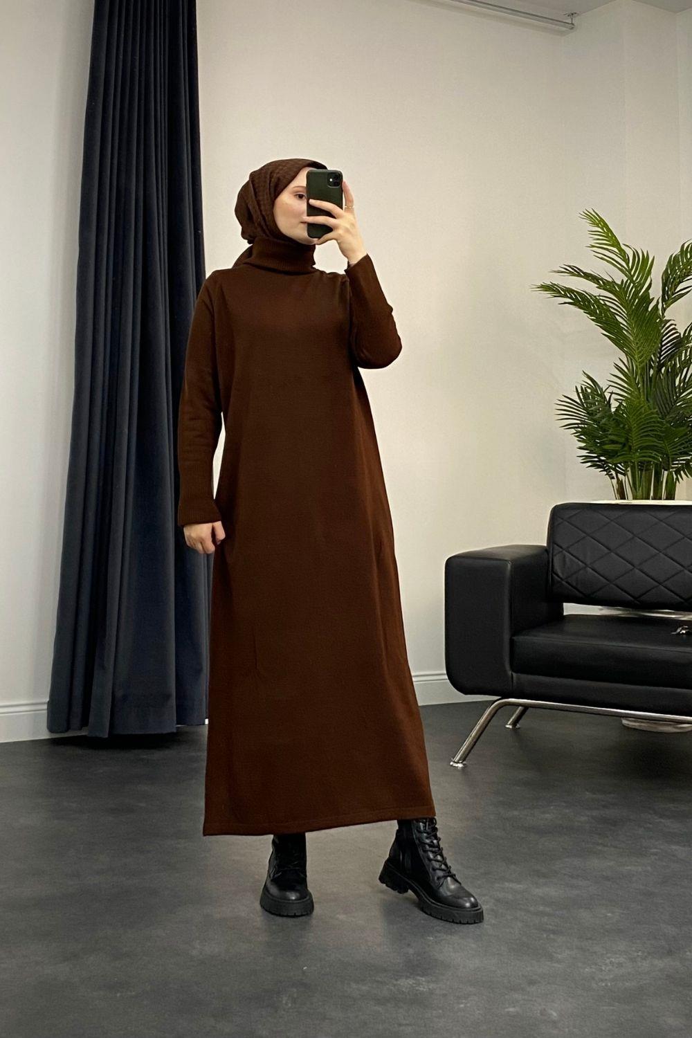 Boğazlı Triko Elbise Kahverengi