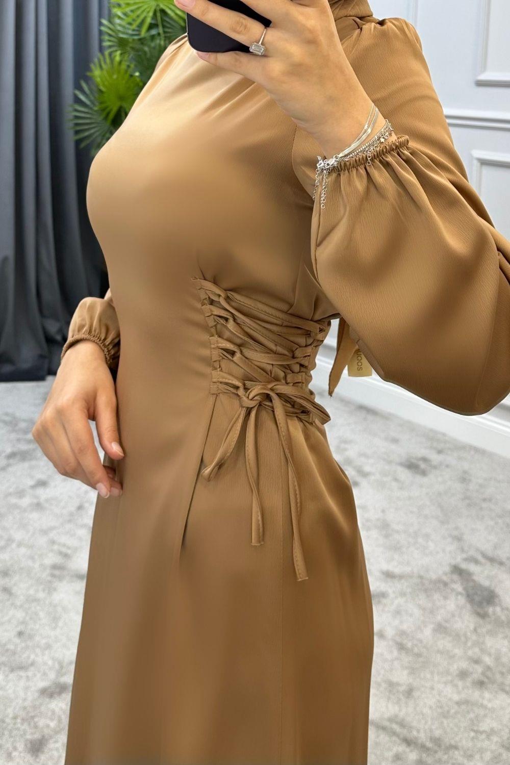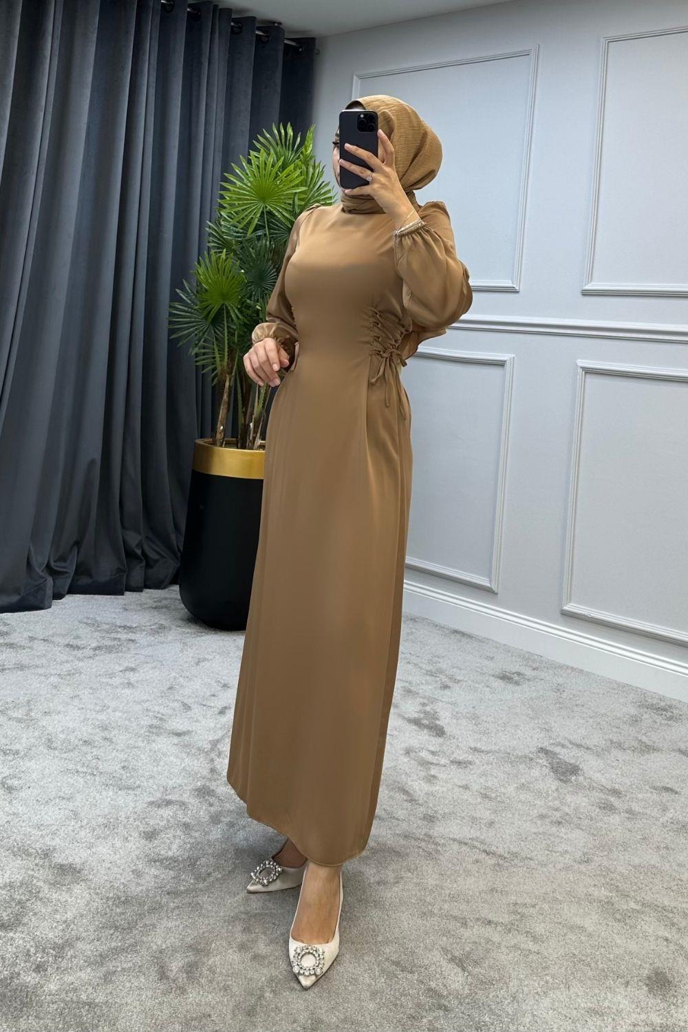 Elenor Belden Bağlamalı Saten Tesettür Elbise Vizon
