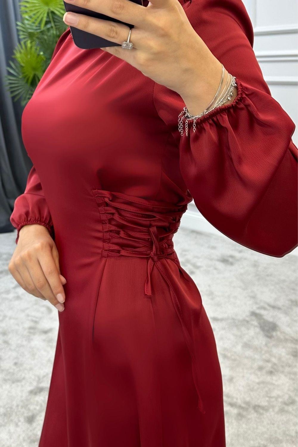Elenor Belden Bağlamalı Saten Tesettür Elbise Bordo