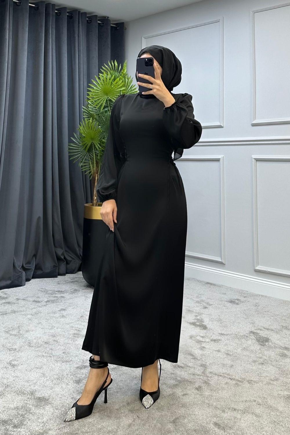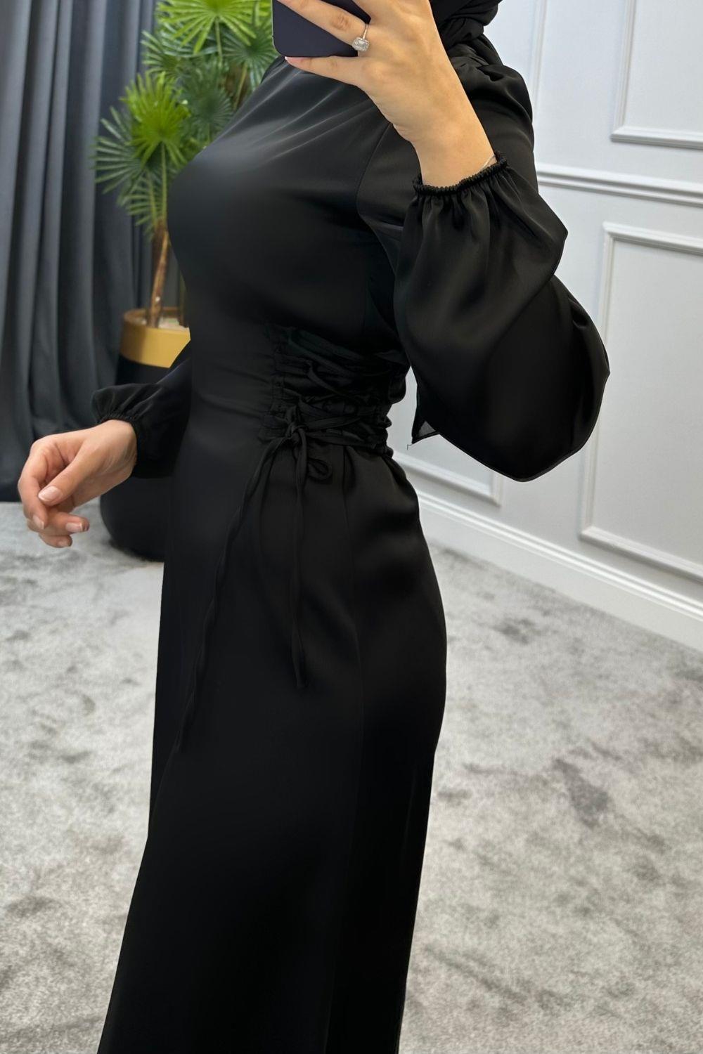 Elenor Belden Bağlamalı Saten Tesettür Elbise Siyah