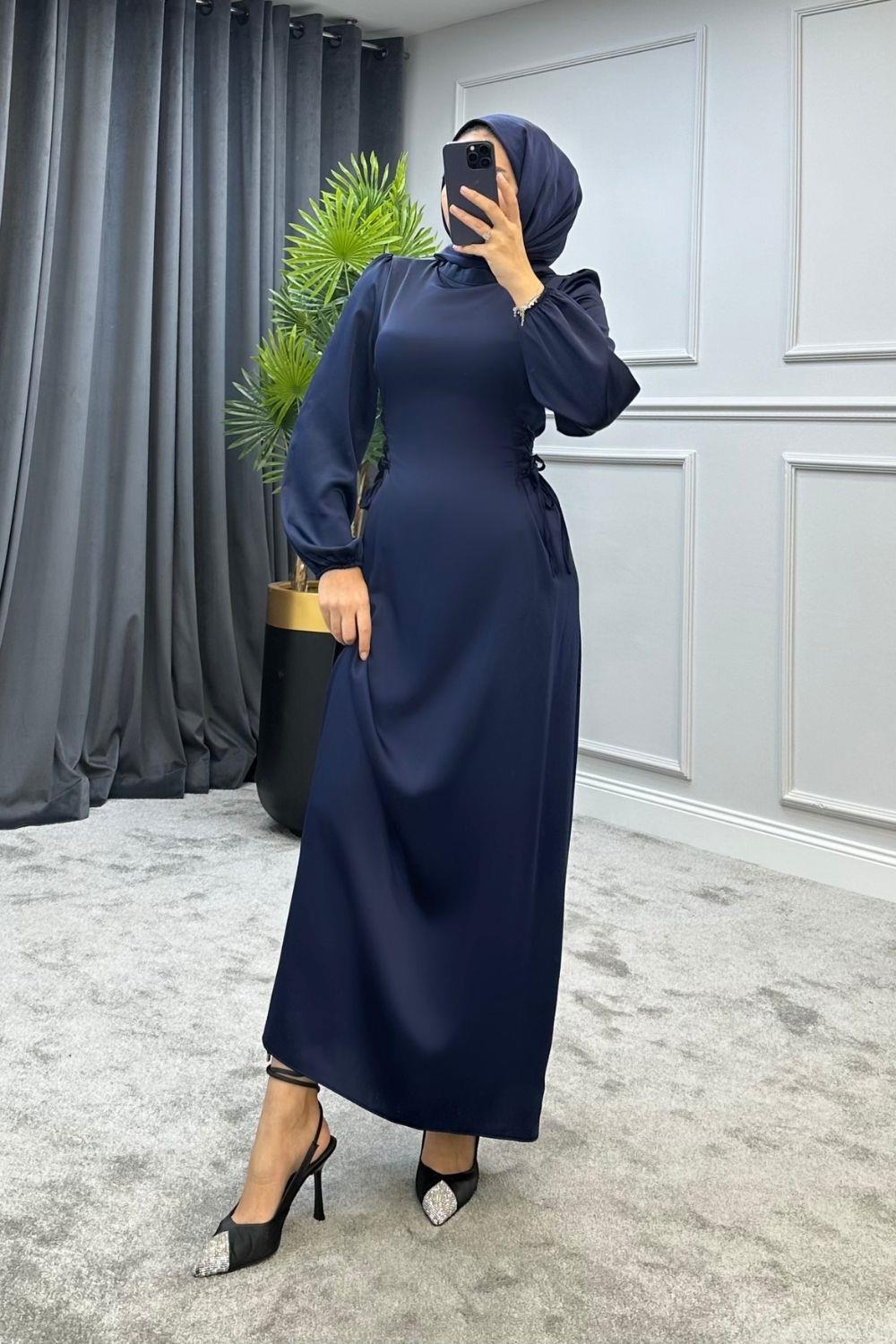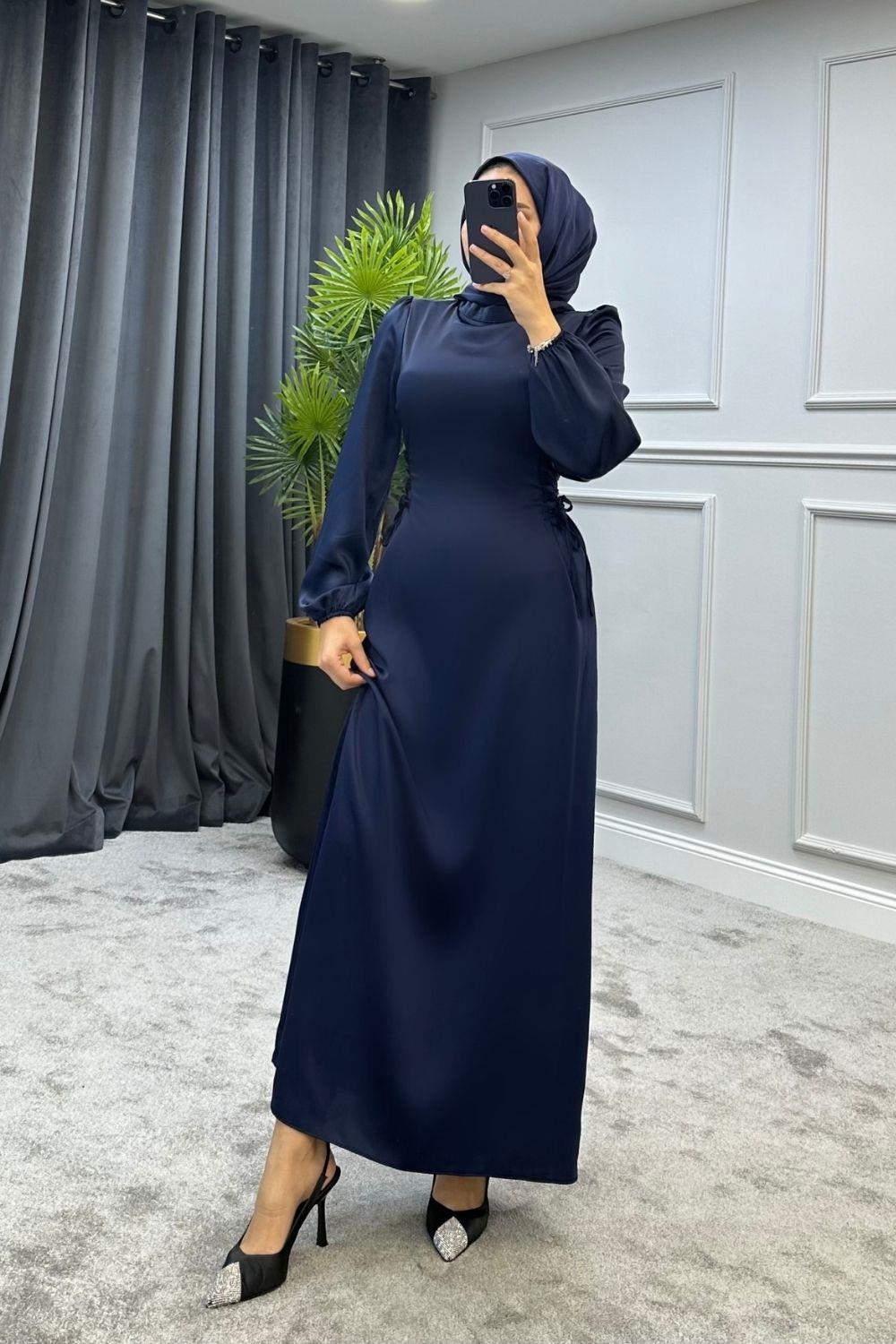 Elenor Belden Bağlamalı Saten Tesettür Elbise Lacivert