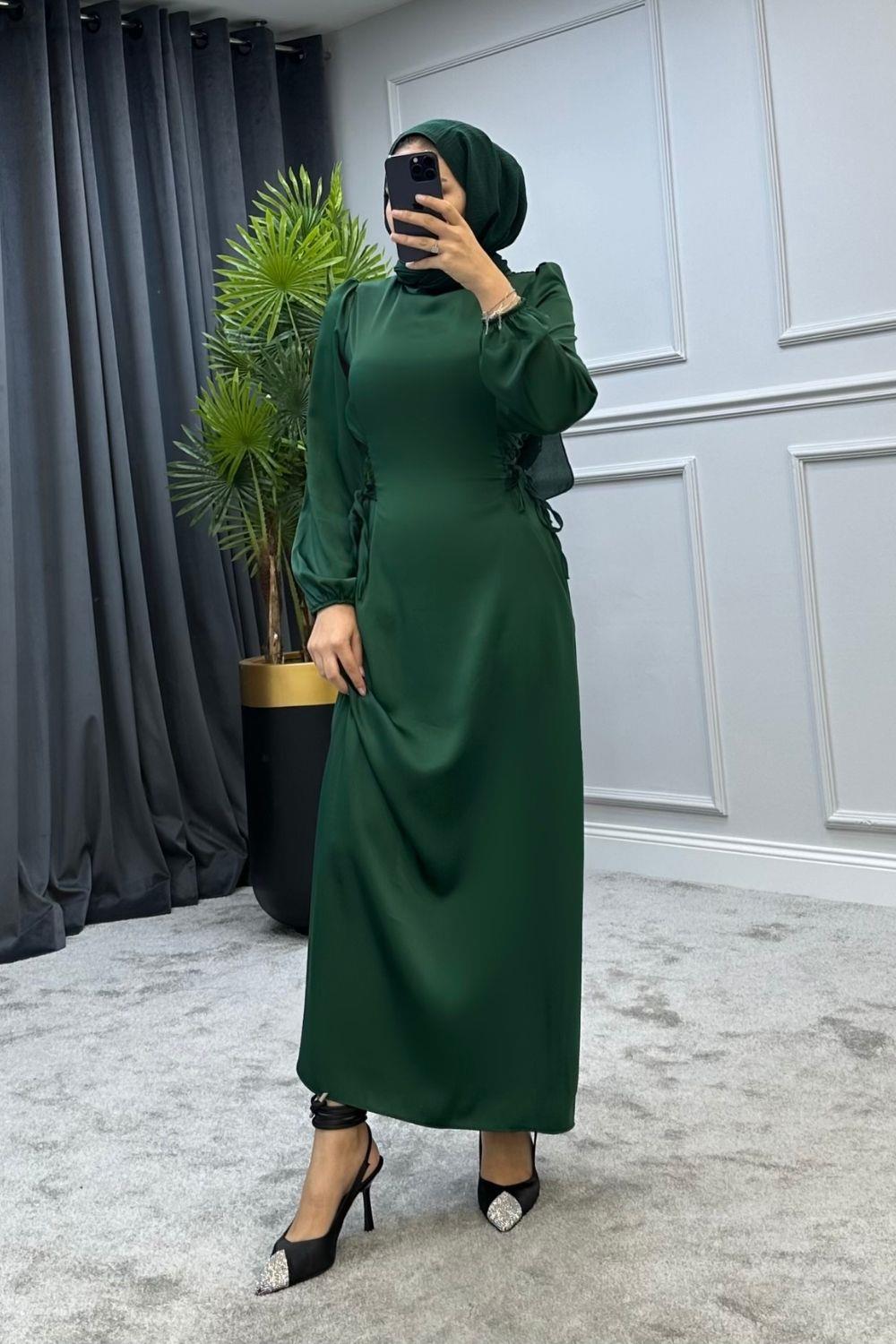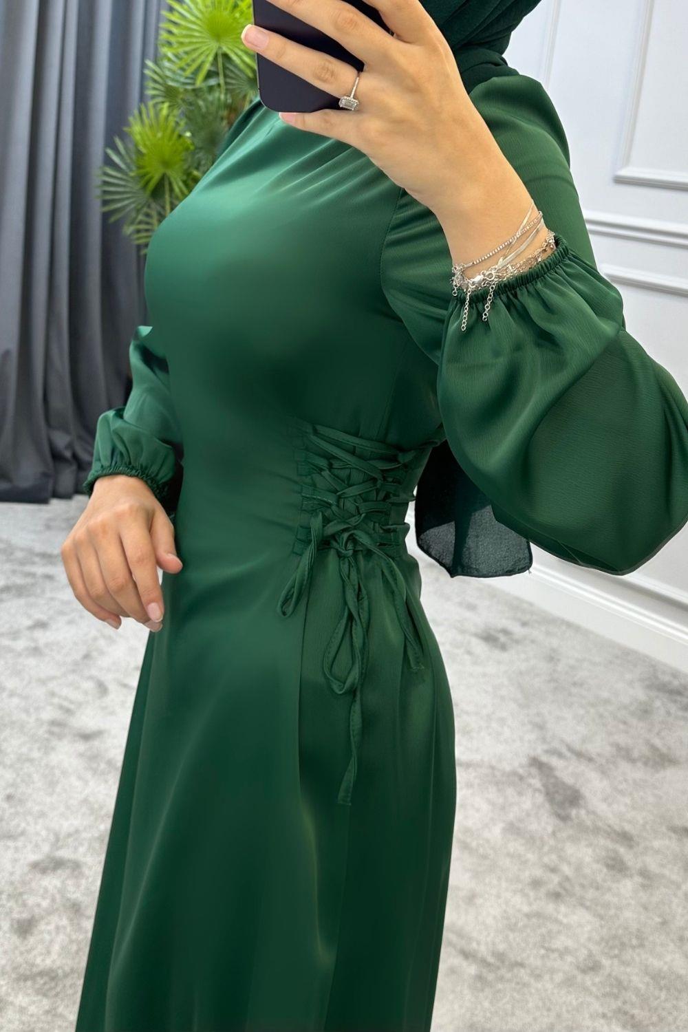 Elenor Belden Bağlamalı Saten Tesettür Elbise Zümrüt