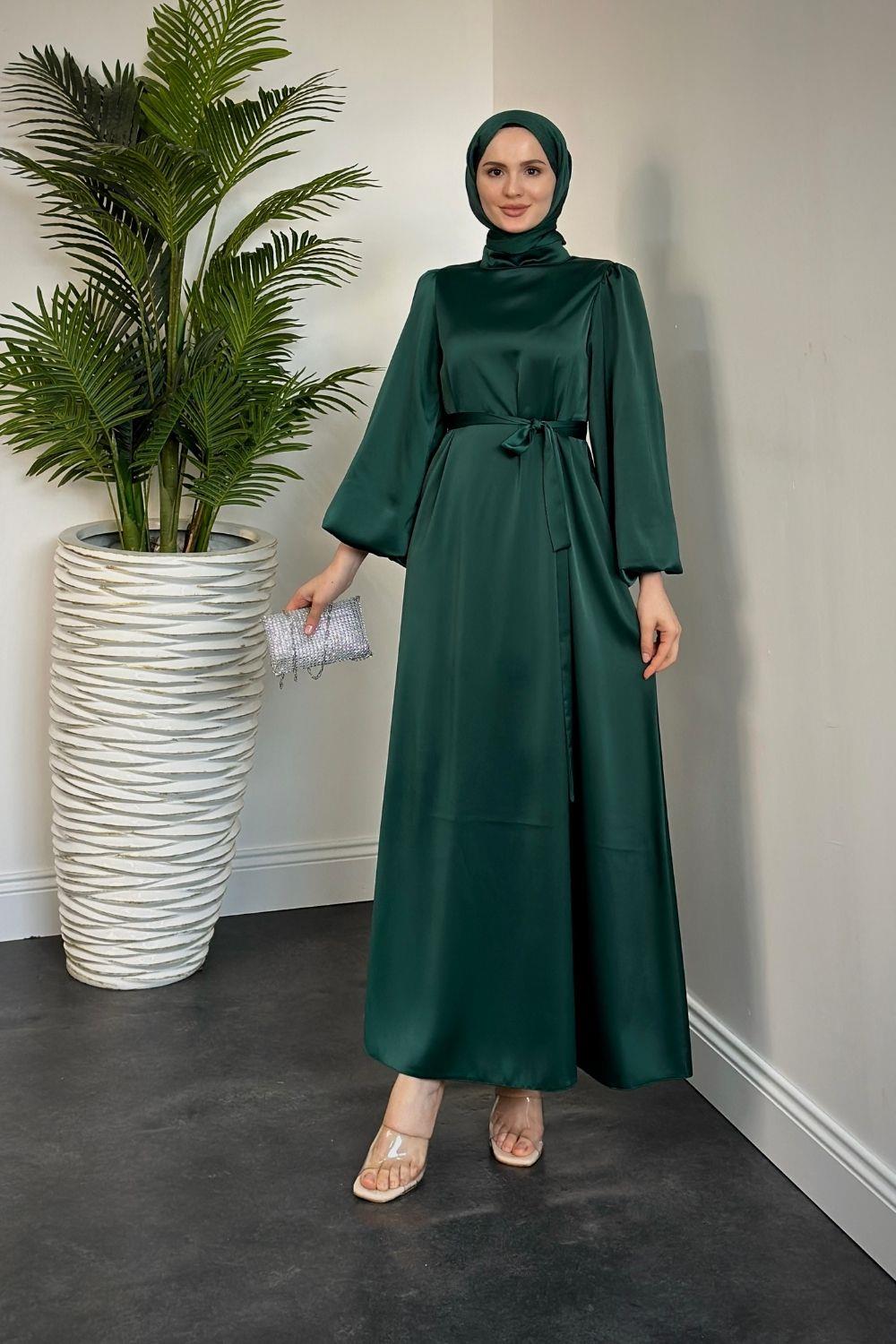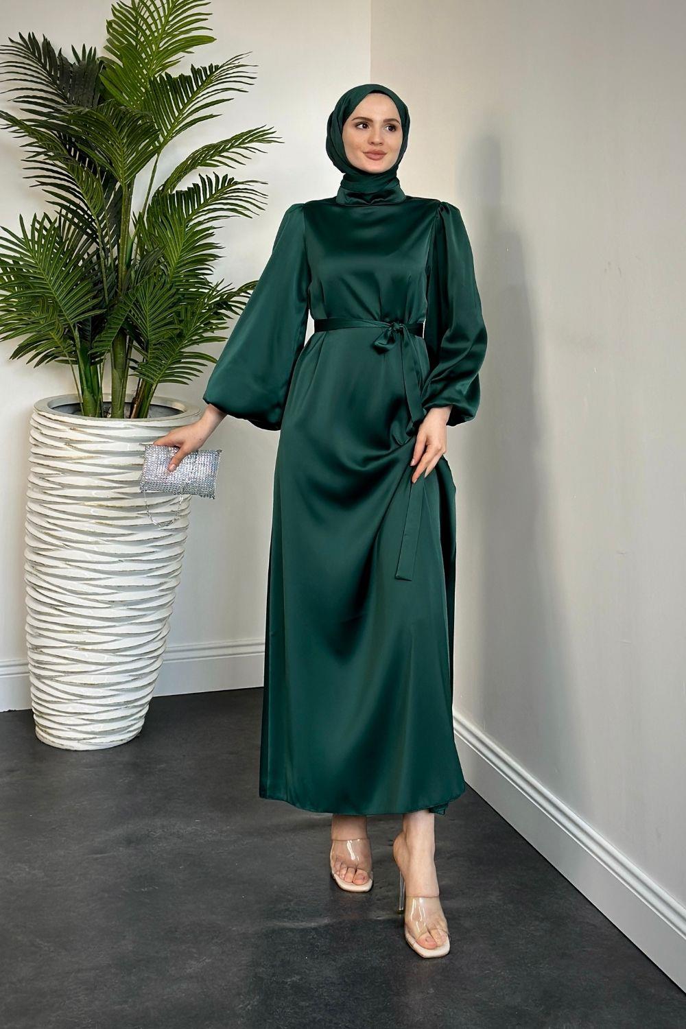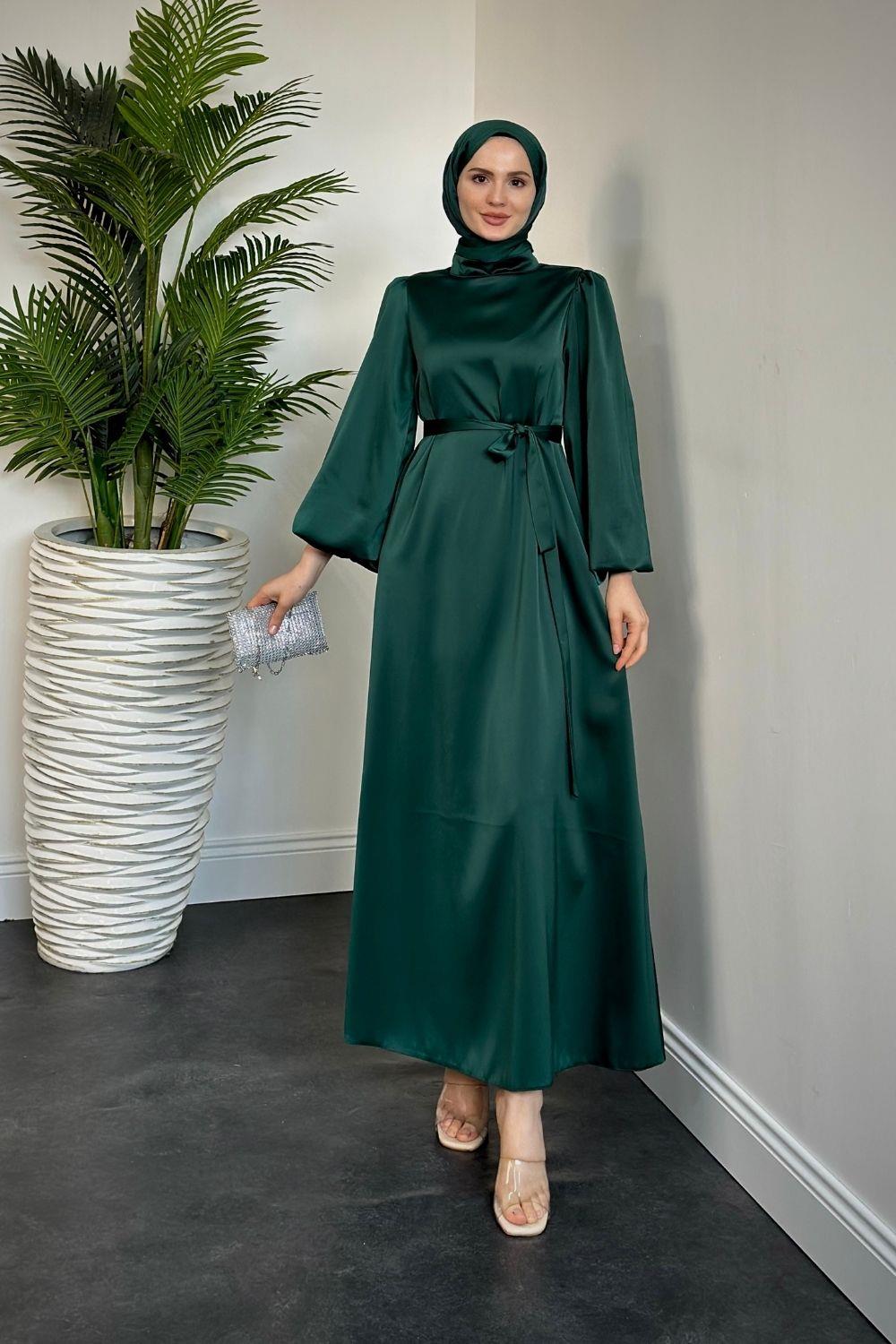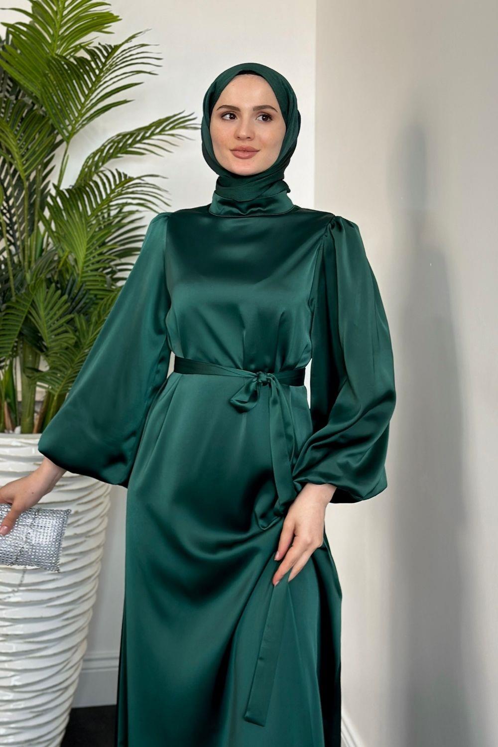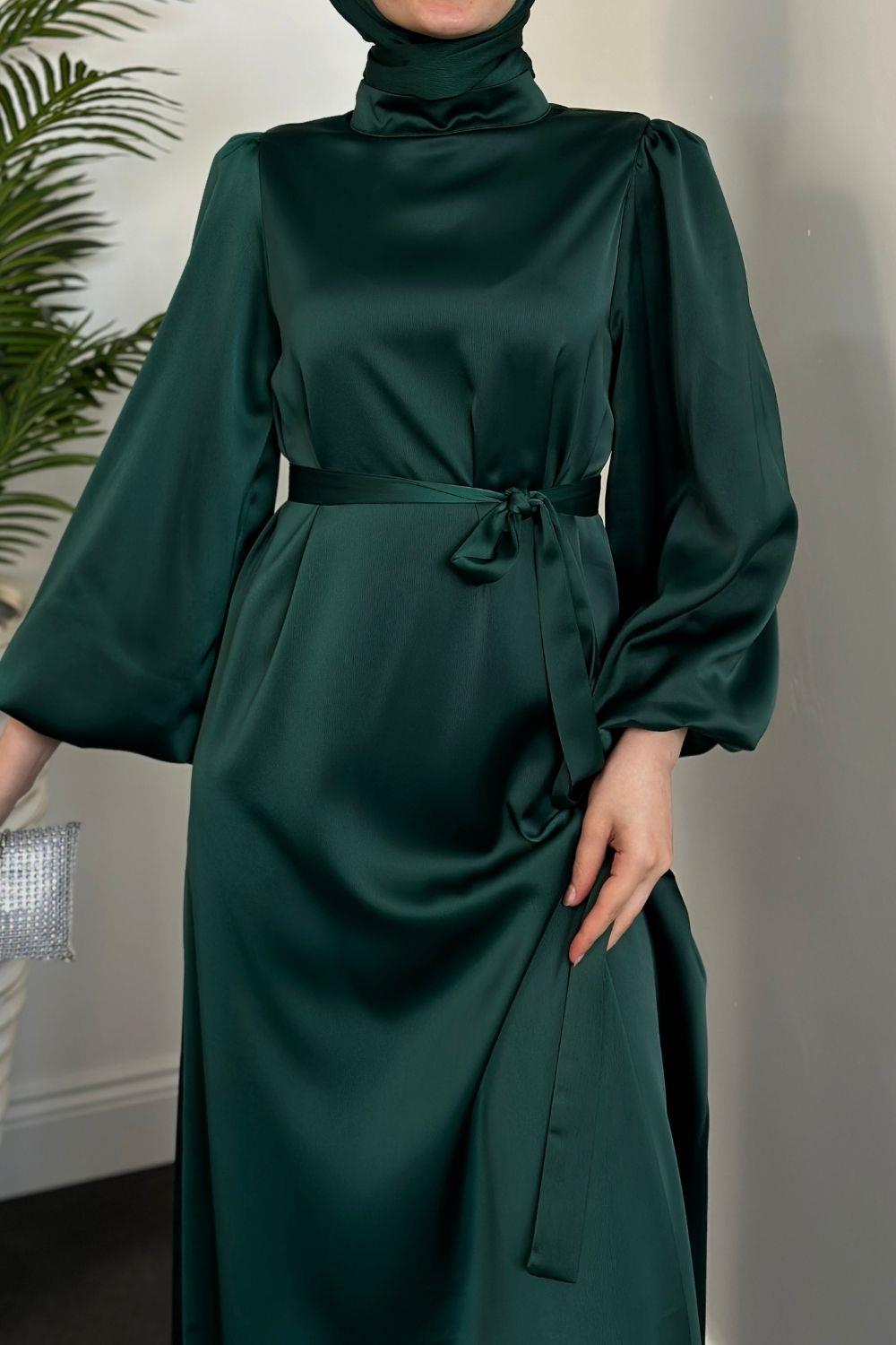 Dimitra Balon Kol Saten Elbise Zümrüt