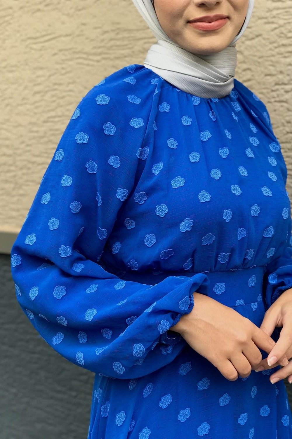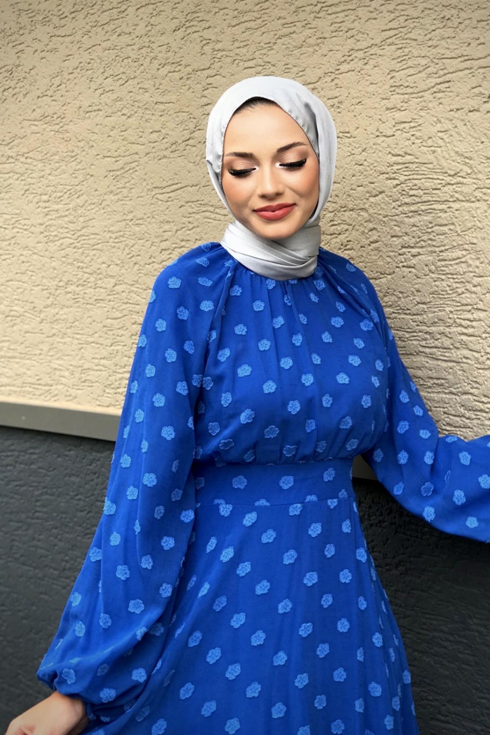 Çiçel İşlemeli Beli Kemerli Elbise Saks
